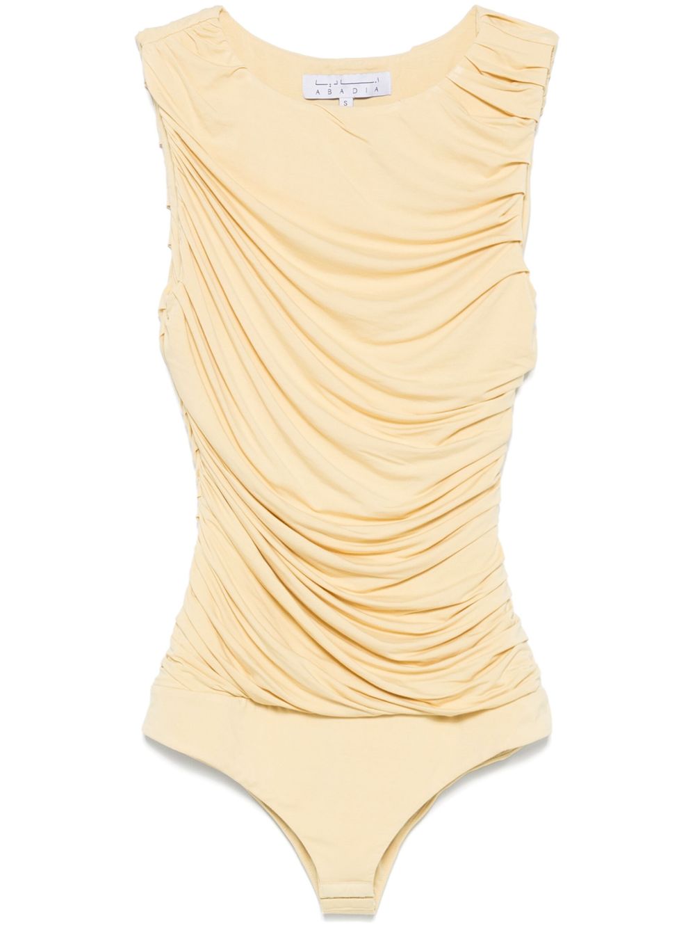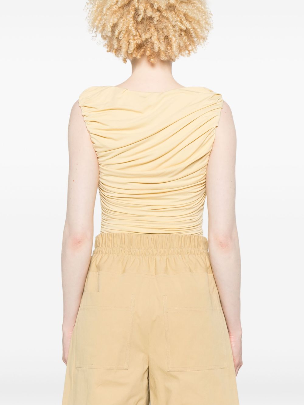 Body Ora di ABADIA gialo pastello in rayon in bambuù, caratterizzato da design drappeggiato, senza maniche e chiusura con bottoni a pressione.