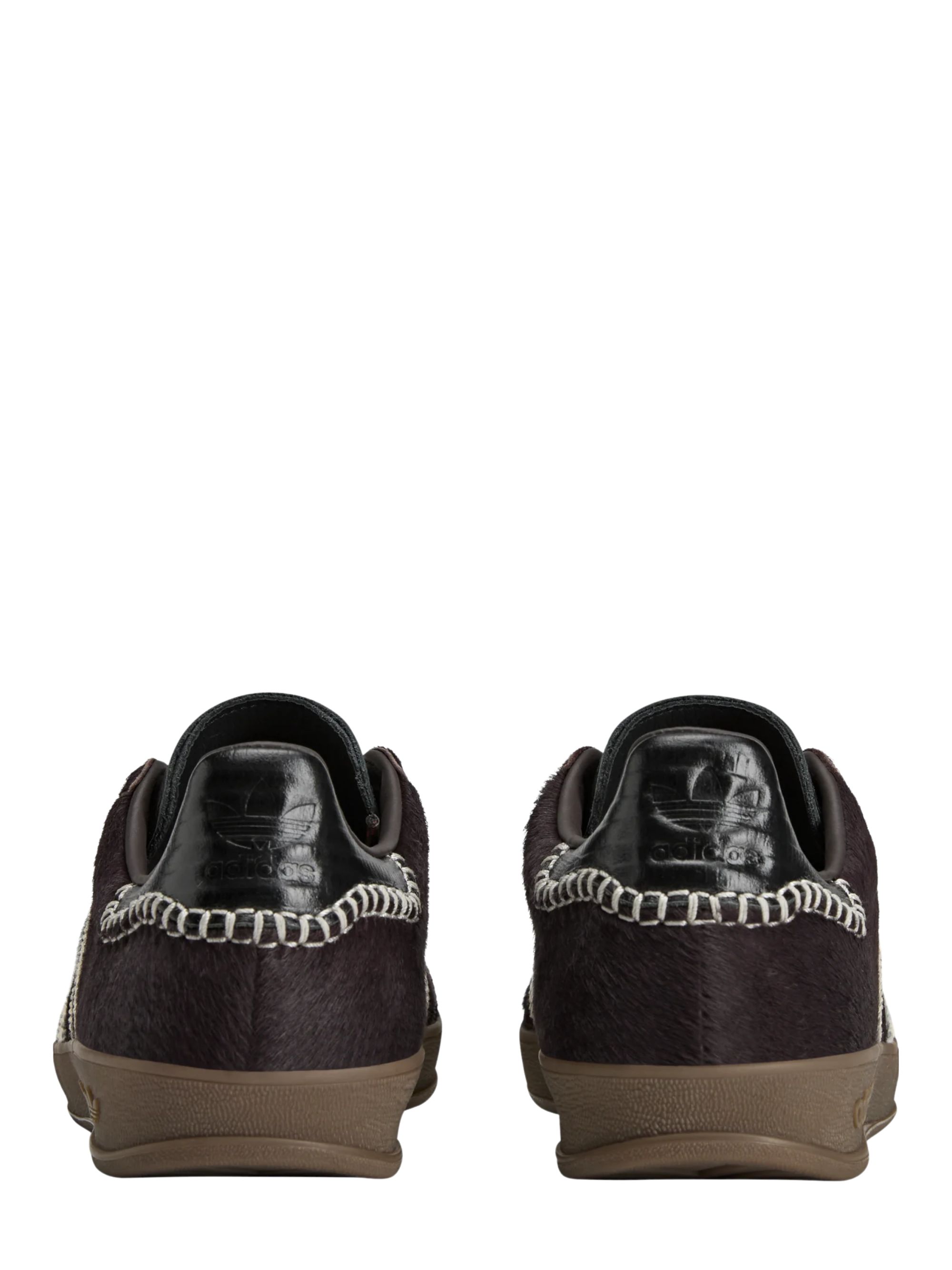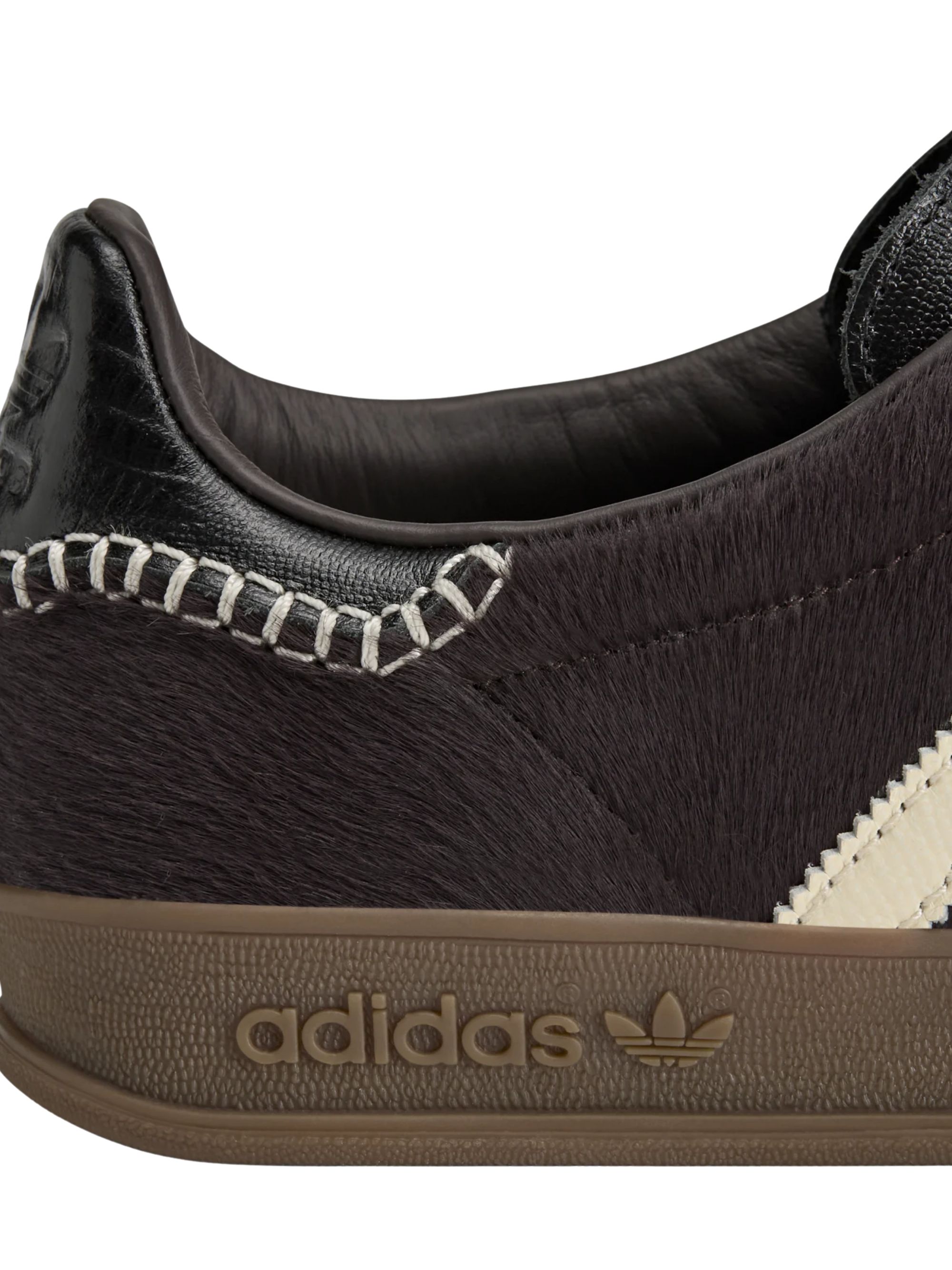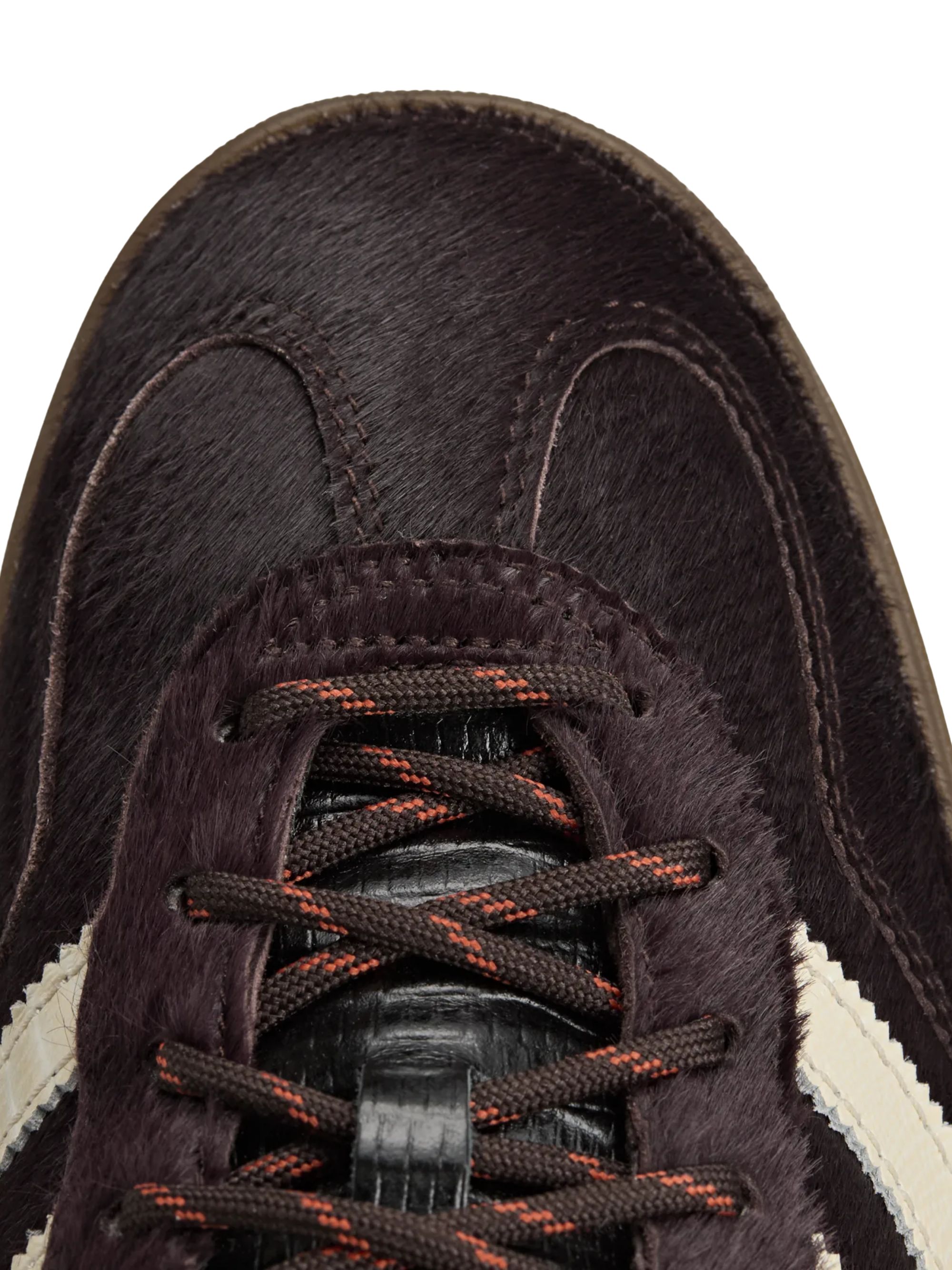 Sneaker Gazelle Pony di ADIDAS BY WALES BONNER marrone in cavallino con dettagli in pelle bianca e nera, cuciture a contrasto e suola in gomma marrone.