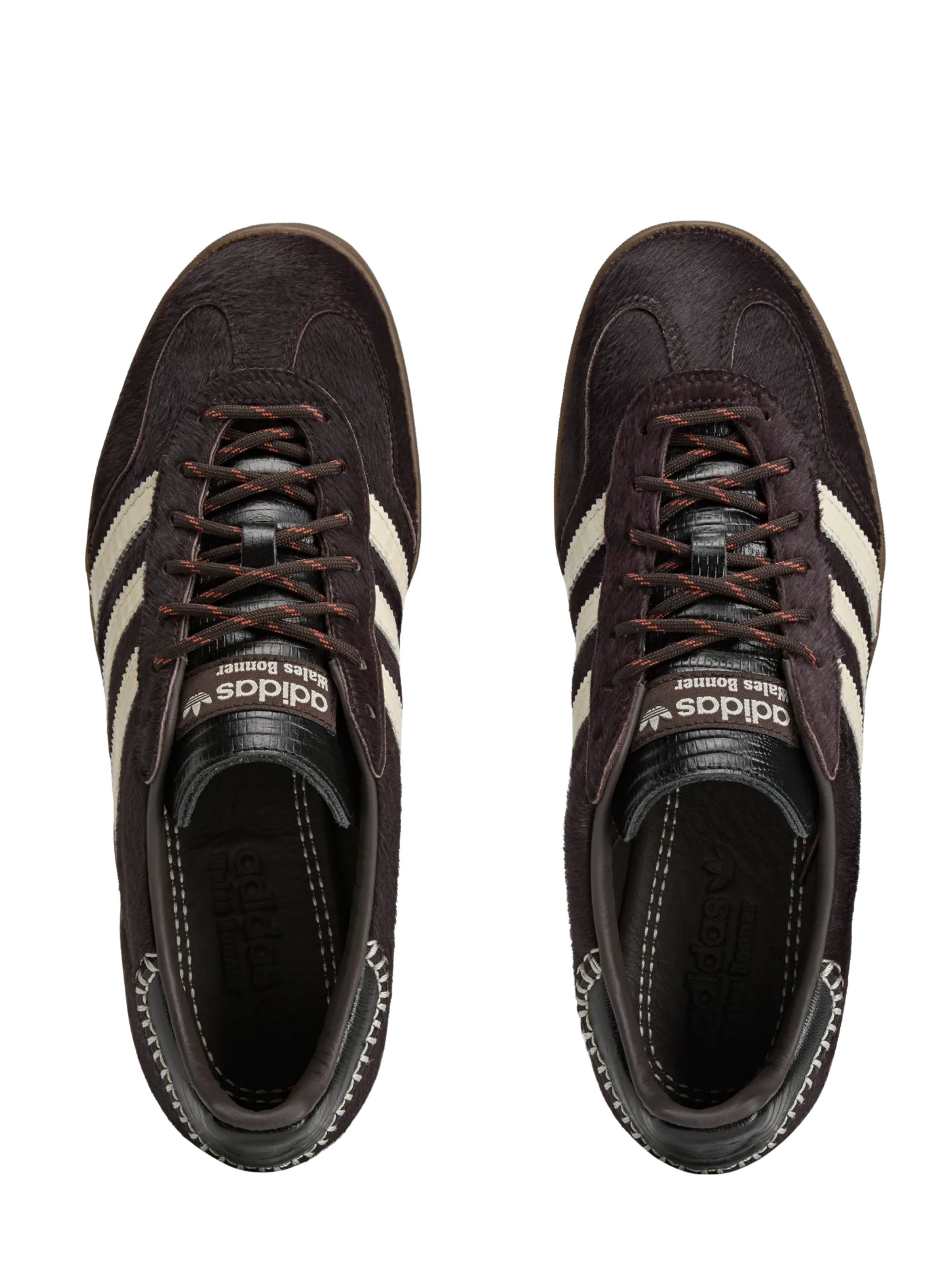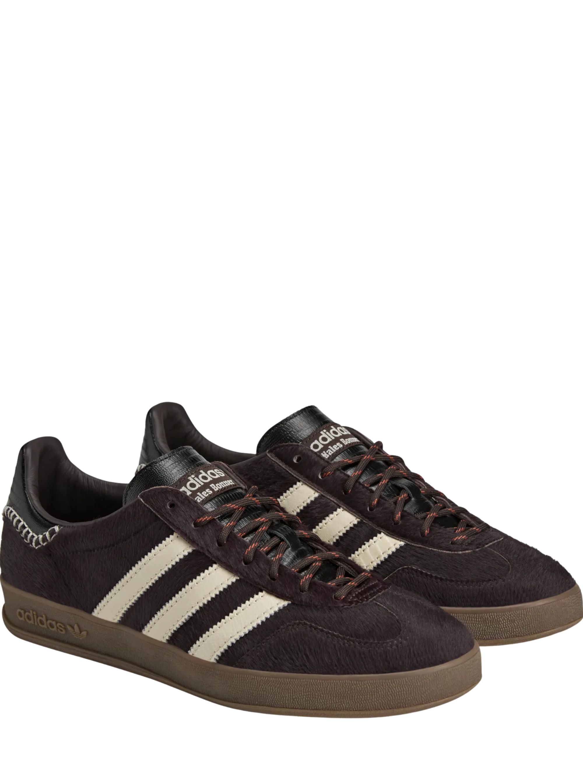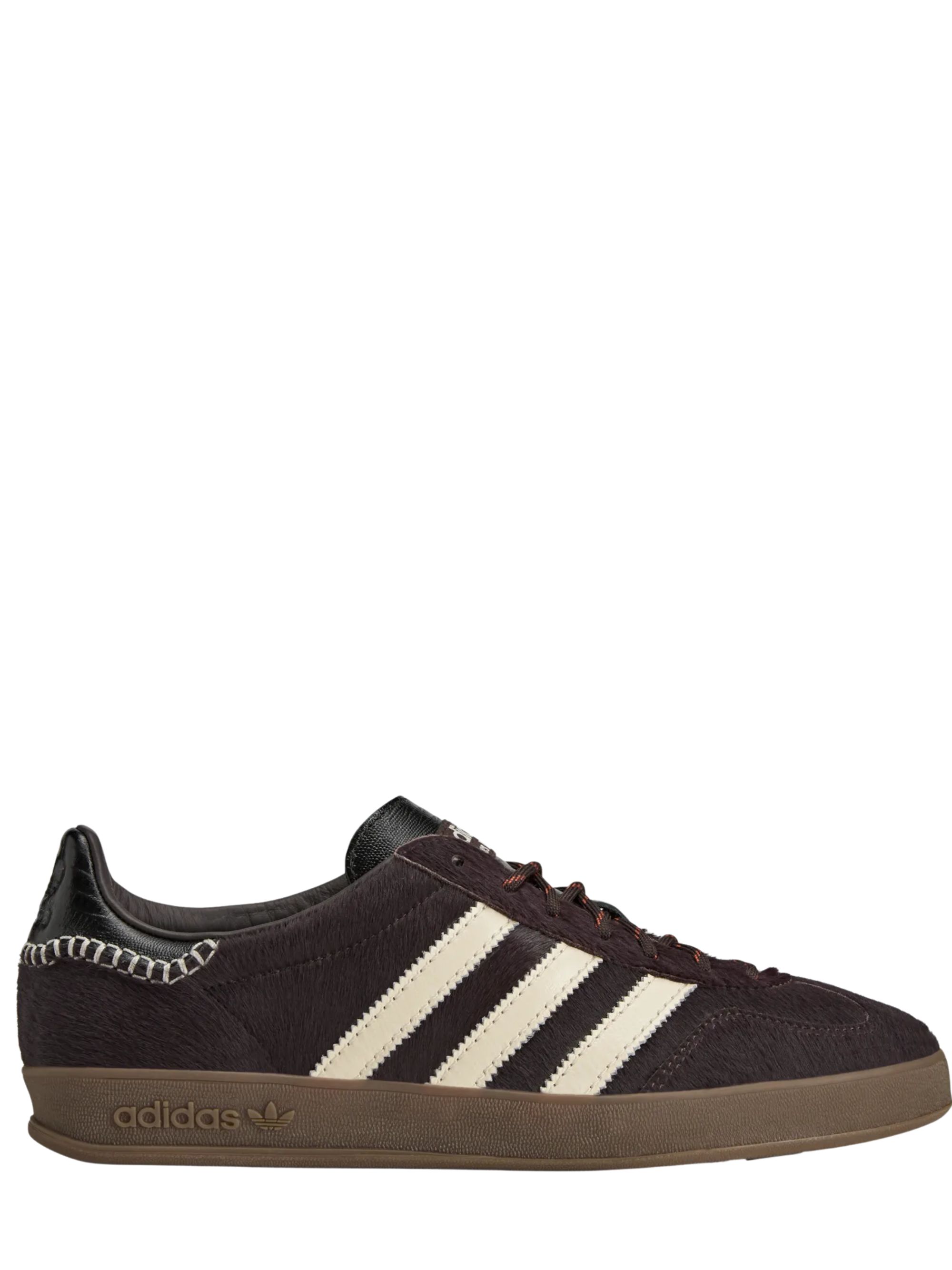 Sneaker Gazelle Pony di ADIDAS BY WALES BONNER marrone in cavallino con dettagli in pelle bianca e nera, cuciture a contrasto e suola in gomma marrone.
