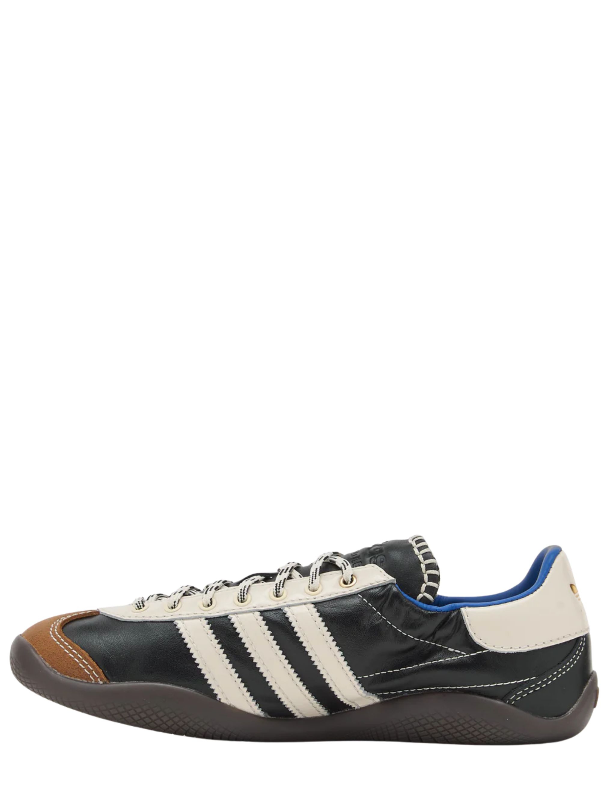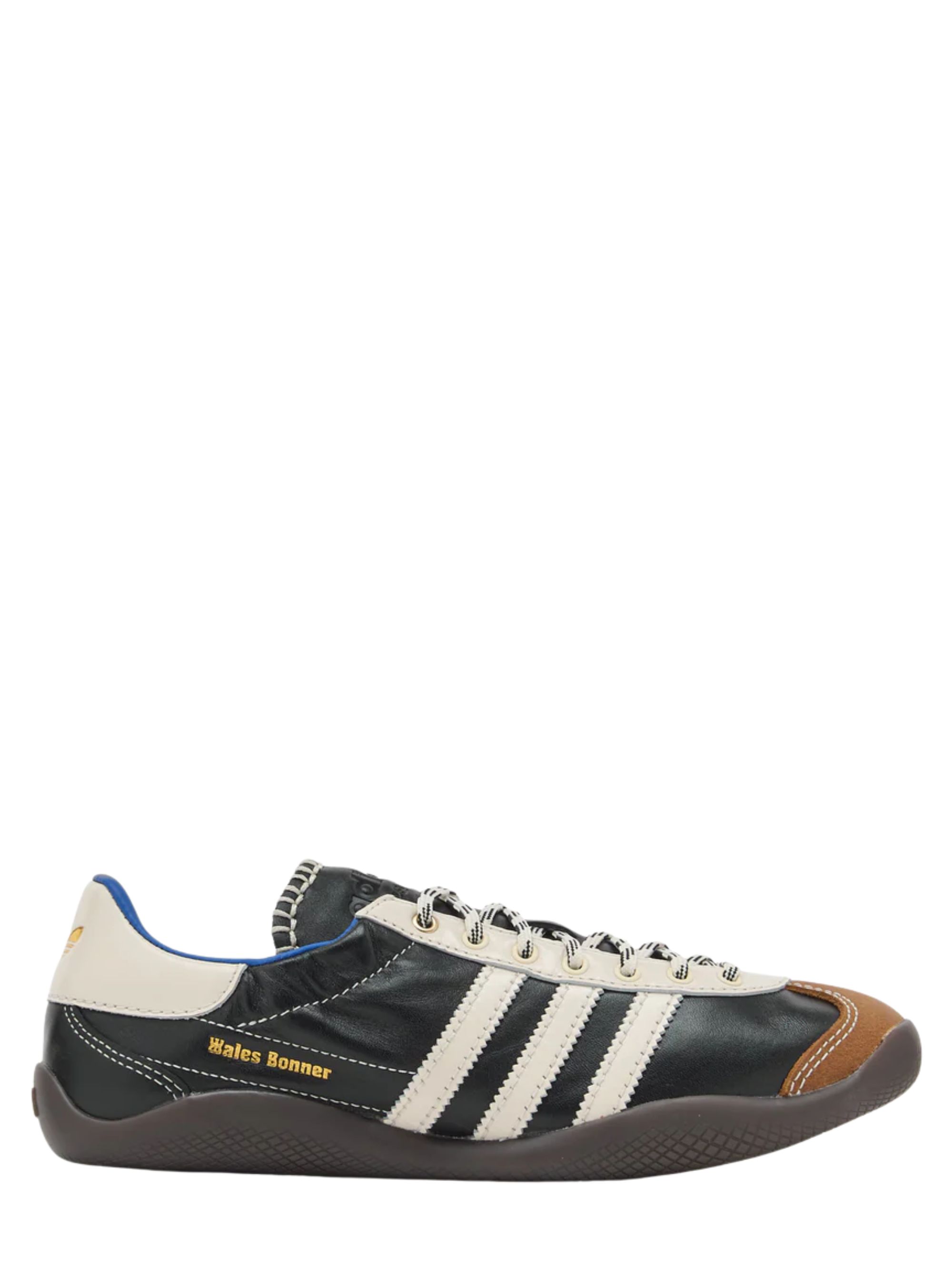 Sneaker Karintha di ADIDAS BY WALES BONNER nera in pelle con dettagli bianchi e marroni scamosciati e suola in gomma marrone.