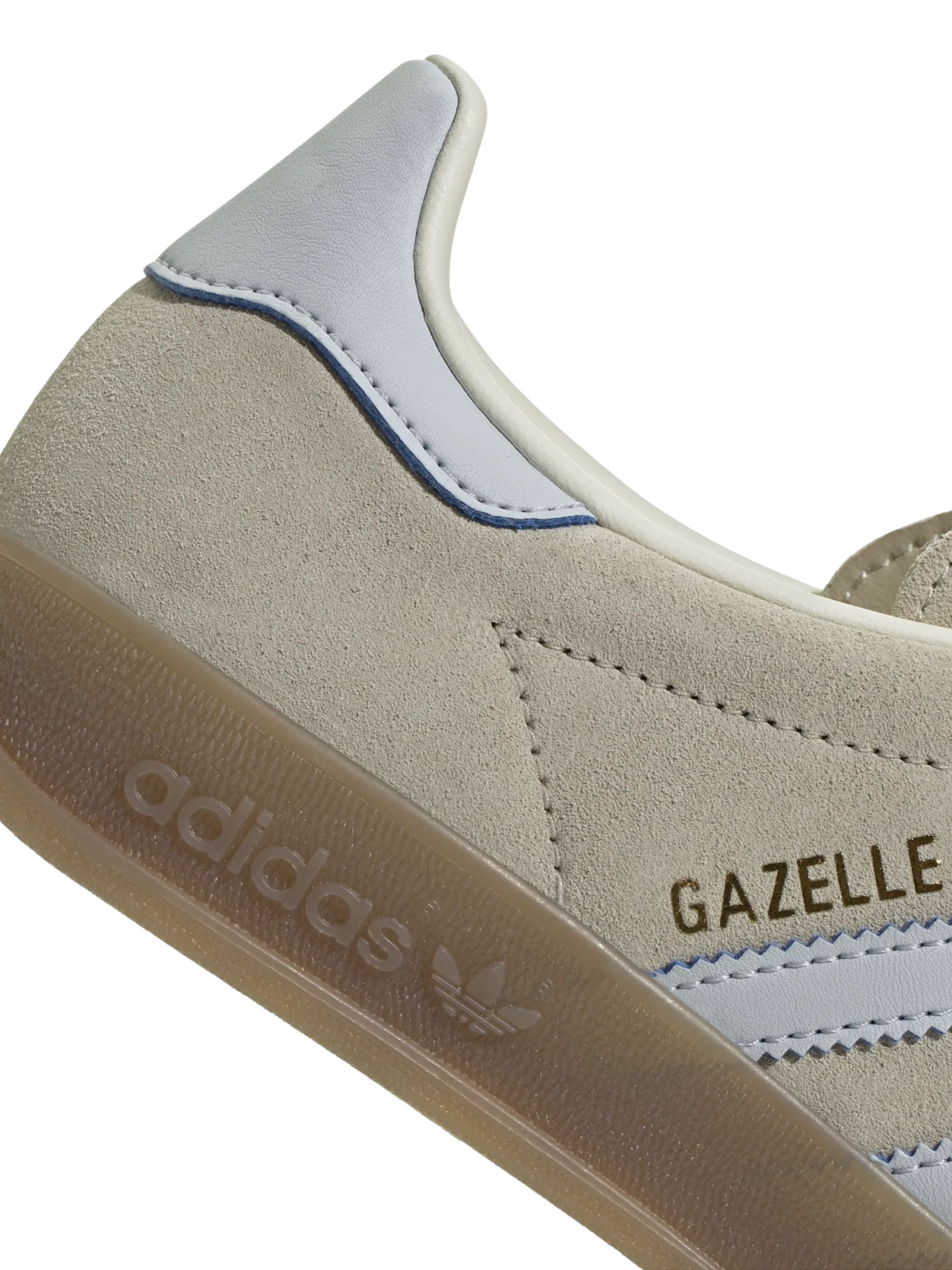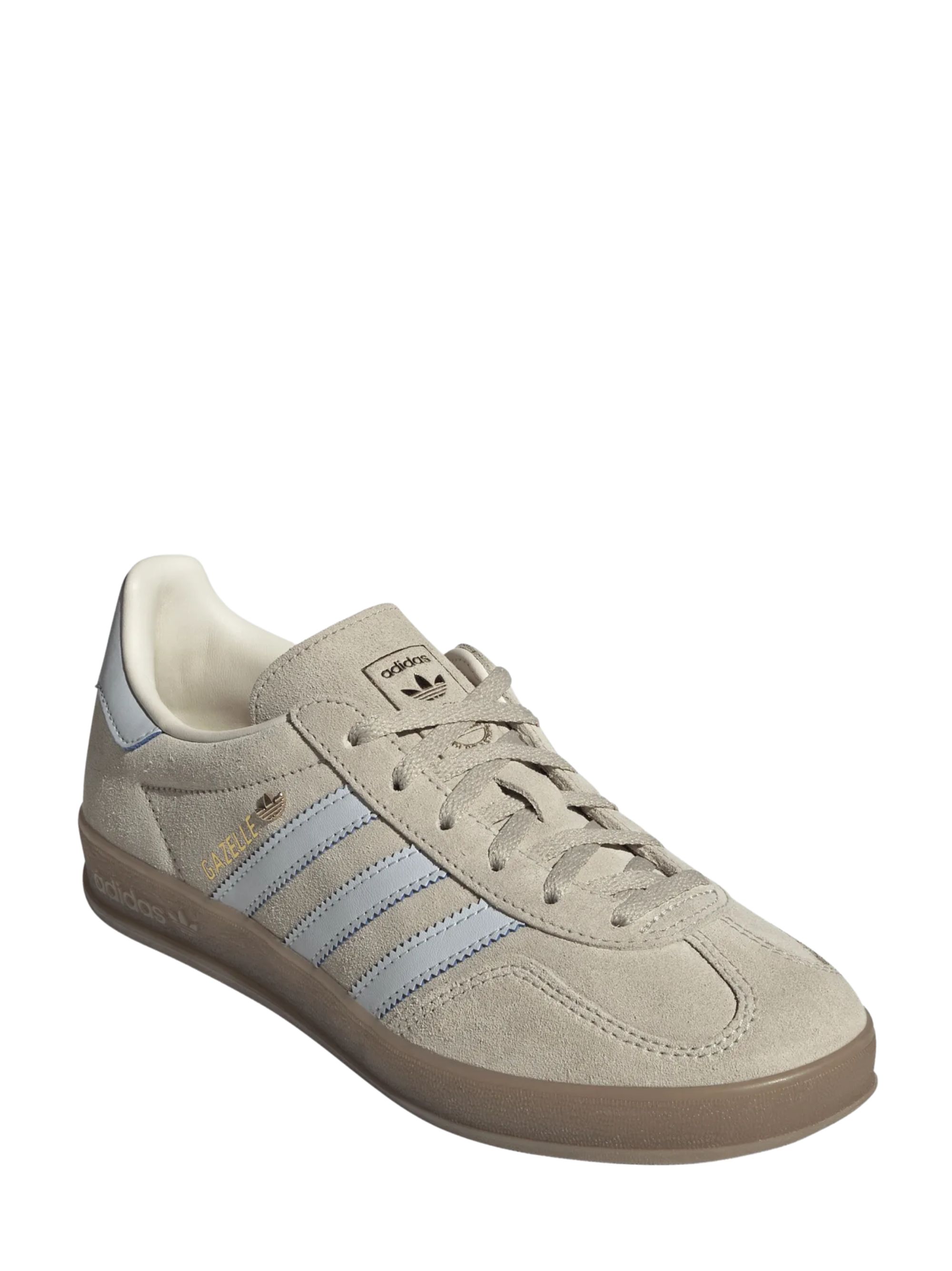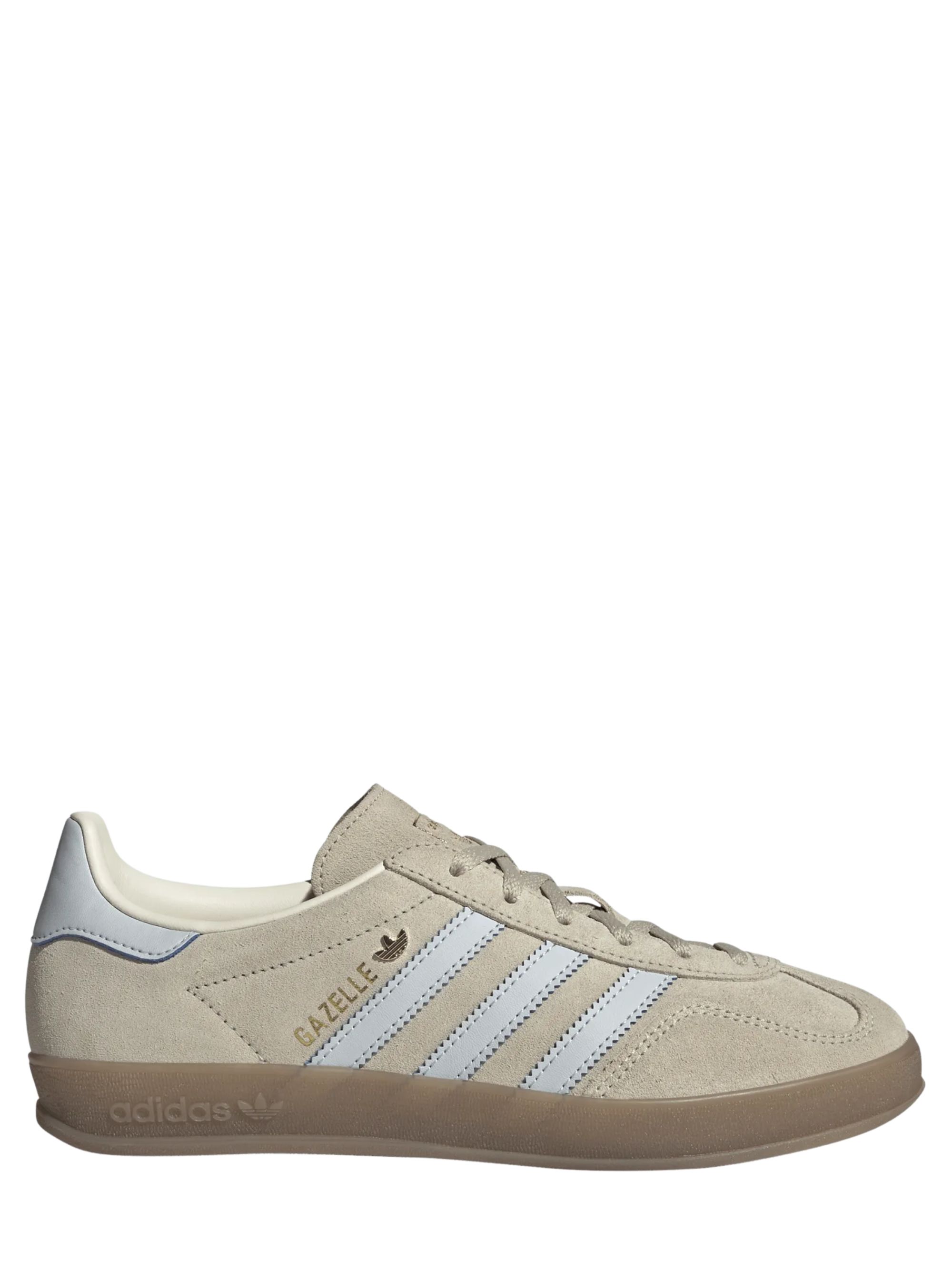 Sneaker gazelle indoor di ADIDAS beige con strisce e talloniera bianche, chiusura con lacci e suola in gomma.