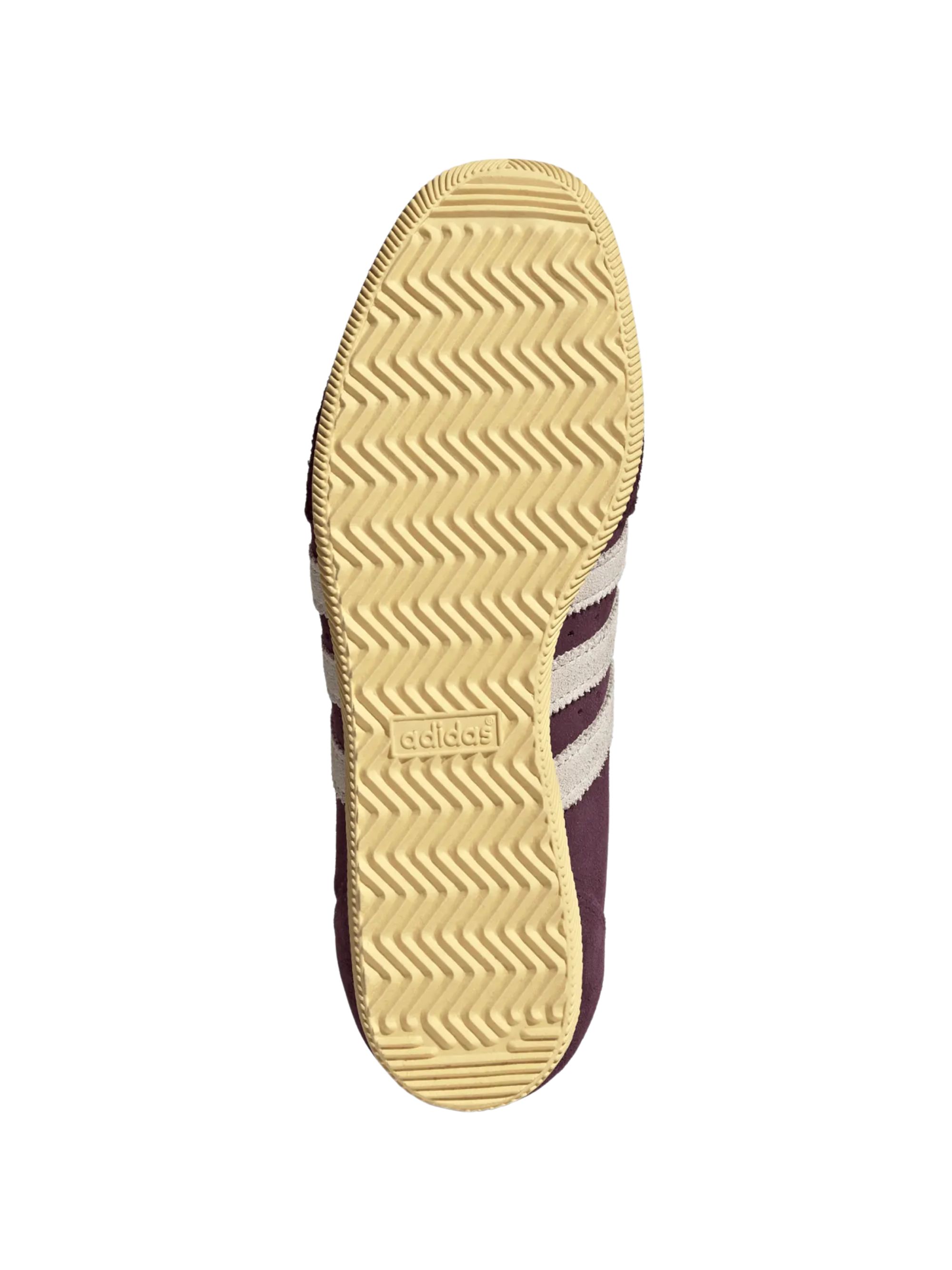 Sneaker Japan di ADIDAS viola in suede con strisce e talloniera beige, chiusura con lacci, logo dorato e suola in gomma.