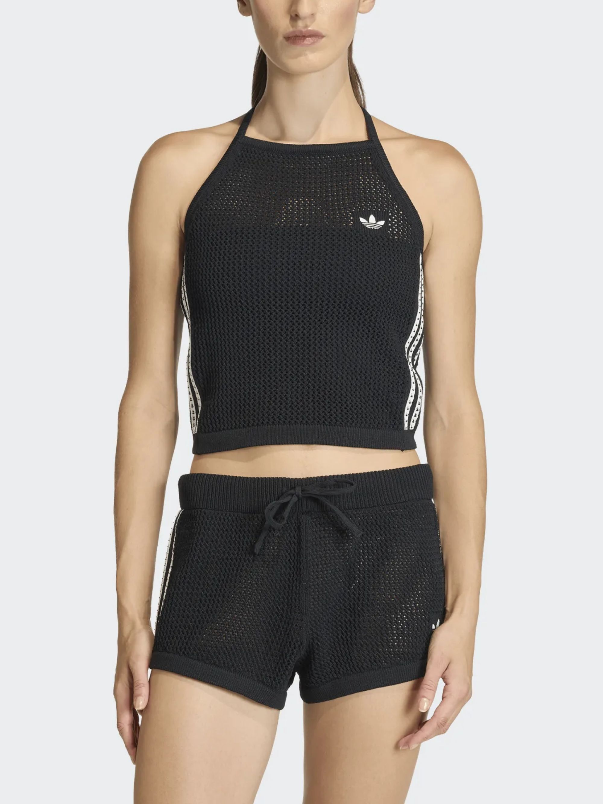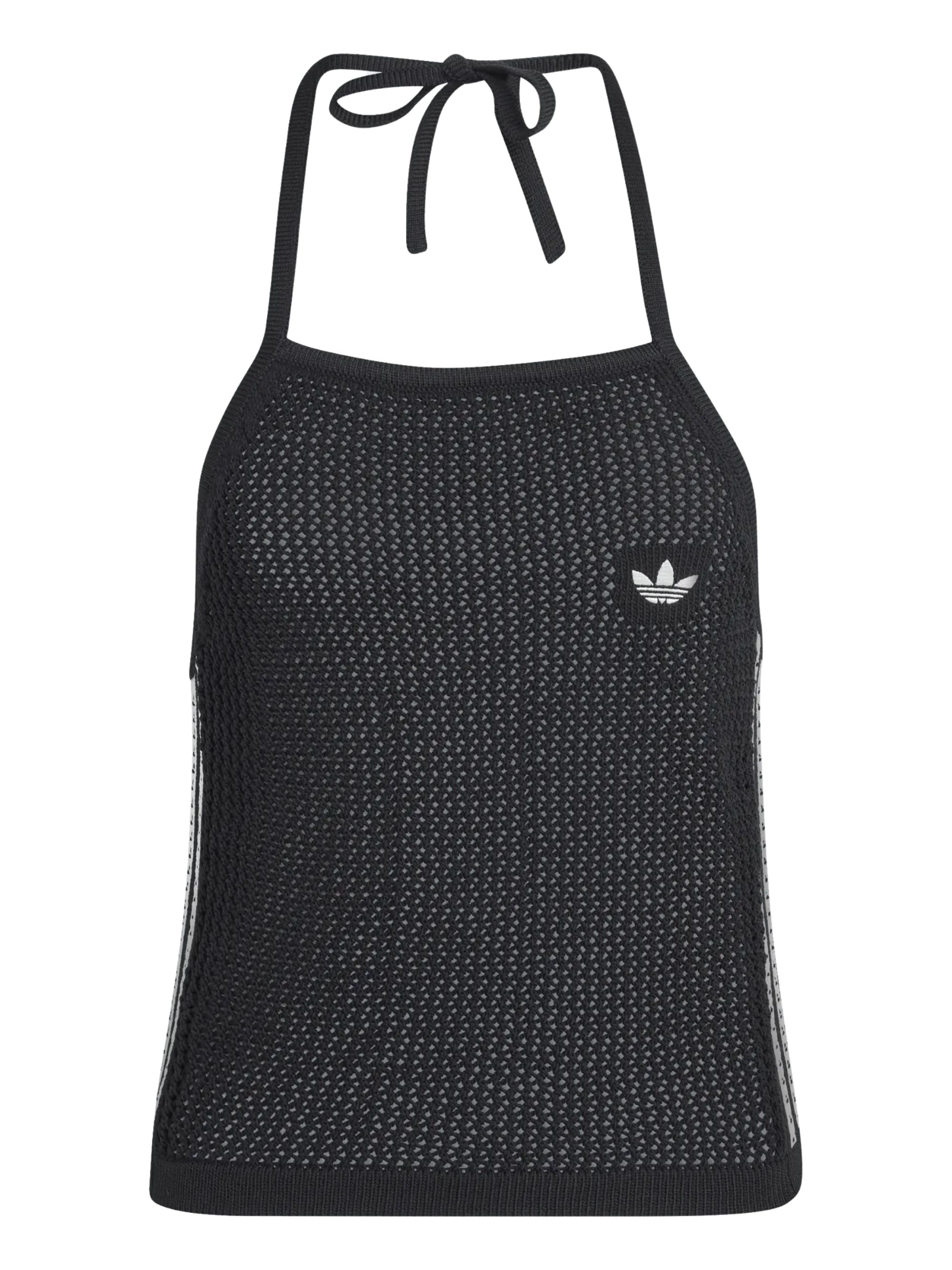 Top con logo di ADIDAS nero a maglia, caratterizzato da vestibilità slim, collo rotondo, logo sul fronte e chiusura con laccio.