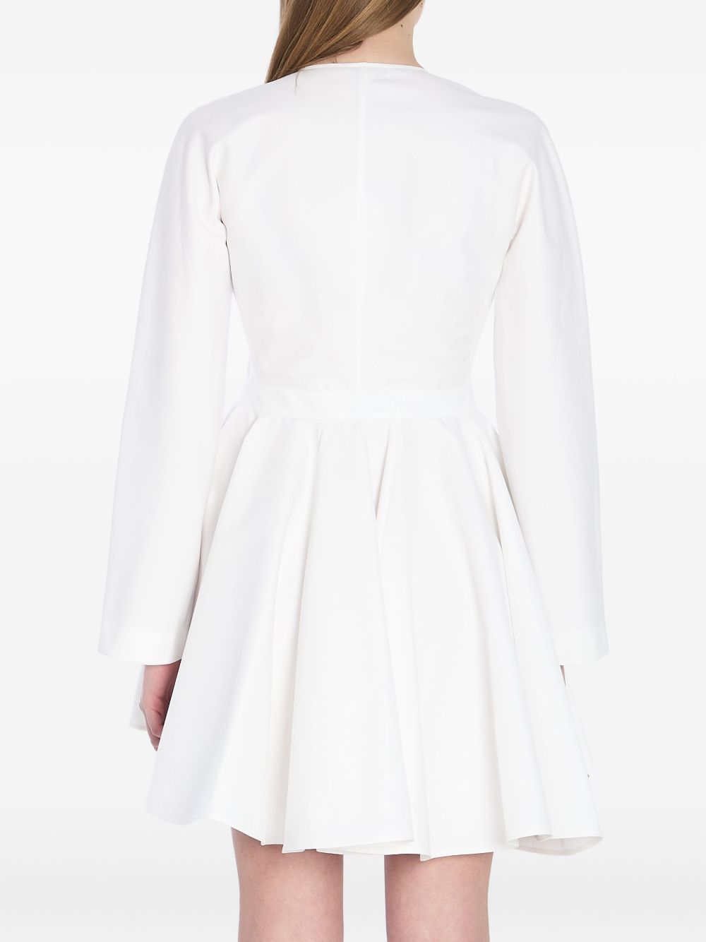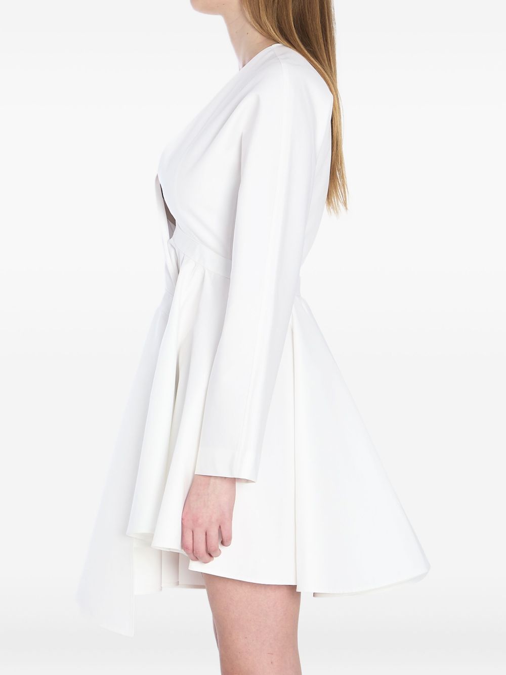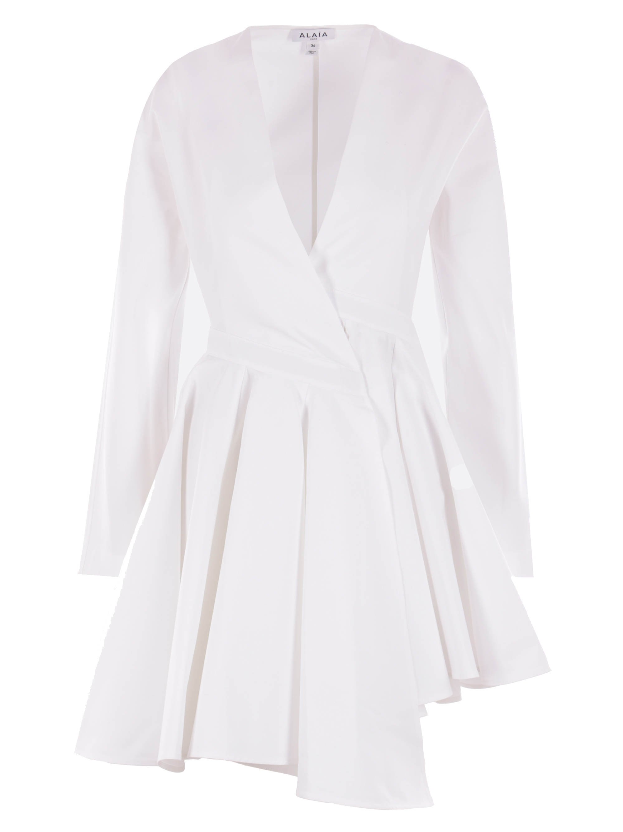 Abito asimmetrico con cintura di ALAIA bianco in popeline di cotone con scollatura a V, tasche invisibili ai lati, fondo asimmetrico e cintura a spirale integrata e chiusura con zip.