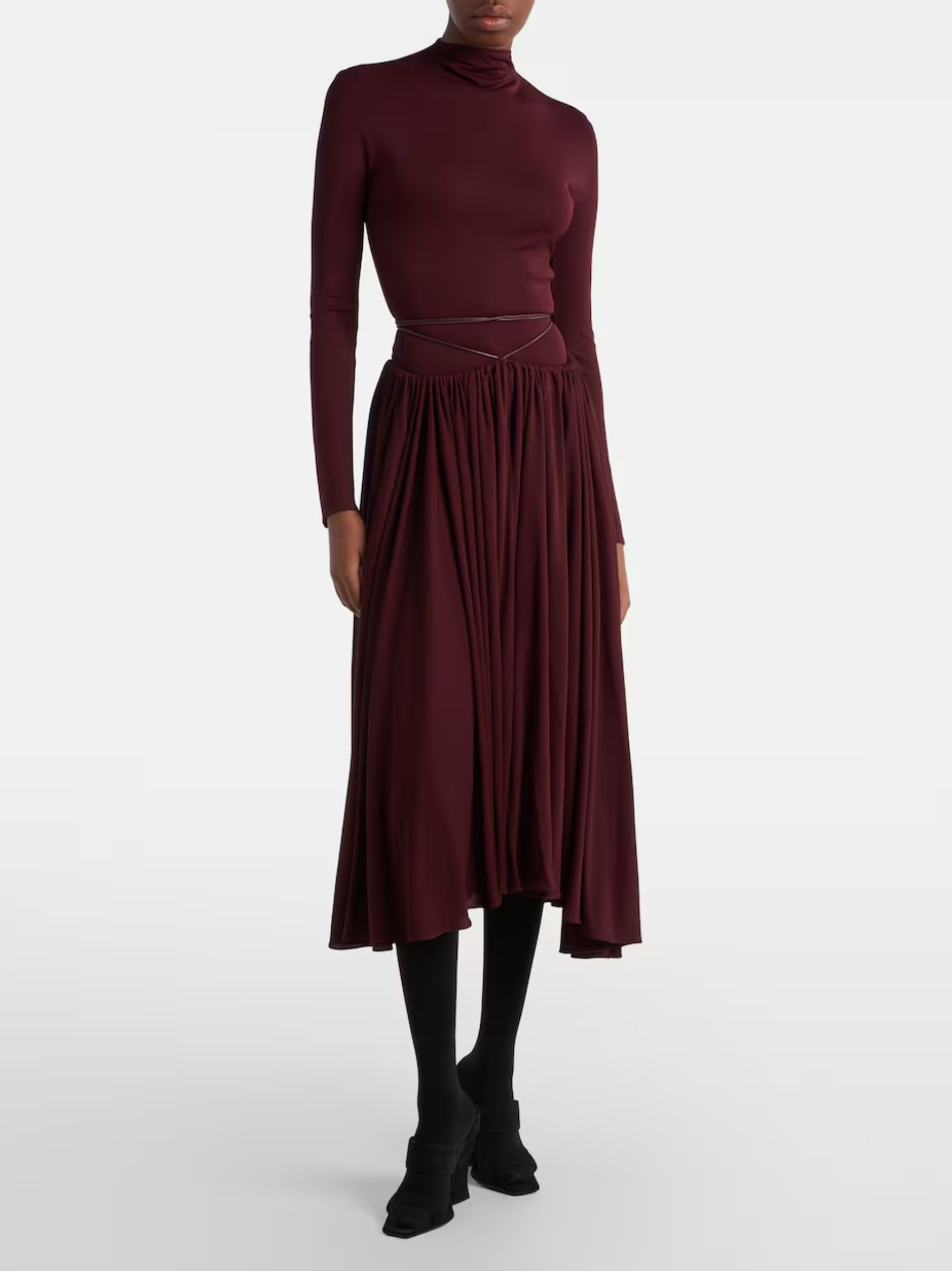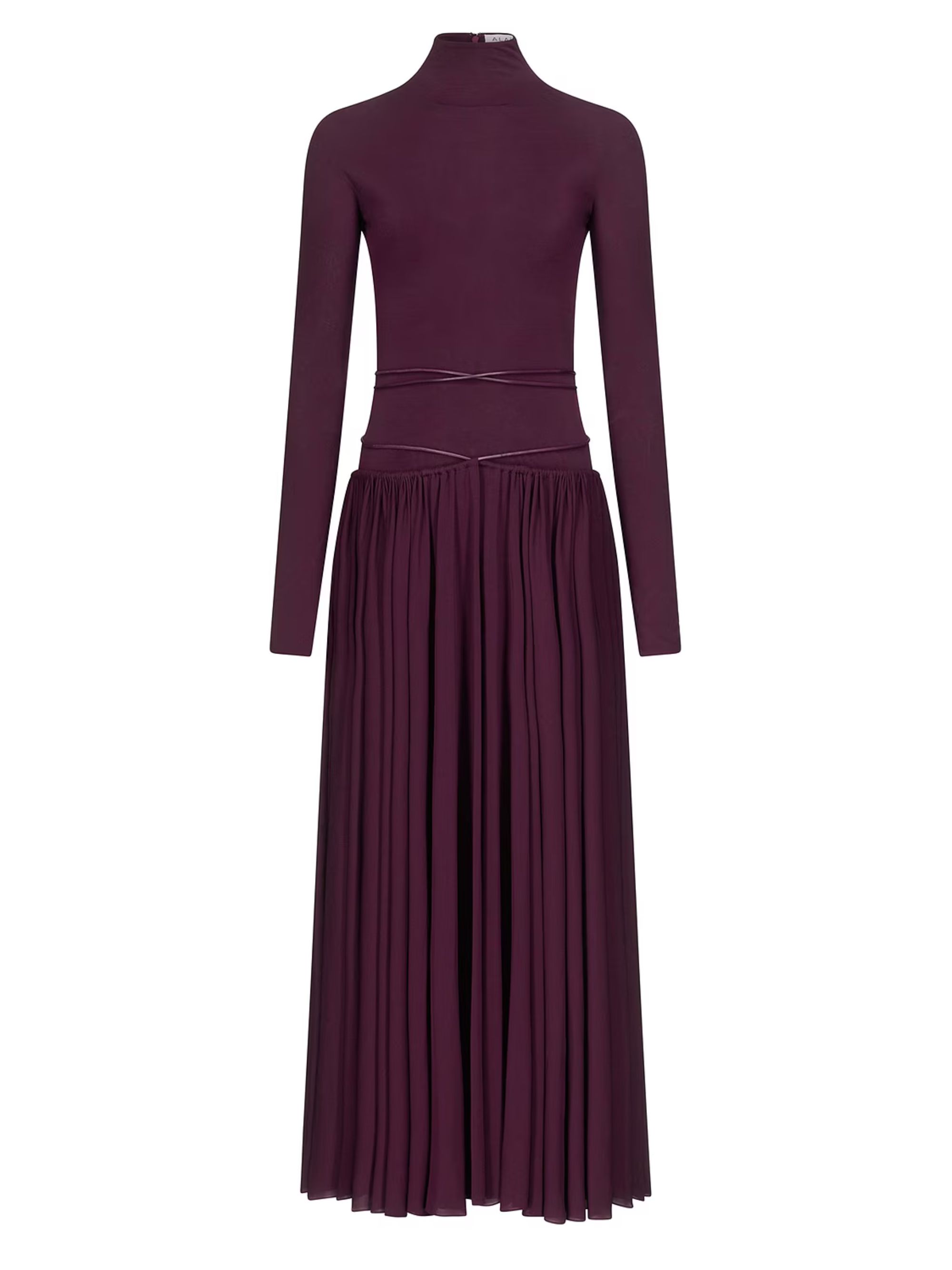 Abito lungo di ALAIA color prugna in jersey caratterizzatto da colletto alto, gonna plissettata e silhouette aderente.