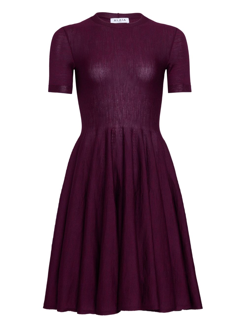 Abito Skater di ALAIA bordeaux in maglia di lana merino con maniche corte, girocollo e cucitura sul retro.