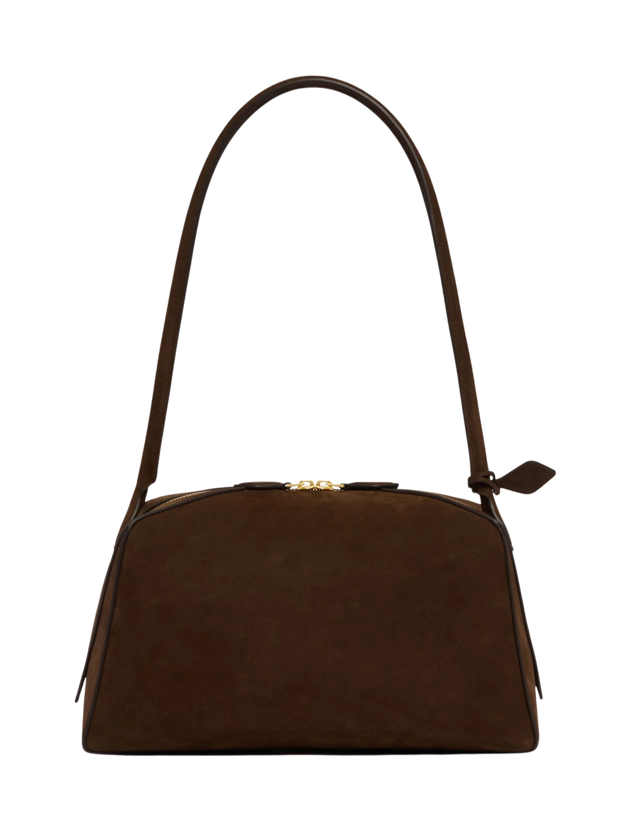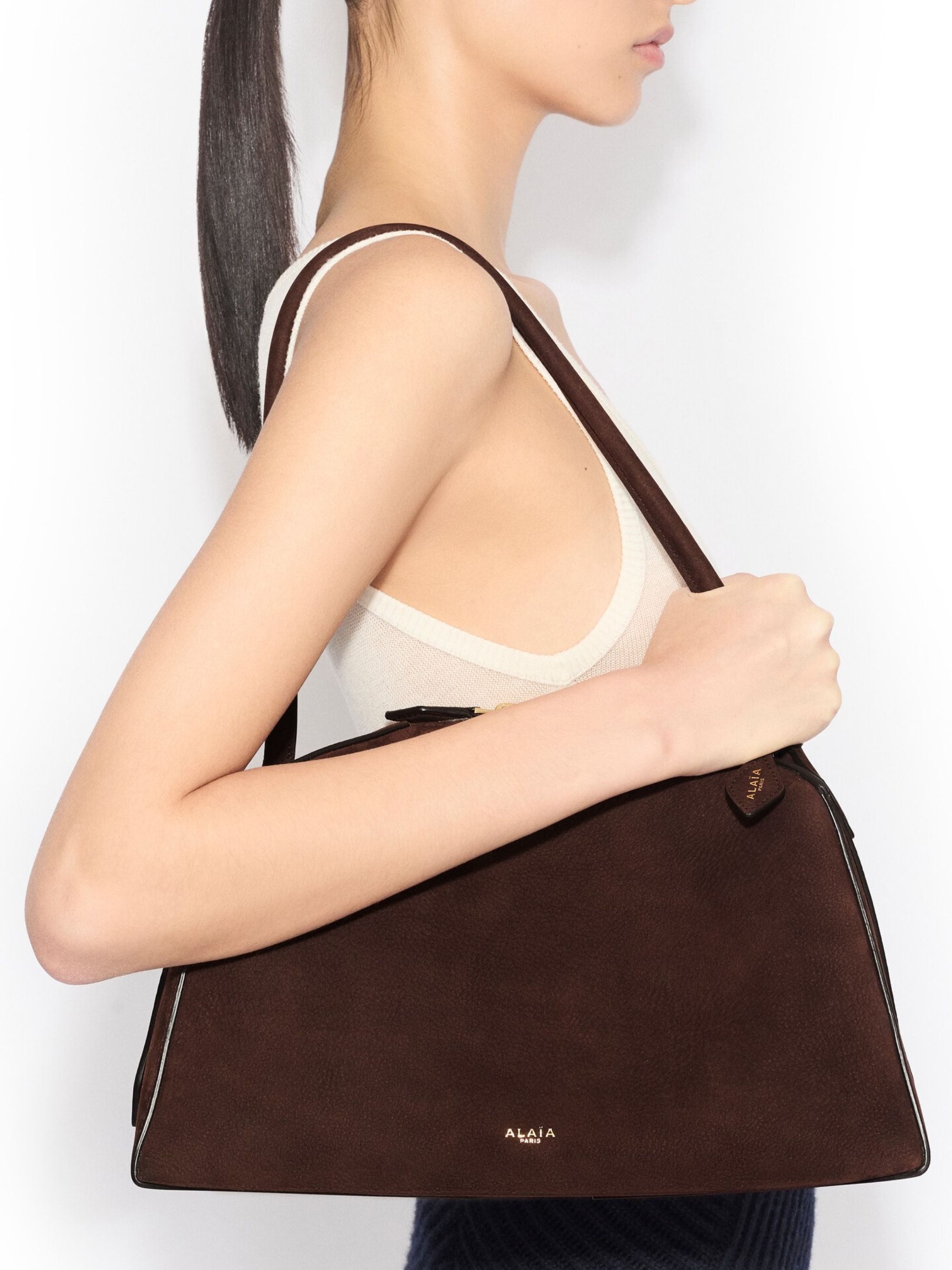 Borsa Le Bouledogue di ALAIA marrrone in pelle scamosciata, caratterizzata da manico tubolare con lacci decorativi, chiusura con doppia zip e logo dorato sul fronte. Dimensioni: 32 x 17 x 15 CM.