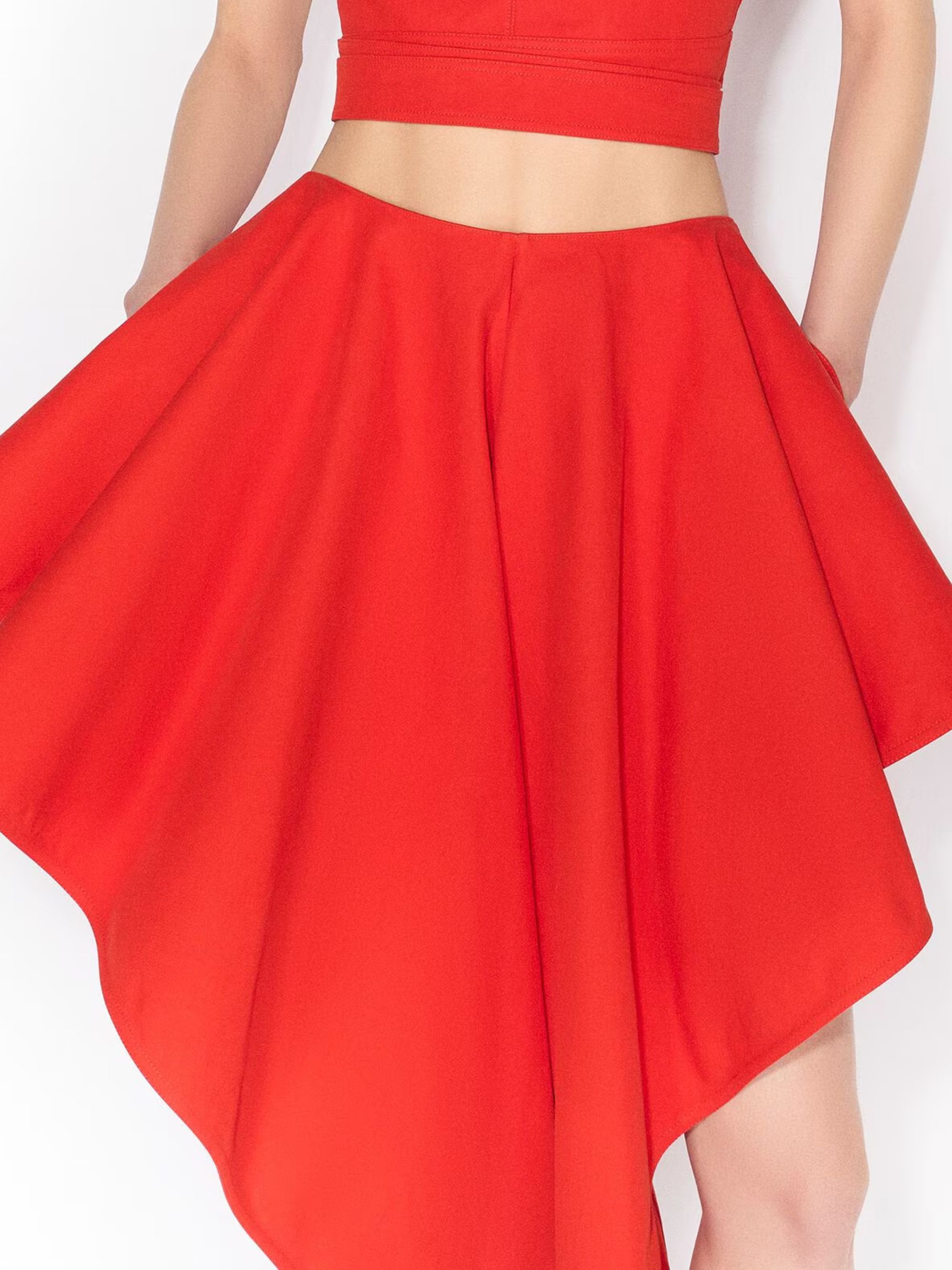 Pantalone a pannelli di ALAIA rosso in cotone con vita media, gamba affusolata, tasche laterali, laccetti alla caviglia da annodare, ruche lungo i lati e chiusura con zip.