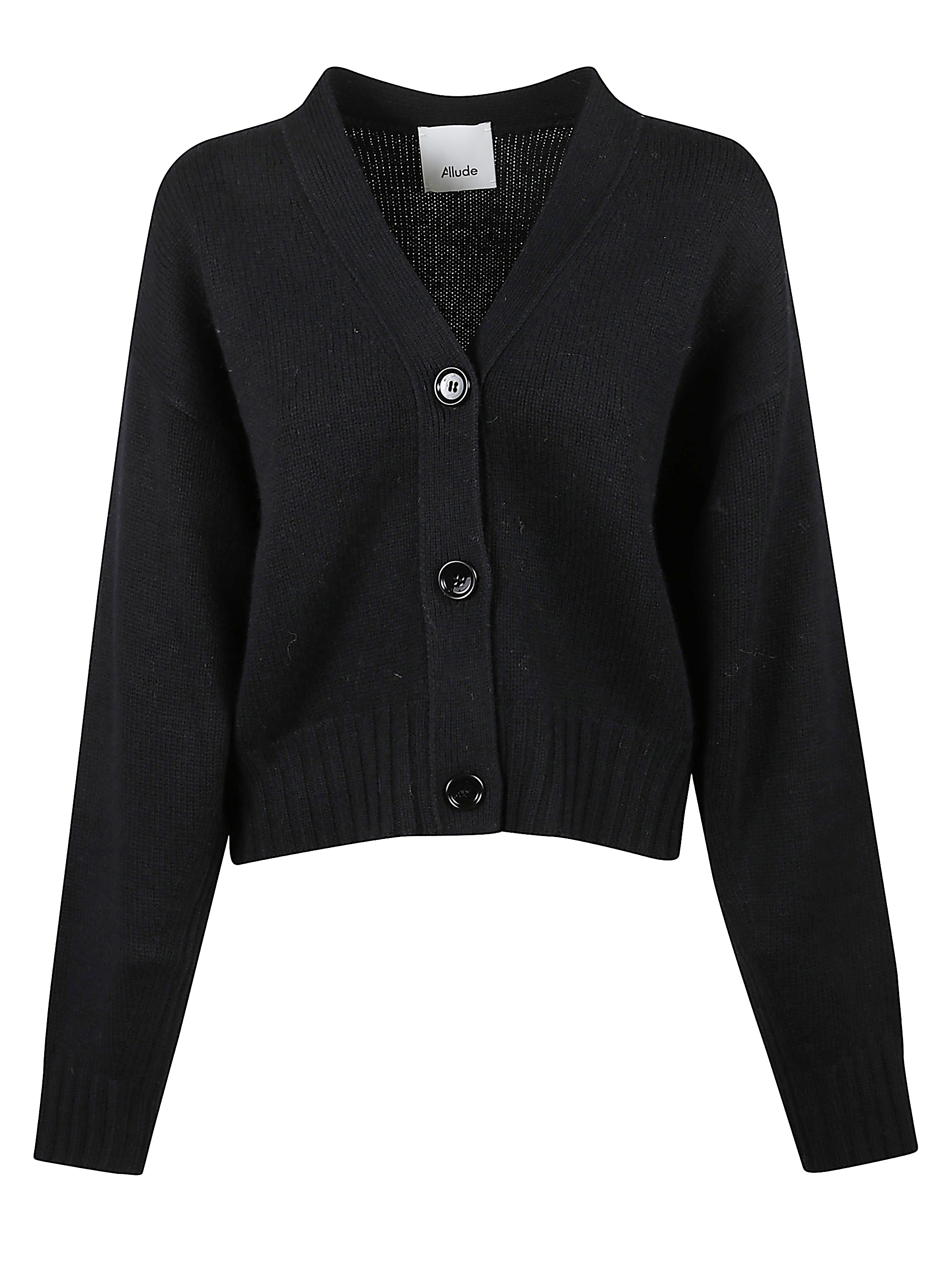Cardigan scollo a V di ALLUDE nero in lana e cashmere, caratterizzato da maniche lunghe, chiusura con bottoni e bordi a costine.