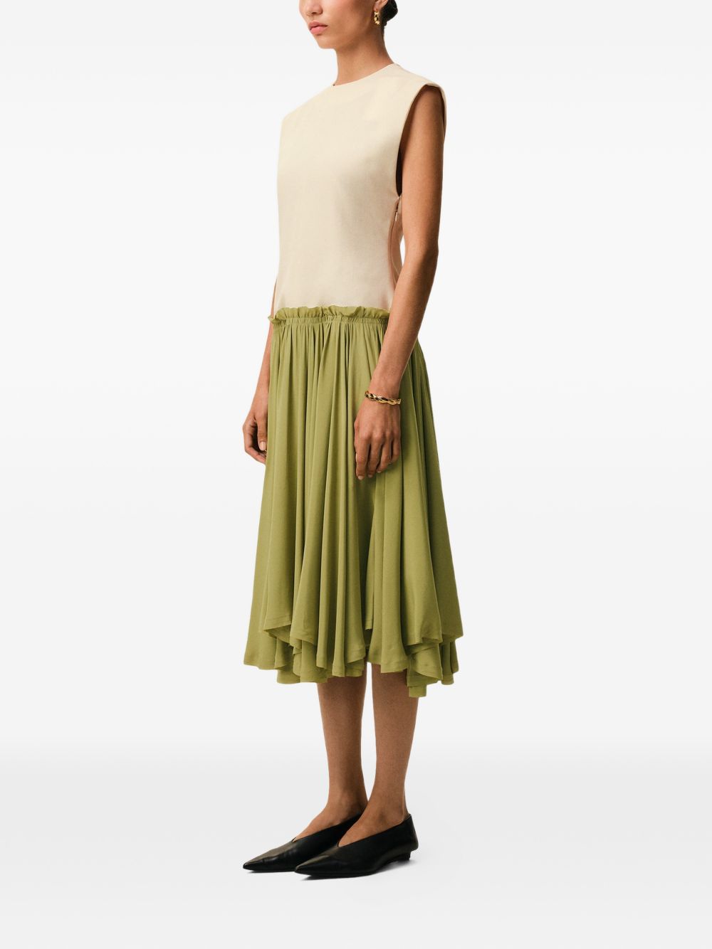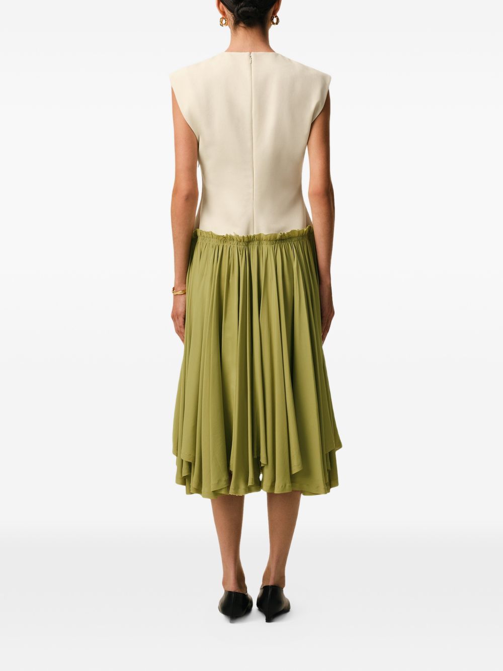 Abito midi bicolore di AMI PARIS bianco e verde in lana, caratterizzata da corpetto aderente senza maniche, fonna aruota, corpetto foderato e zip invisibile al centro sul retroe sul lato.