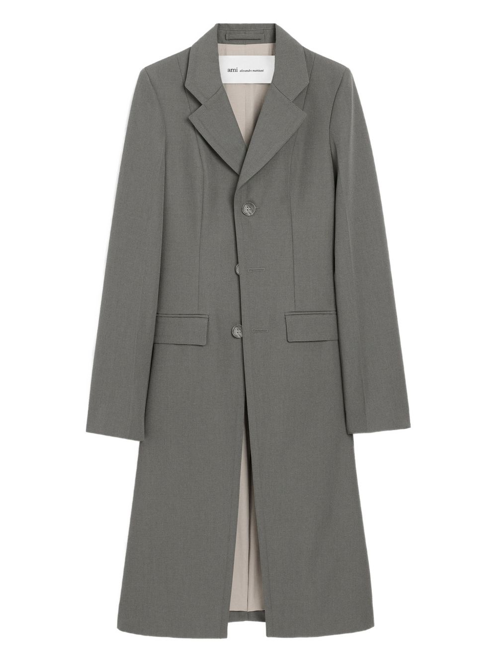 Cappotto monopetto aderente di AMI PARIS grigia in lana, caratterizzata da taglio aderente, chiusura monopetto con bottoni, bottoni Ami in corno, tasche con patta, spacco centrale sul retro, 1 asola funzionale e due decorative.