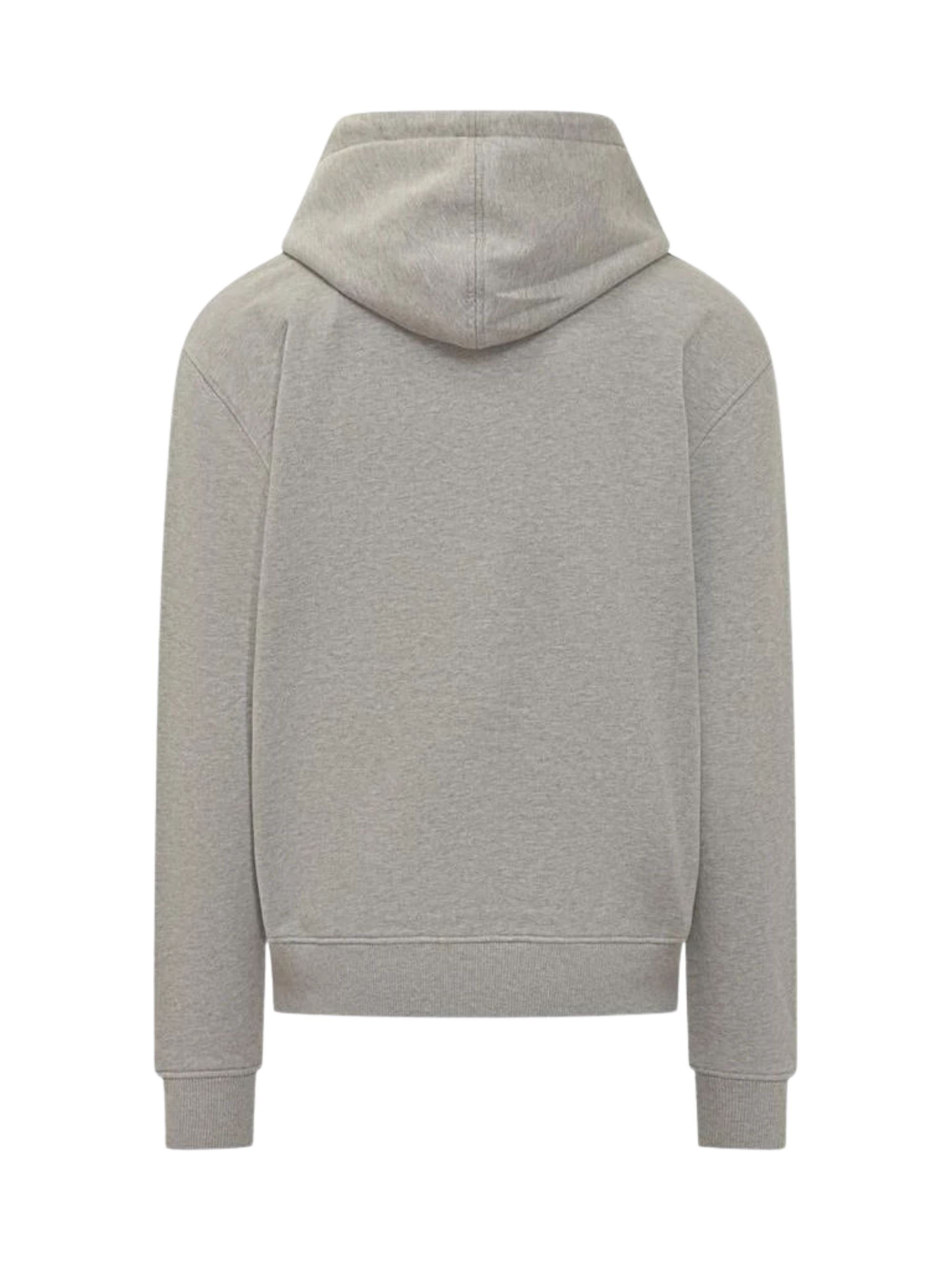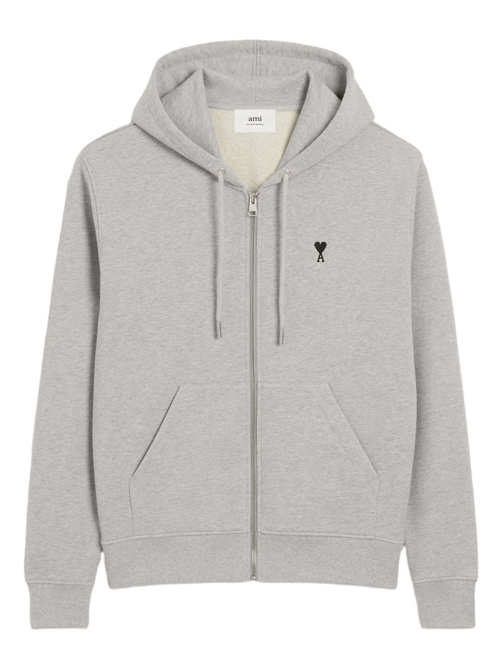 Felpa Ami de Coeur di AMI PARIS grigia in cotone, caratterizzata da maniche lunghe, ricamo Ami de Coeur sul petto, finiture a coste, cappuccio con coulisse, chiusura con zip e due tasche frontali.