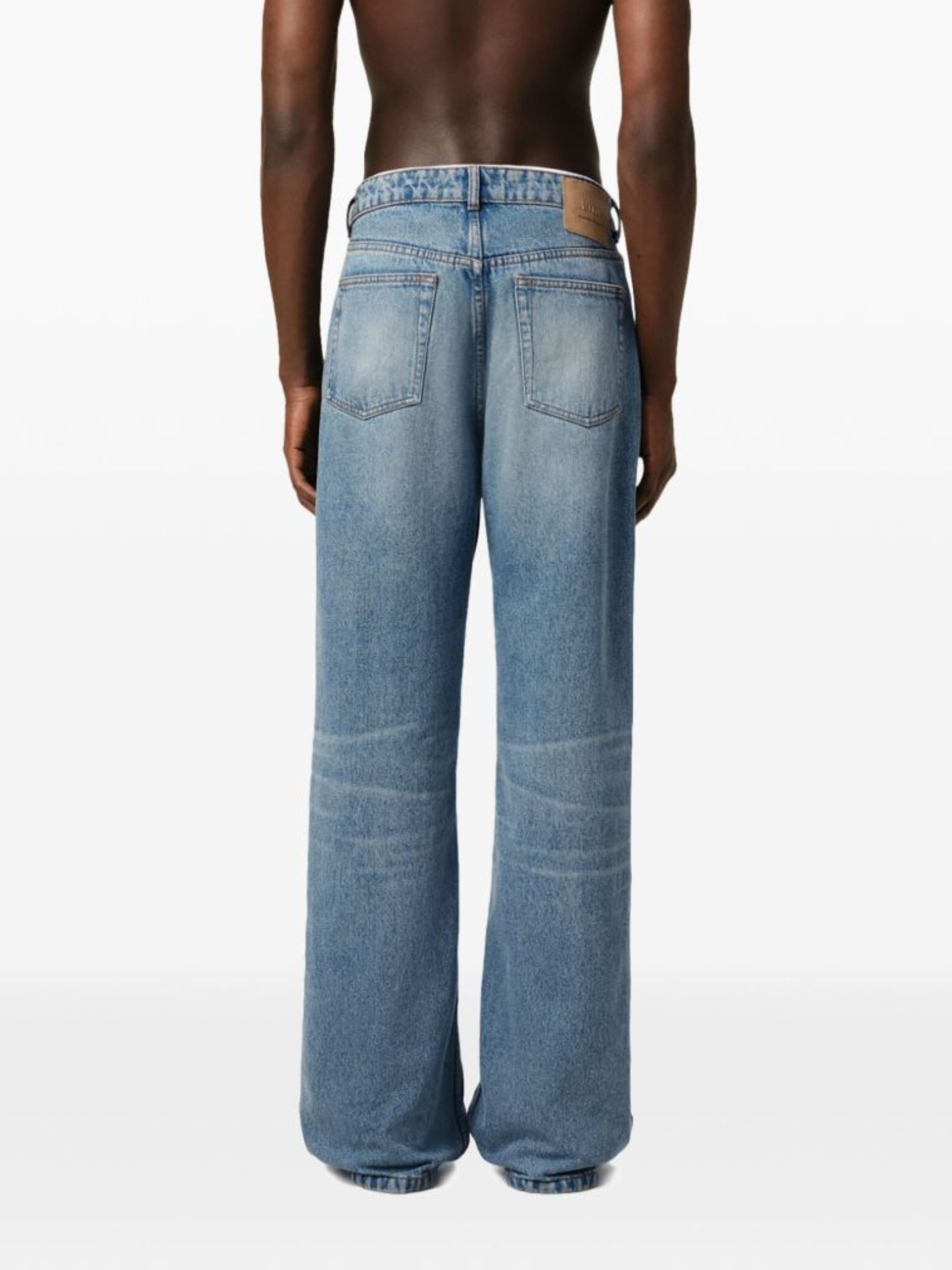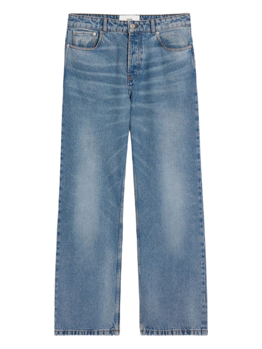 Jeans Large Fit di AMI PARIS blu in cotone, caratterizzato da vita regolare, gamba larga, patta con bottoni, 5 tasche, bottoni in denim, jacron in carta ami alexandre mattiussi sulla schiena e impunture color tabacco.