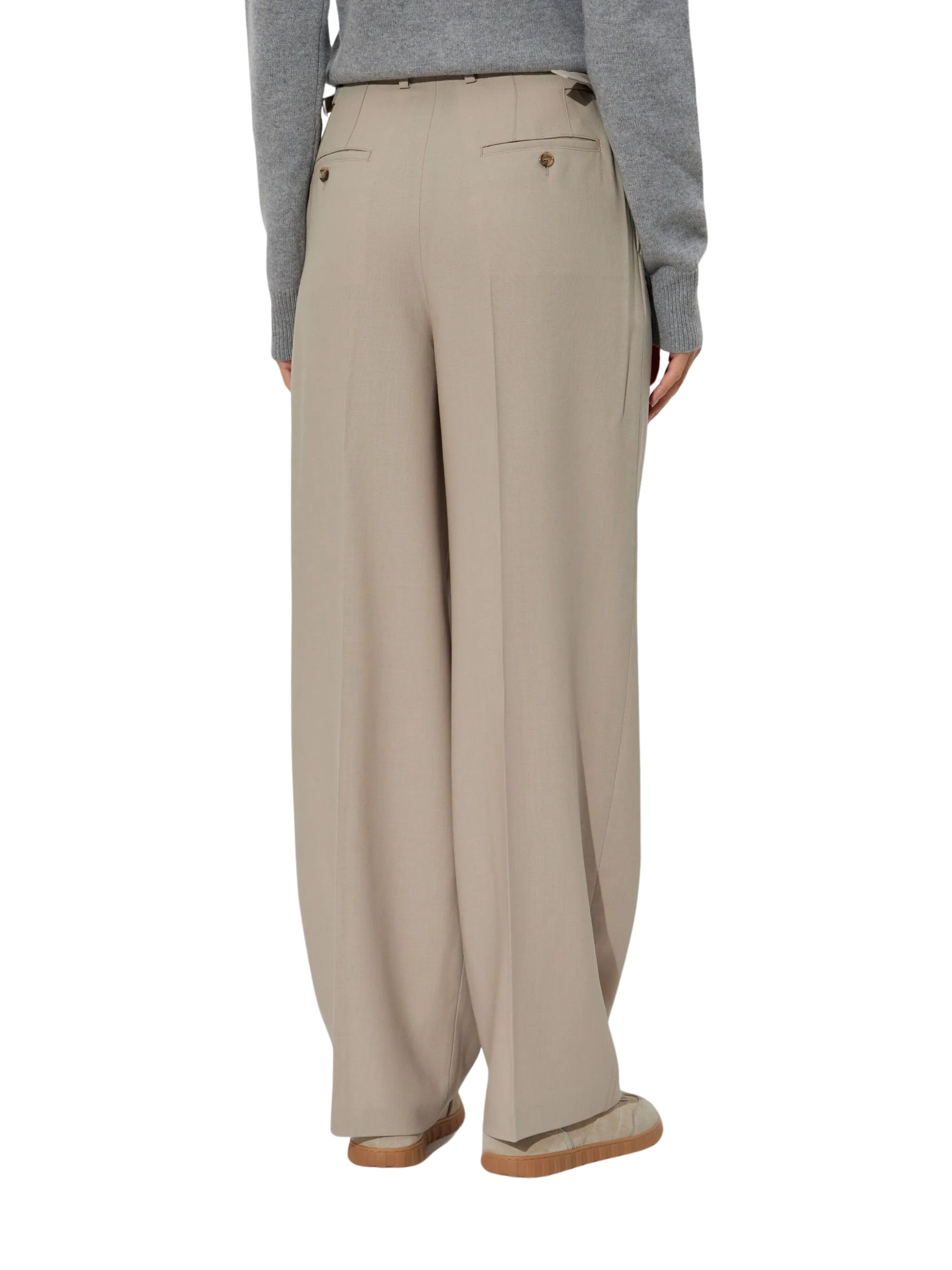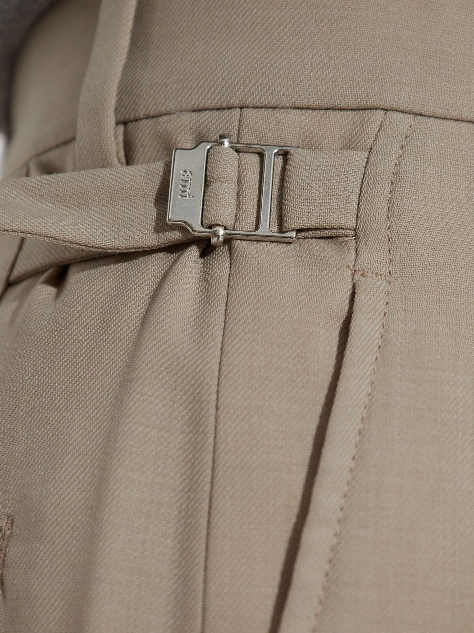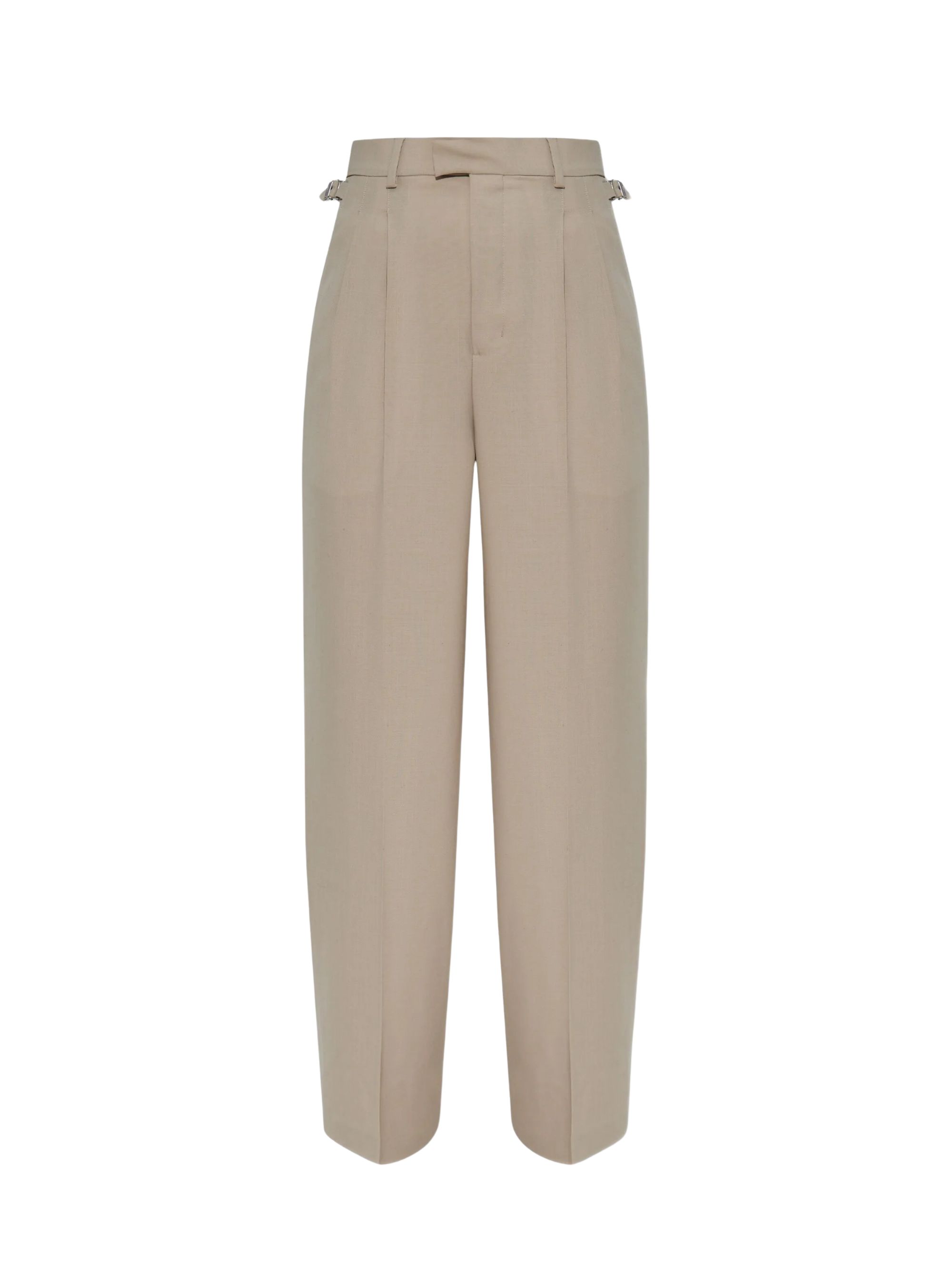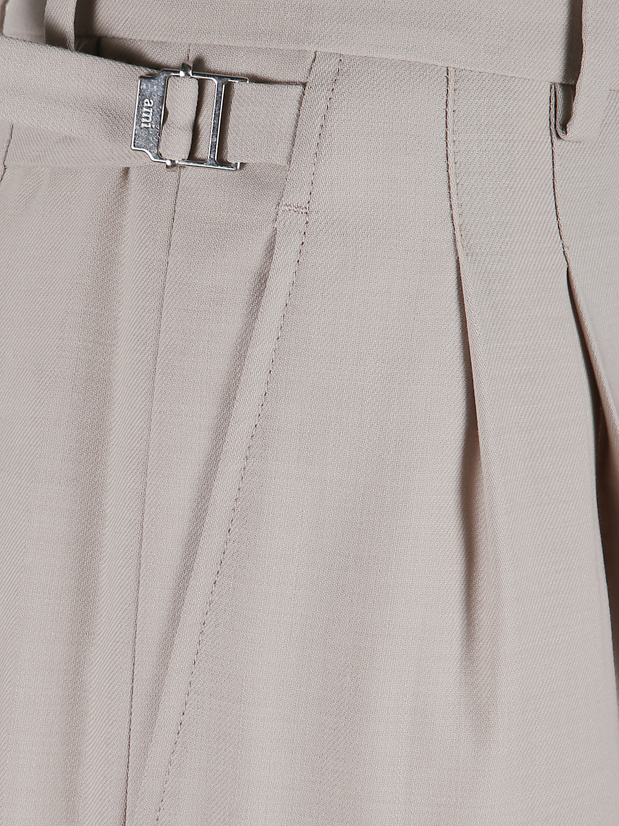 Pantalone classico di AMI PARIS beige in lana, caratterizzato da chiusura con bottone e zip, tasche a filetto posteriore con bottone, vita alta e orlo dritto.