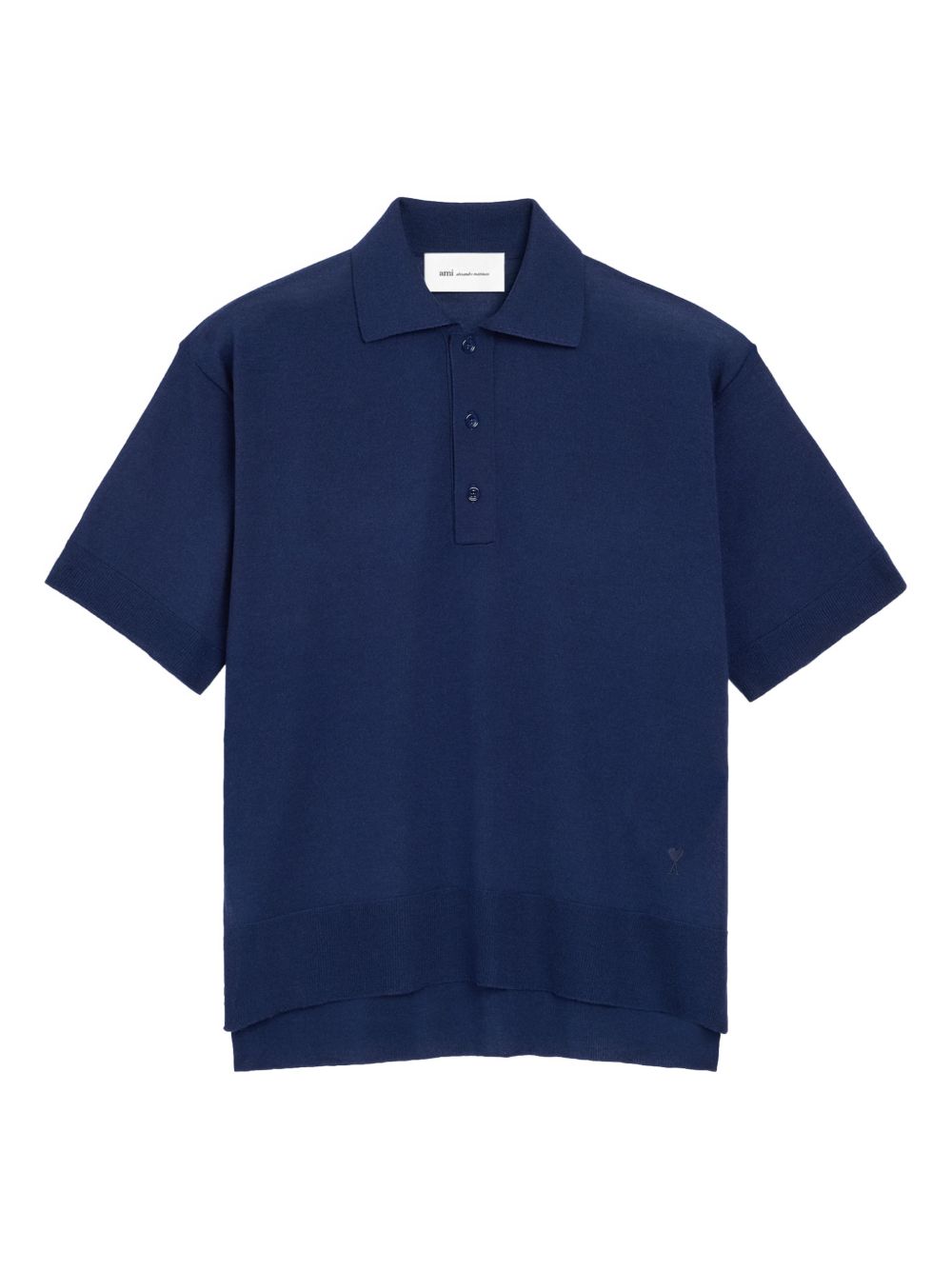 Polo Ami de Coeur di AMI PARIS blu in lana, caratterizzata da colletto classico, chiusura con bottoni, maniche corte e logo ricamato sul fondo.