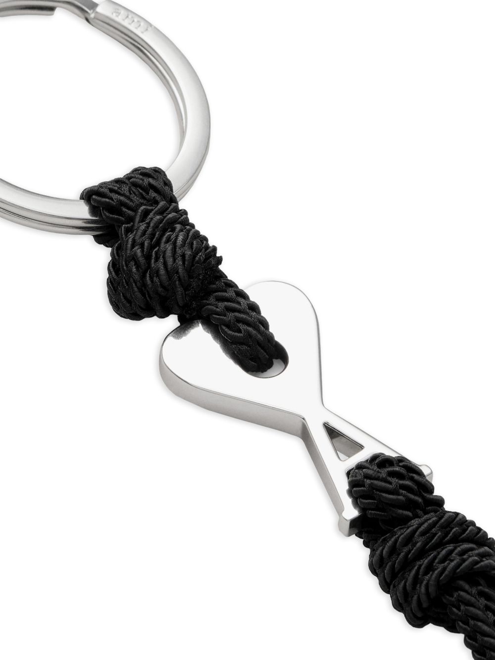 Portachiavi con charm di AMI PARIS nero in corda intrecciata e metallo, caratterizzato da chiusura a gancio con incisione ami e hardware argento.