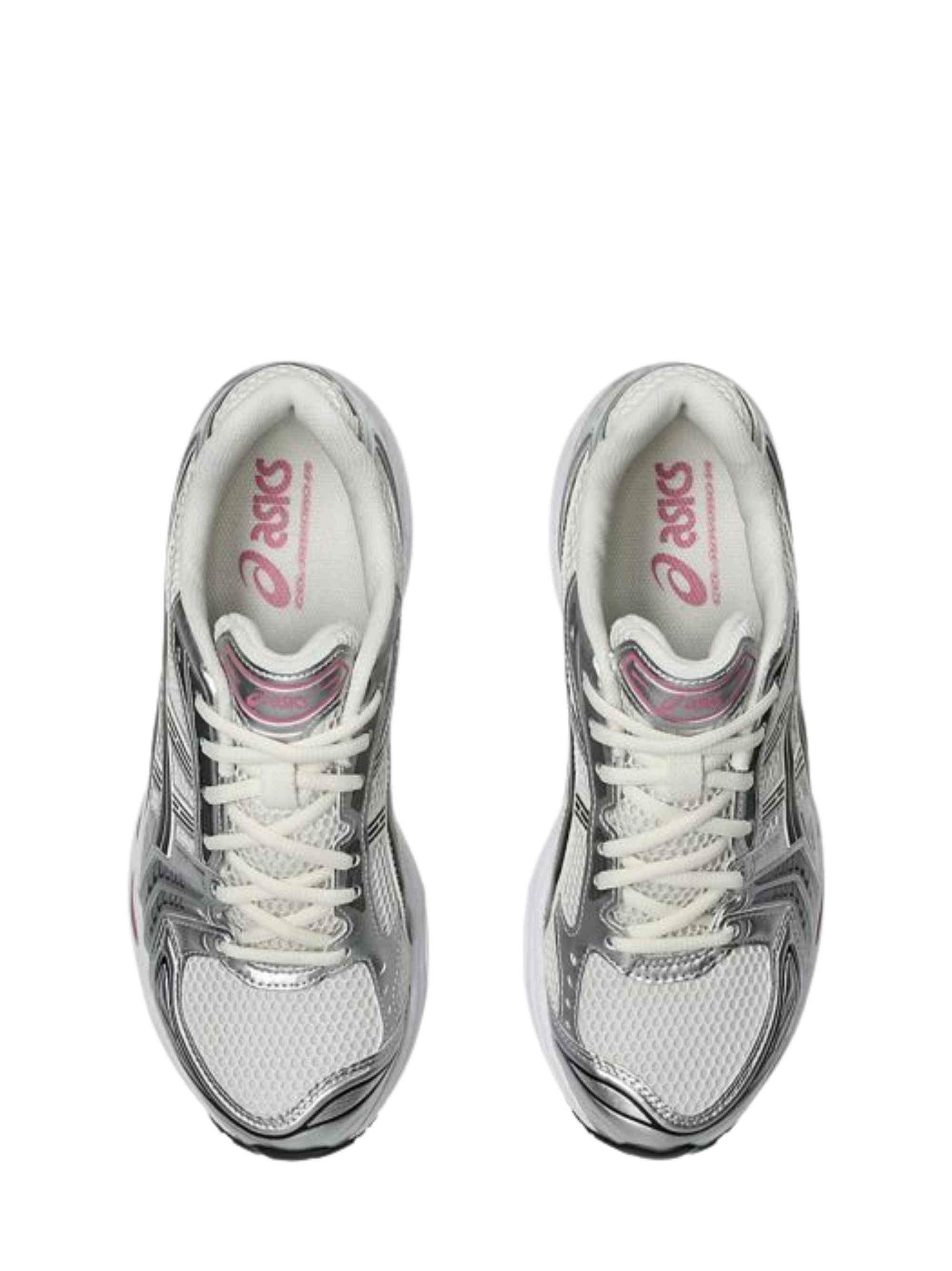 Sneaker Gel-Kayano 14 di ASICS grigia e rosa in pelle e mesh, caratterizzata da chiusura con lacci, suola in gomma, ammortizzazione con tecnologia GEL e dettagli rosa.