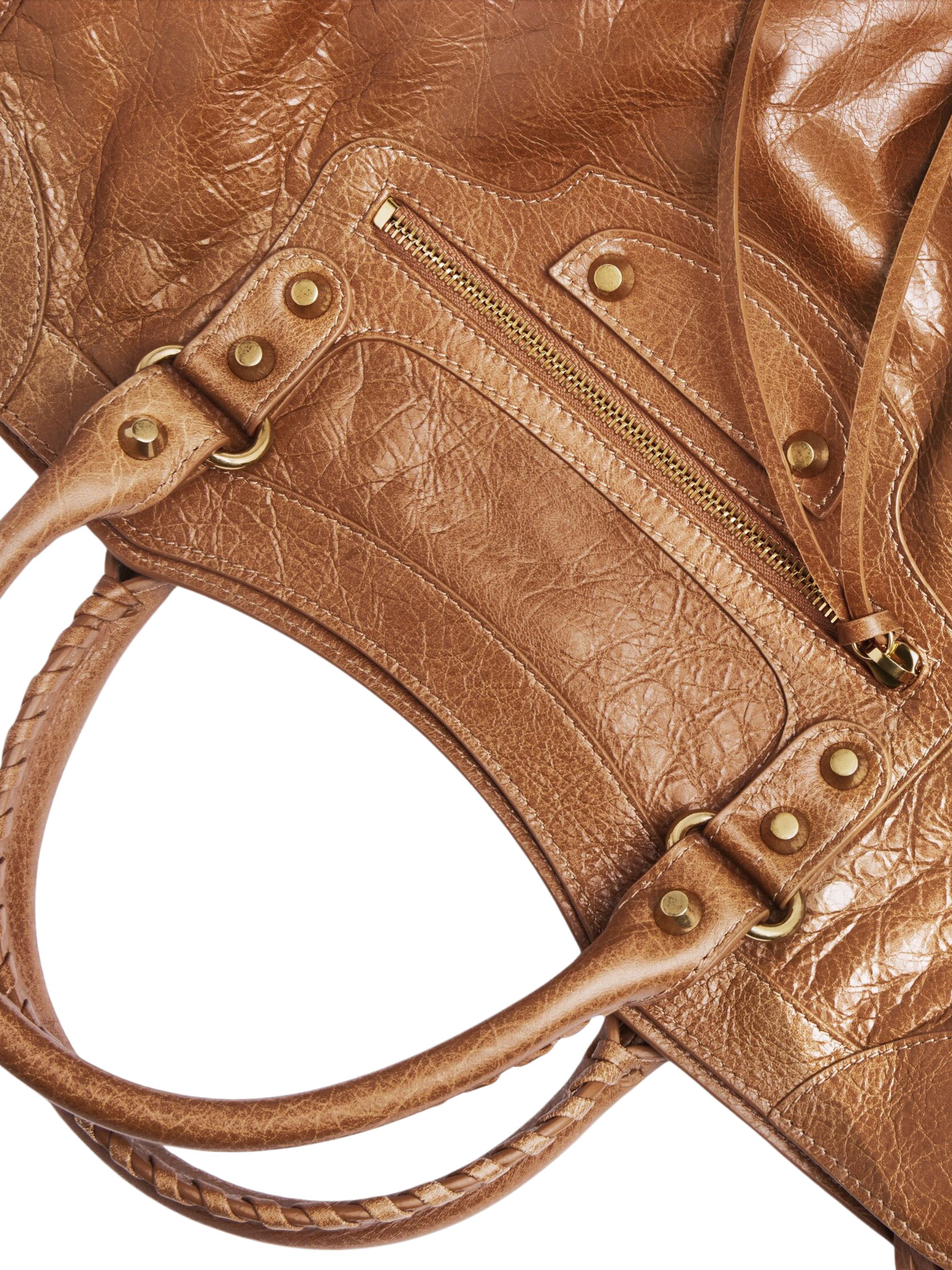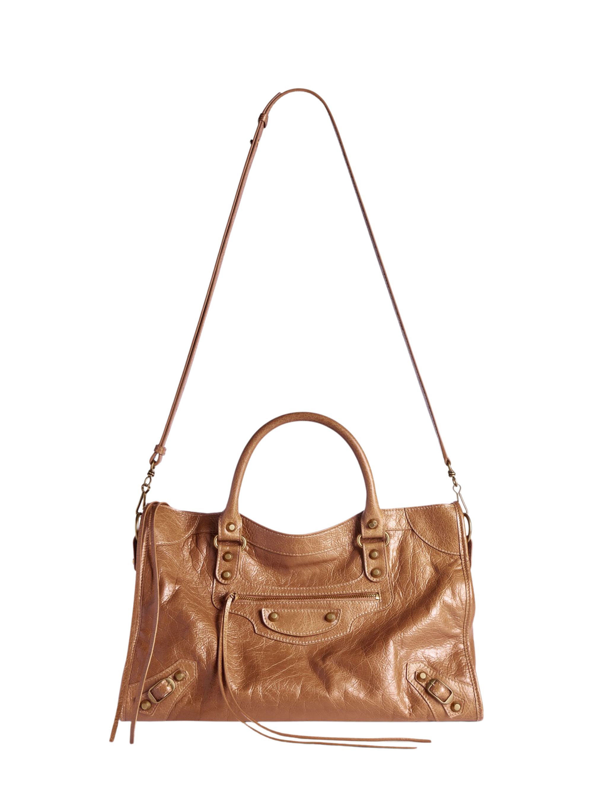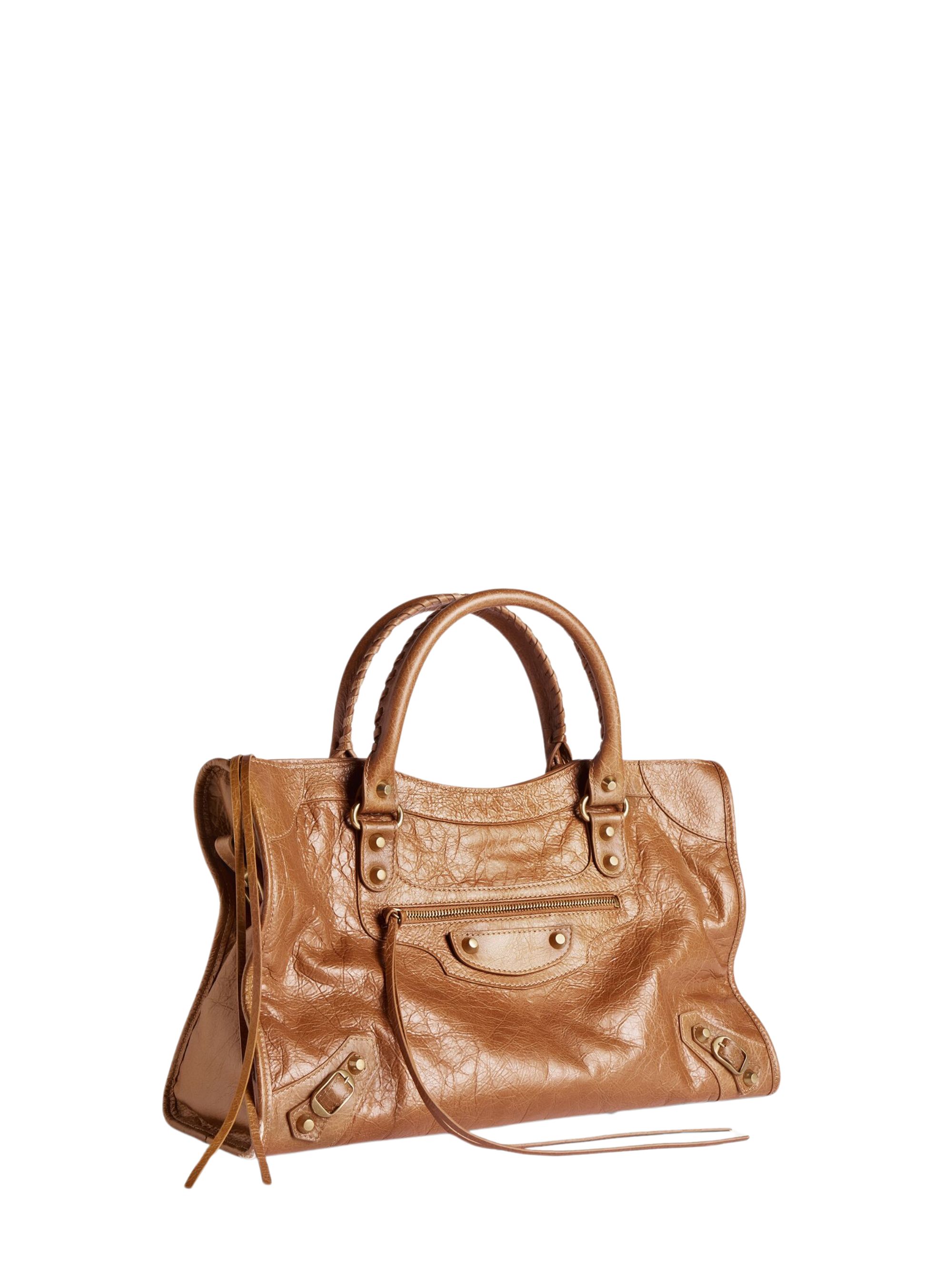 Borsa Le City media di BALENCIAGA marrone in pelle, caratterizzata da due manici, tracolla rimovibile e regolabile, finiture argento, chiusura con zip, nastri e tasca anteriore con zip. Dimensioni: 38 x 24 x 13,5 CM.