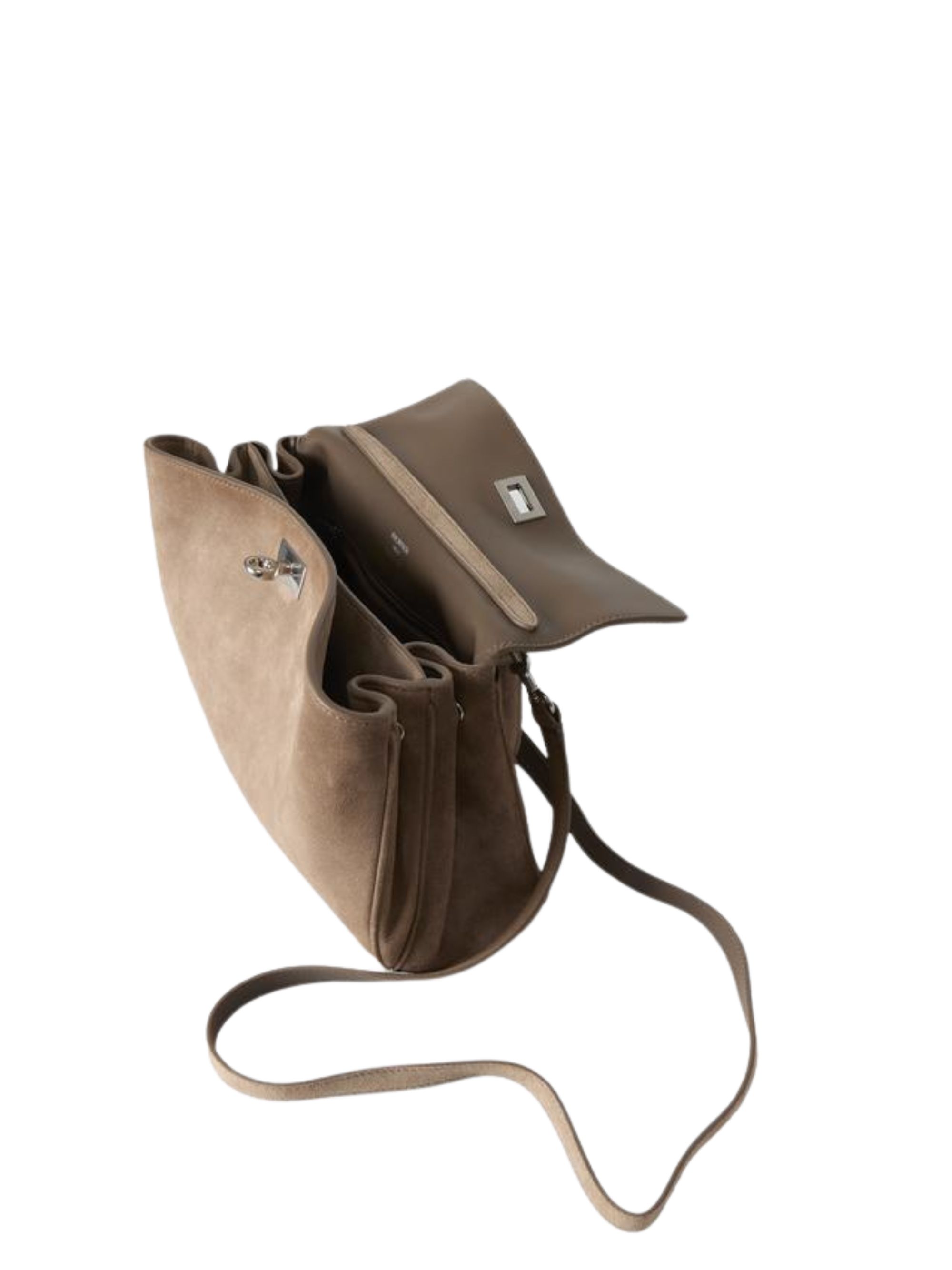 Borsa Rodeo di BALENCIAGA beige in pelle scamosciata, caratterizzata da manico, tracolla rimovibile, portachiavi rimovibile, finiture in oro anticato, chiusura a girello, tasca anteriore e piedini in ottone. Dimensioni: 27 x 20 x 10 CM.