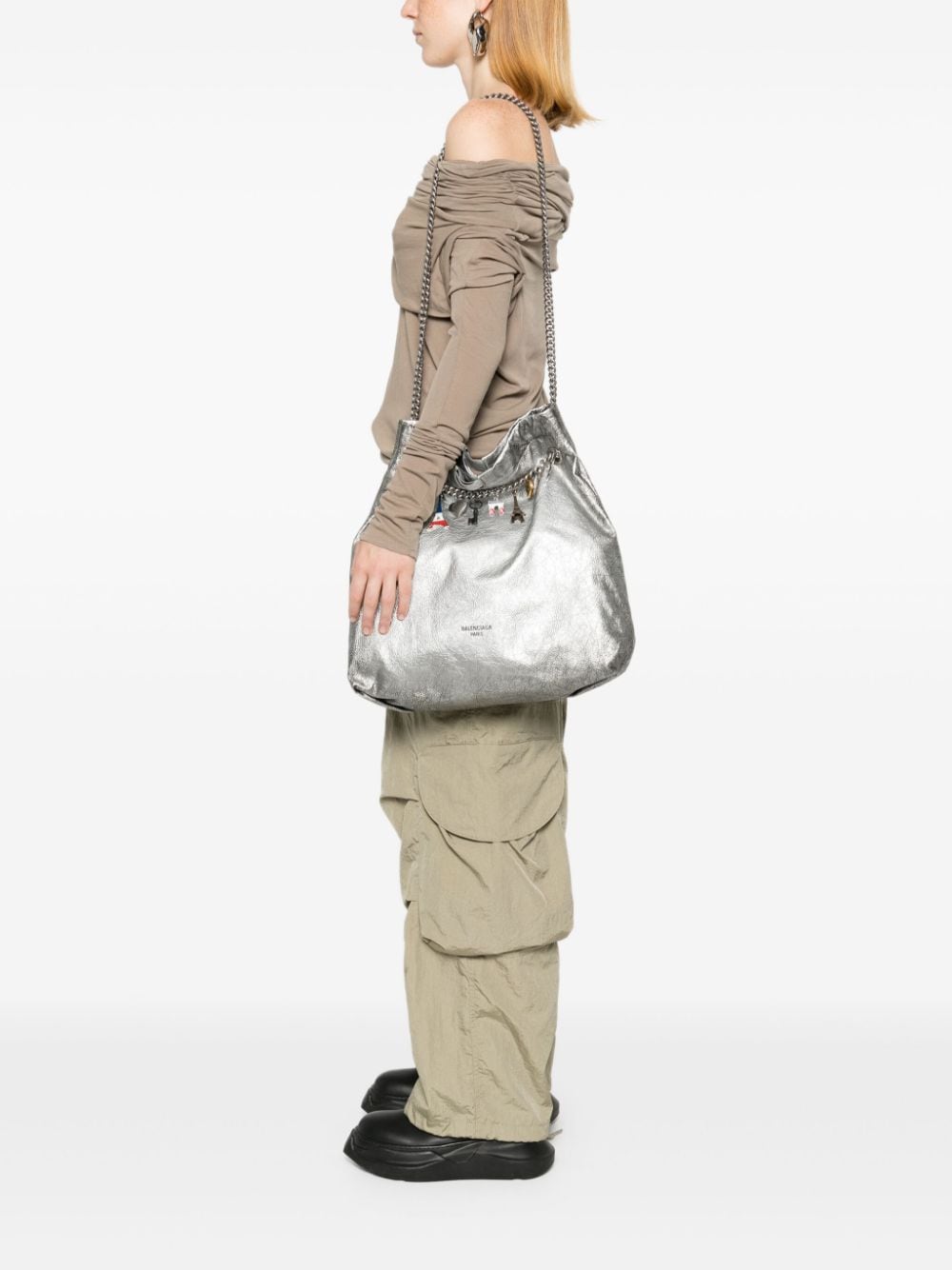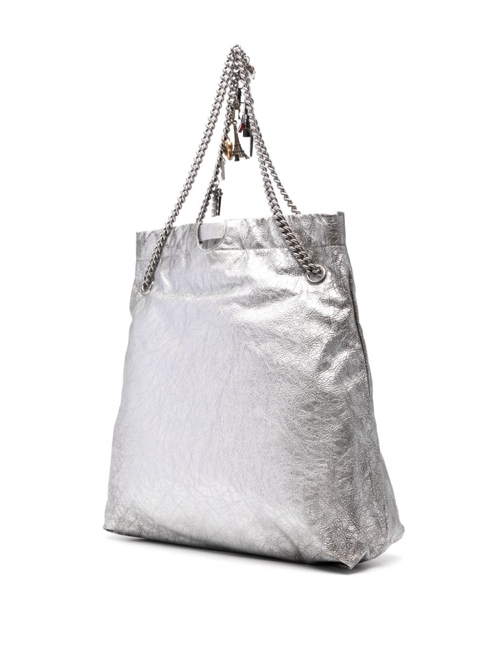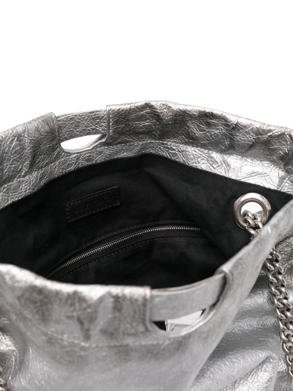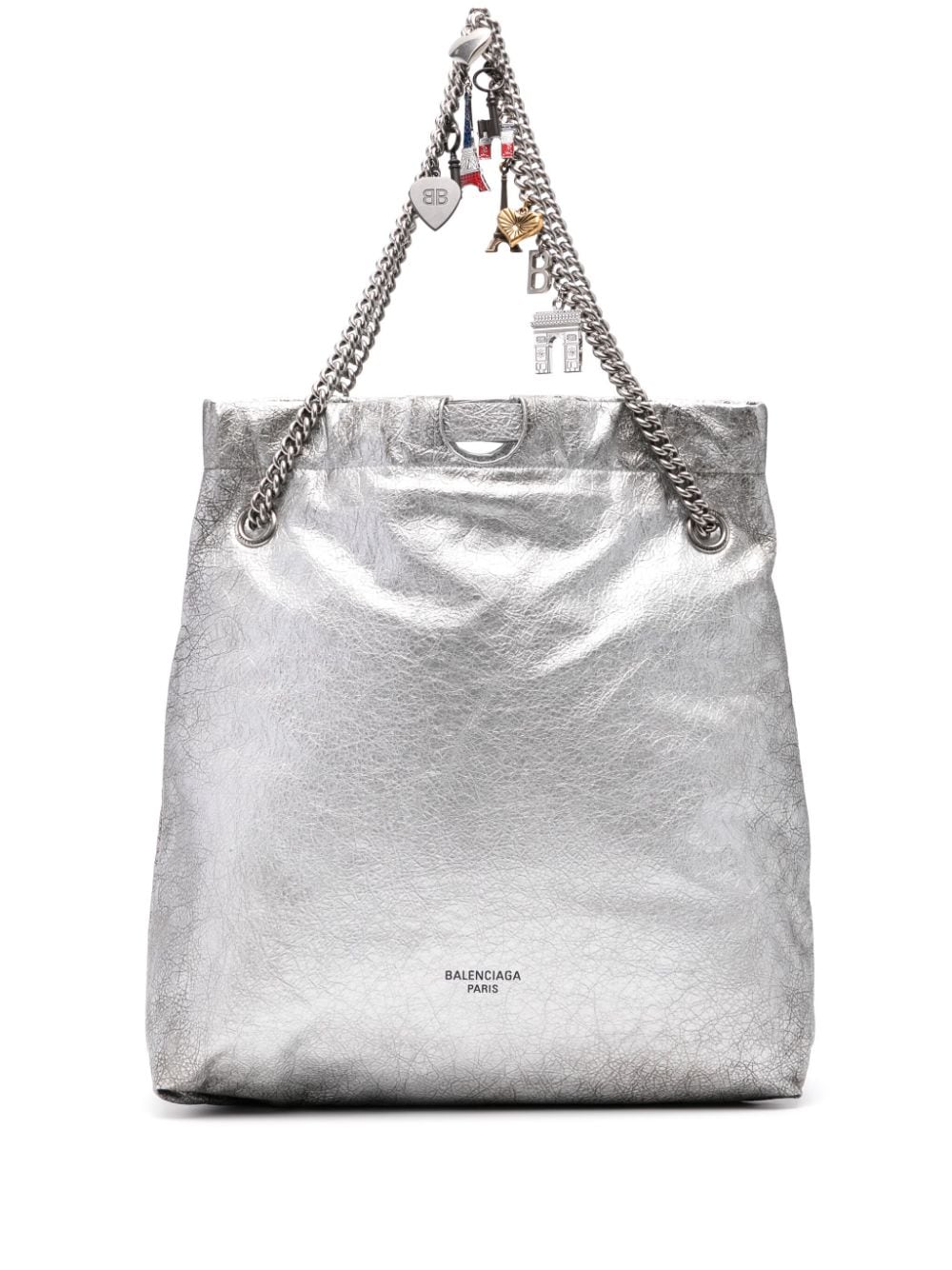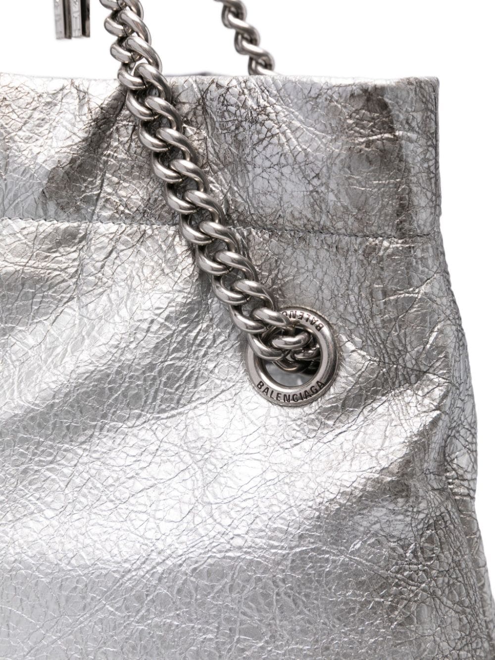 Borsa tote Crush media di BALENCIAGA argento in pelle con effetto craquelé, con tracolla a catena scorrevole, dettaglio con ciondolo, tasca interna con zip e chiusura a coulisse.