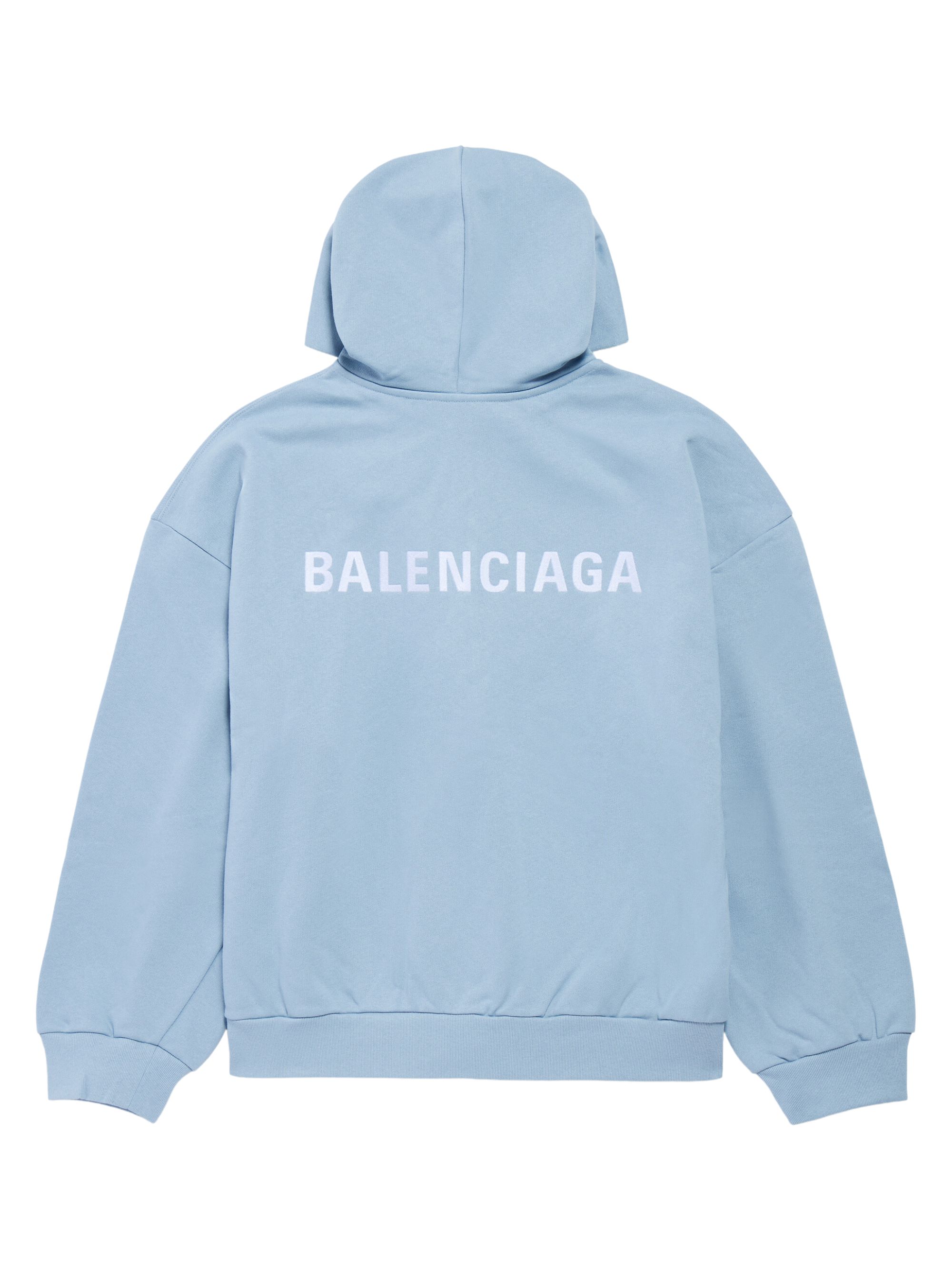 Felpa Balenciaga Back di BALENCIAGA azzurra in cotone, caratterizzata da cappuccio senza coulisse, chiusura con zip a doppio cursore, 2 tasche sul davanti e motivo Balenciaga Back ricamato su fronte e retro.