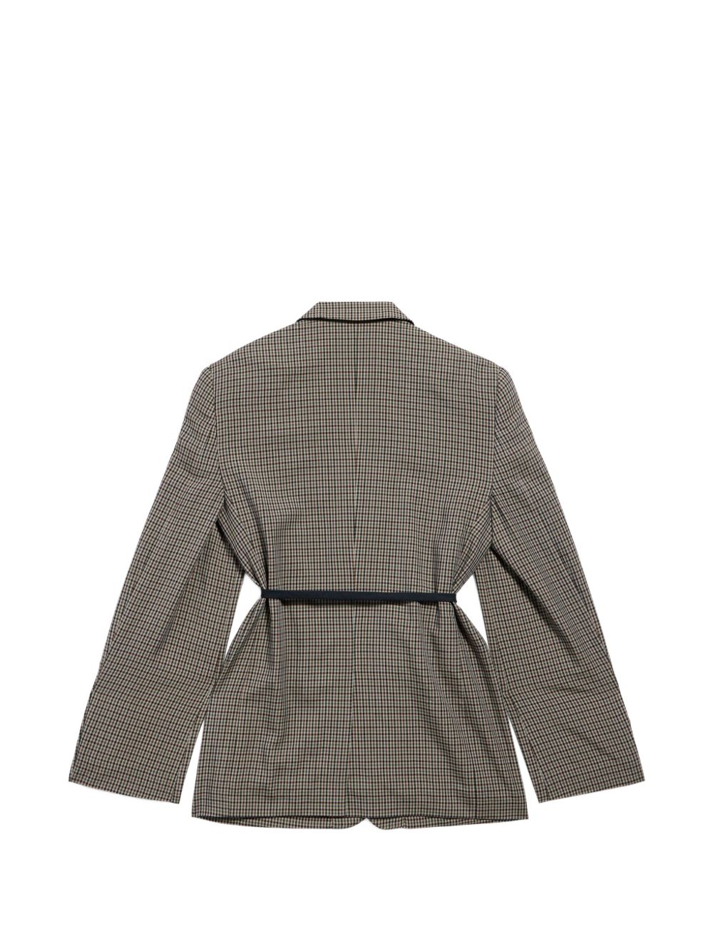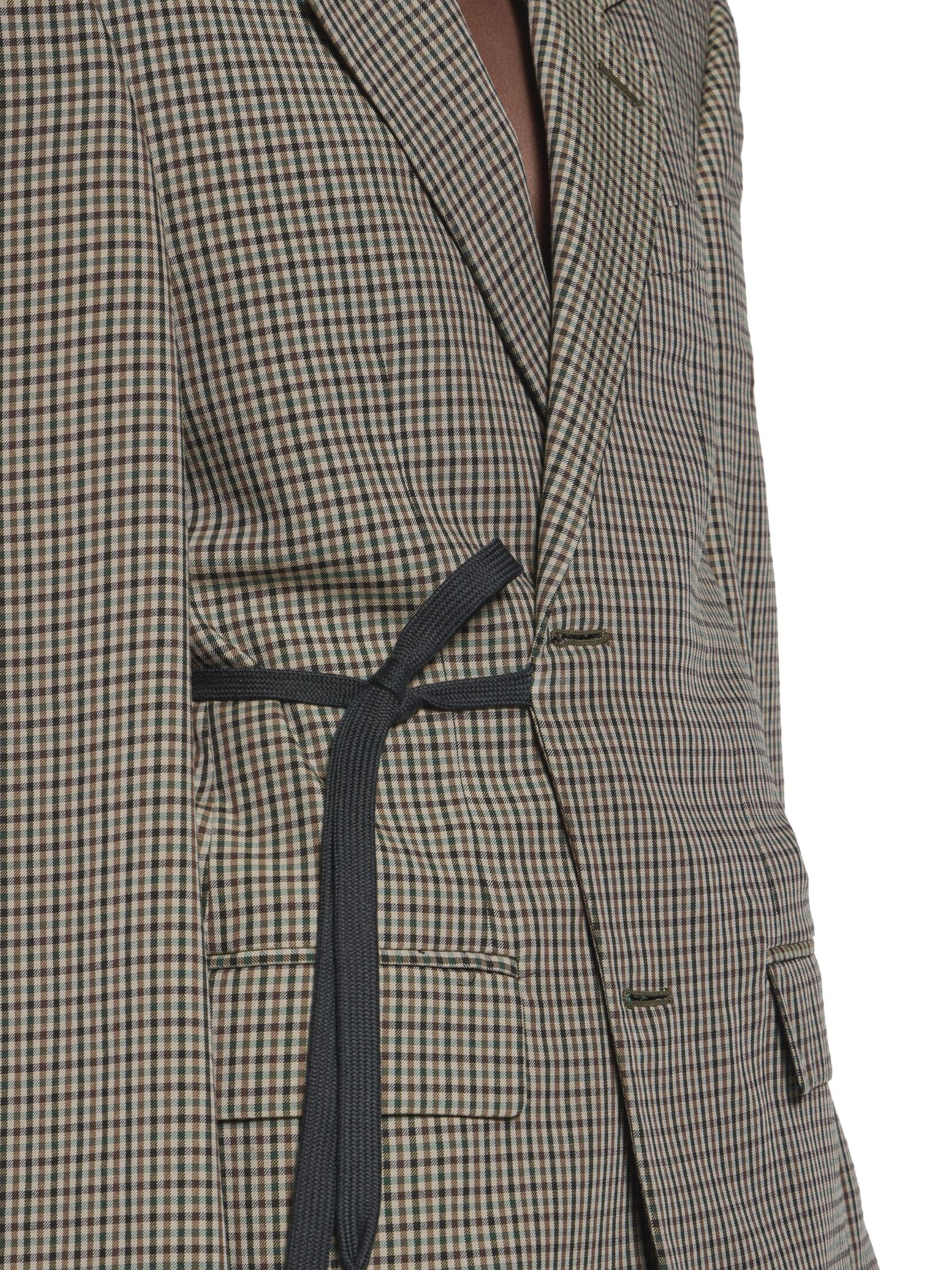 Giacca sartoriale Wrap di BALENCIAGA kaki e marrone in lyocell, caratterizzata da motivo a quadri, revers classico, chiusura monopetto con 2 bottoni, nodo in vita con coulisse, 2 tasche con patta, polsini con bottoni e spacco sul retro.