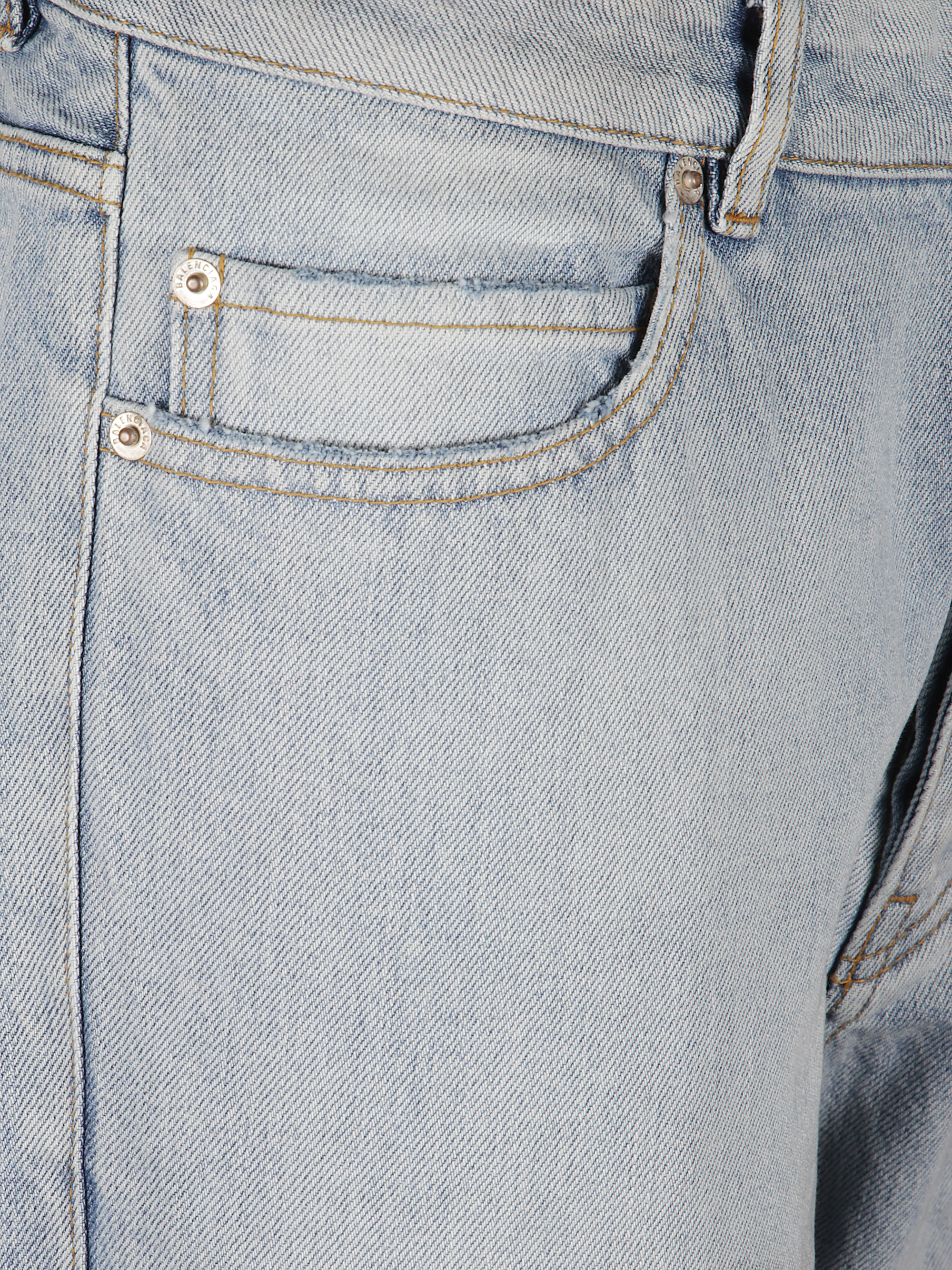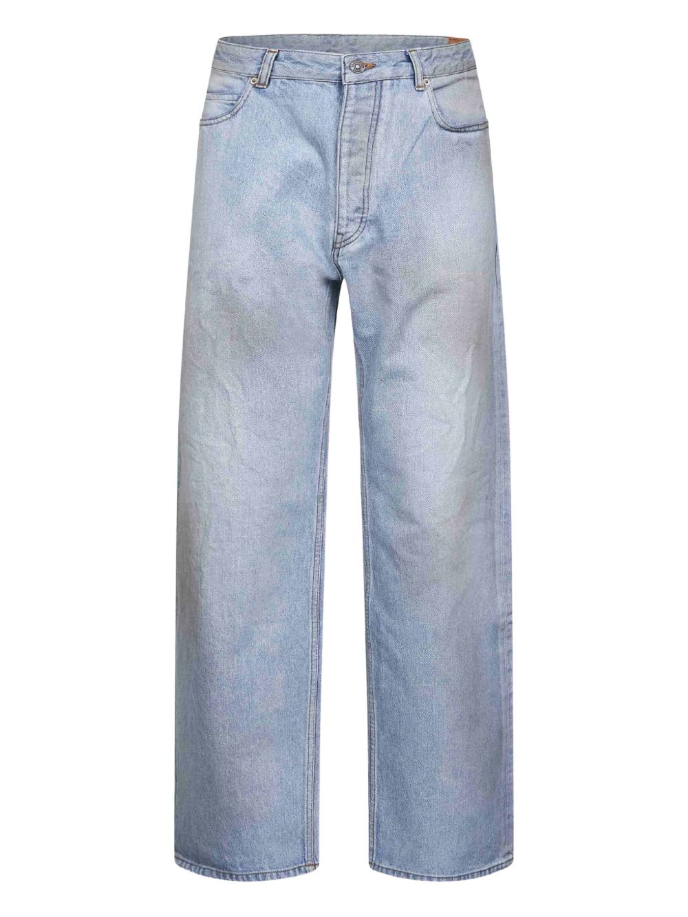 Jeans Distressed Fit di BALENCIAGA azzurro in denim di cotone con effetto sporco e consumato, vita media, passanti per cintura, design a cinque tasche, applicazione in jeans sul retro e chiusura con zip nascosta.