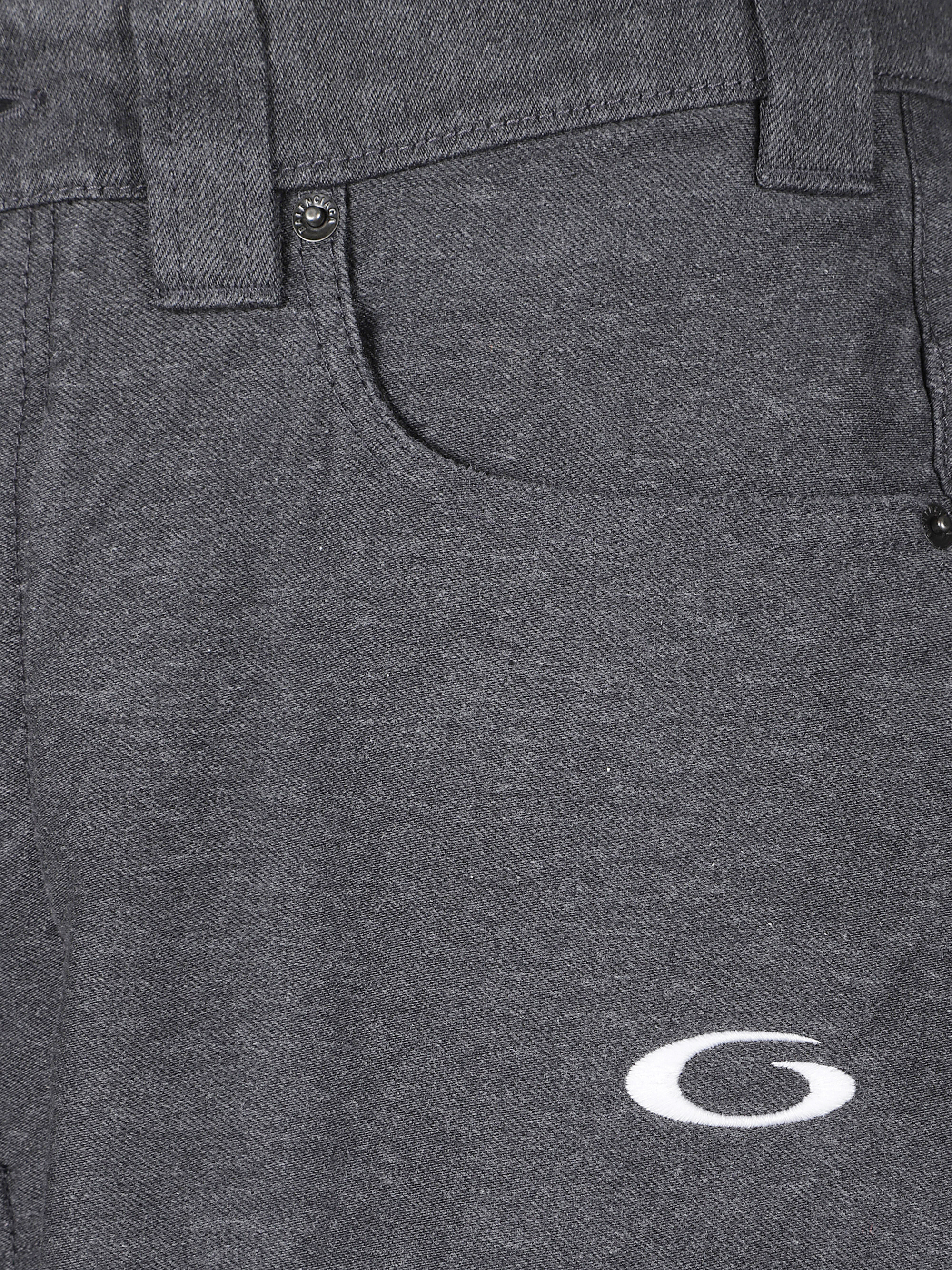 Pantalone trompe l'Oeil di BALENCIAGA grigio antraciate in denim di cotone con vita media, passanti per cintura, design a cinque tasche, motivo loop sports icon ricamato sulla gamba sinistra, Jacron Balenciaga e chiusura con zip nascosta.