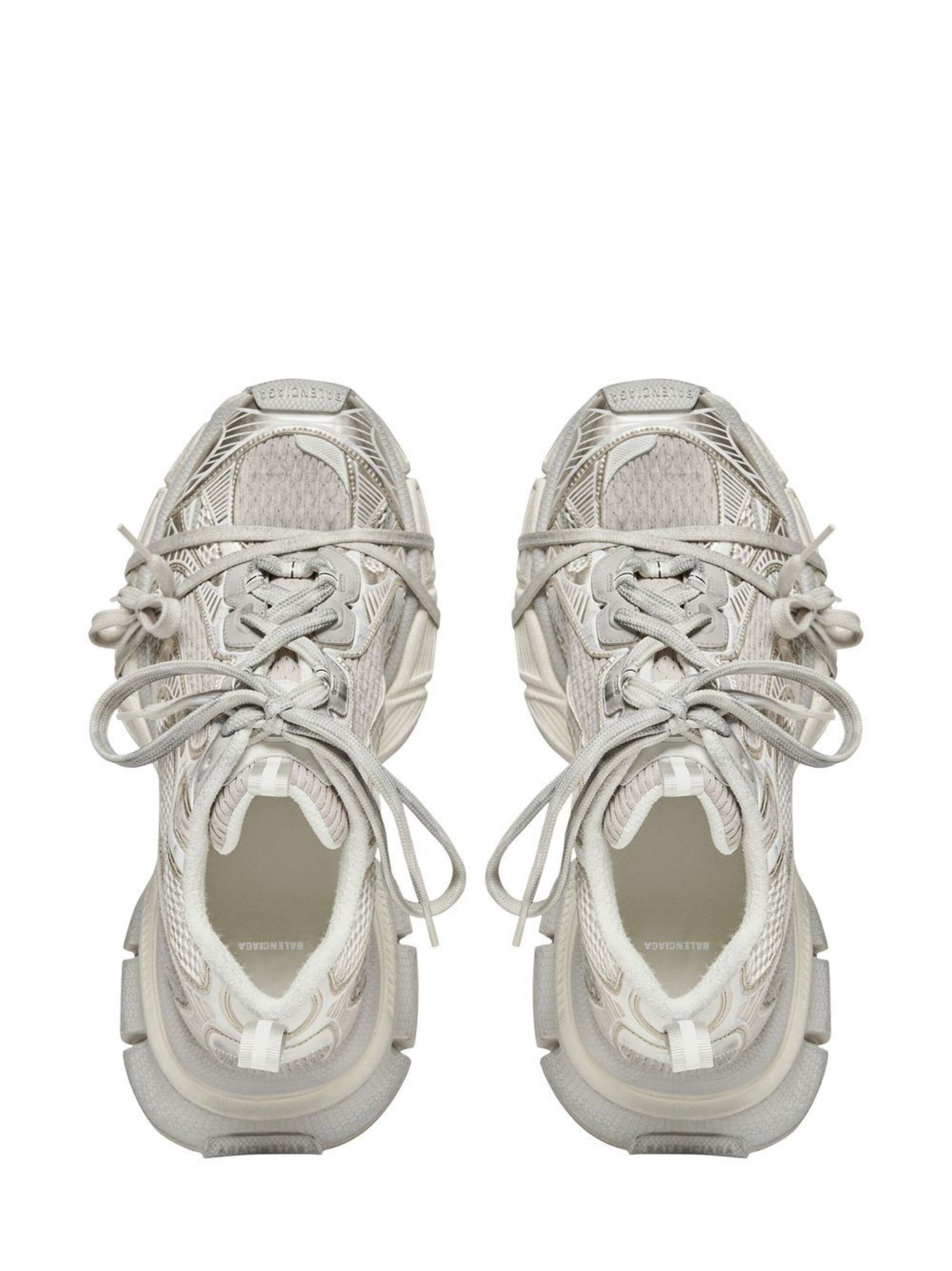 Sneaker 3XL di BALENCIAGA grigia in mesh, caratterizzata da effetto consumato, logo, branding 3XL in gomma sulla linguetta, chiusura con lacci e dettagli riflettenti.