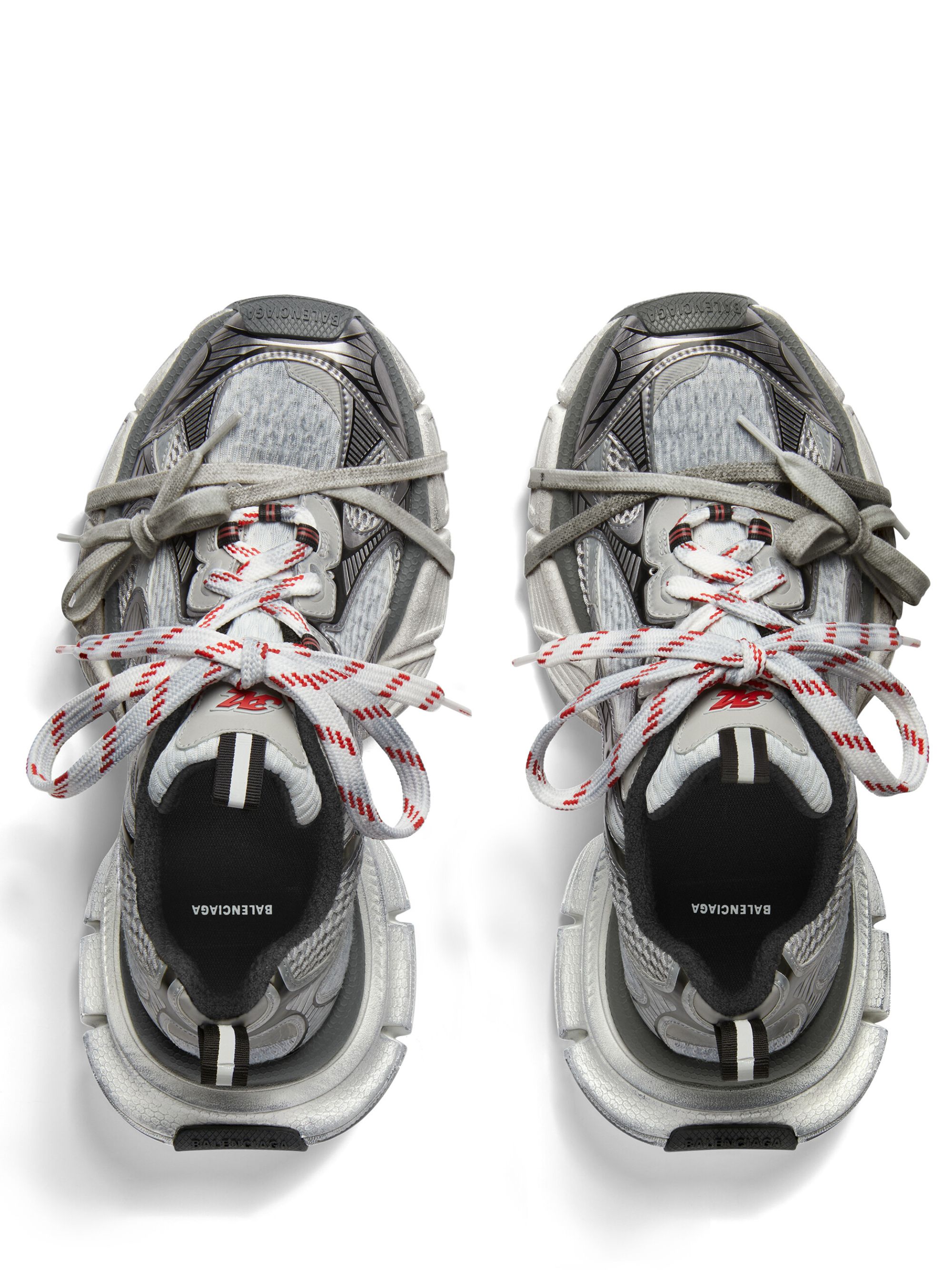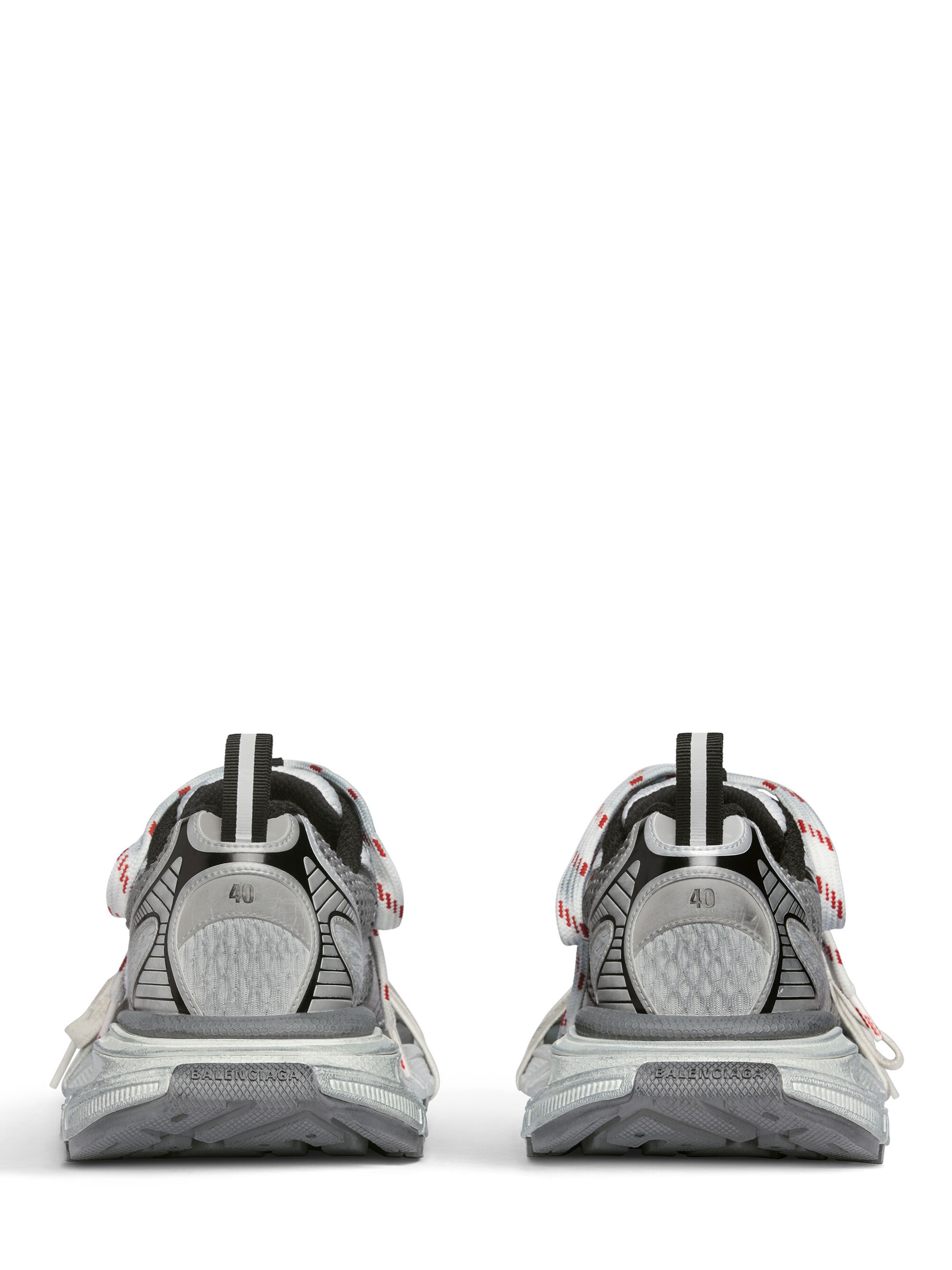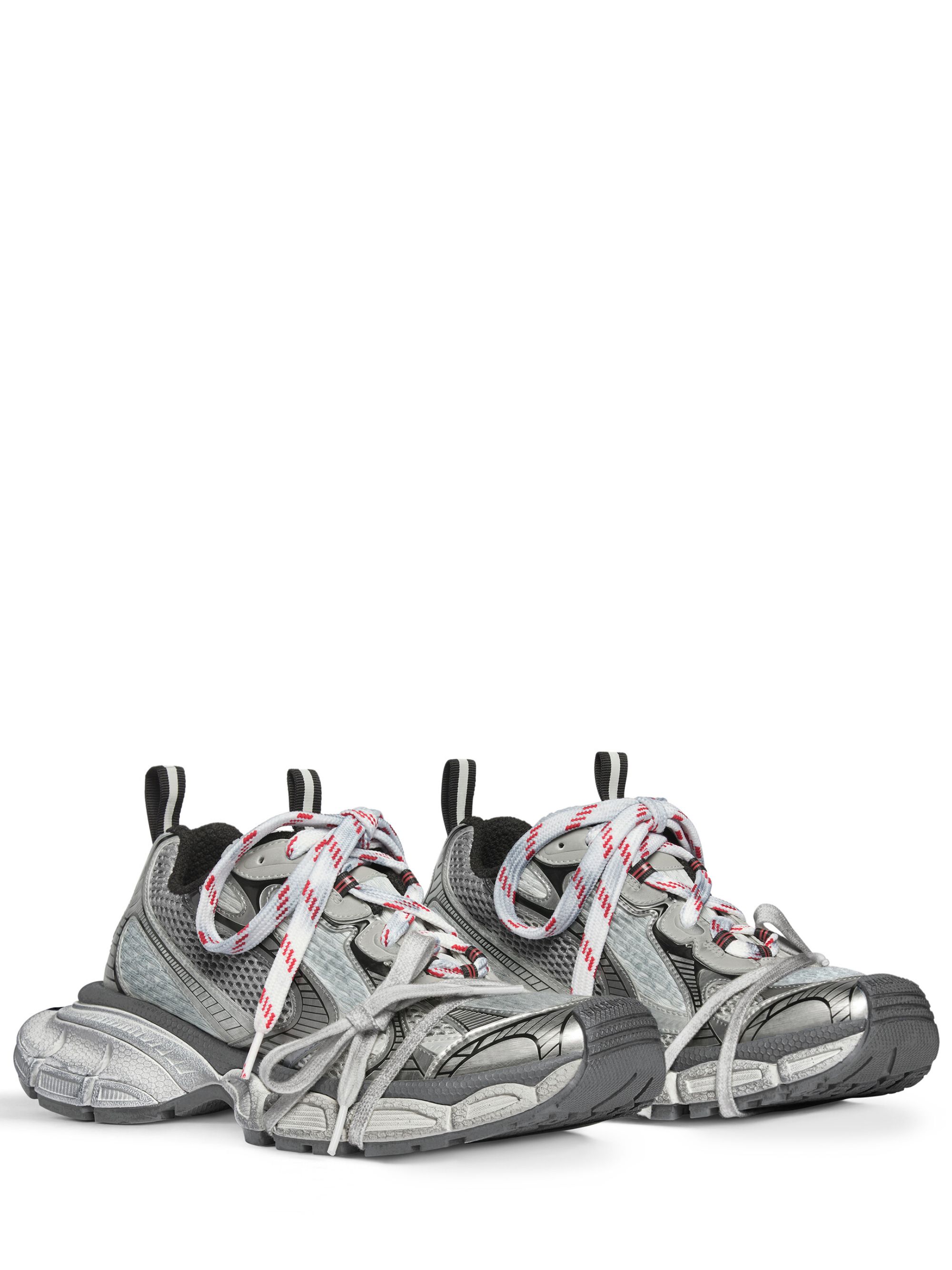 Sneaker 3XL di BALENCIAGA grigia in mesh, caratterizzata da effetto consumato, logo, branding 3XL in gomma sulla linguetta, chiusura con lacci e dettagli riflettenti.