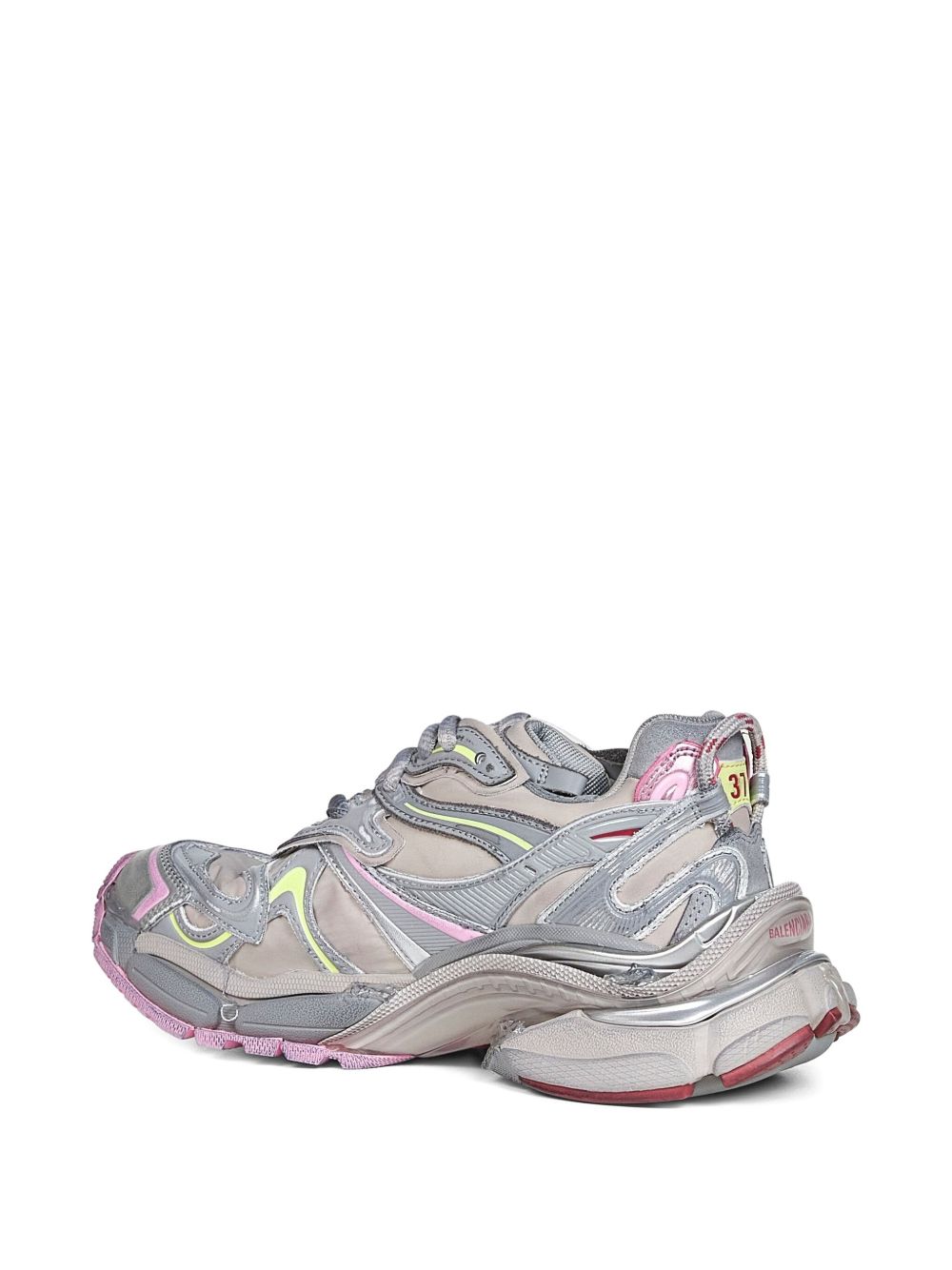 Sneaker runner 2.0 di BALENCIAGA grigia, rosa e gialla in mesh con effetto consumato, caratterizzata da taglia stampata sulla punta, logo runner stampato sul lato esterno e logo Balenciaga sulla linguetta e sul retro