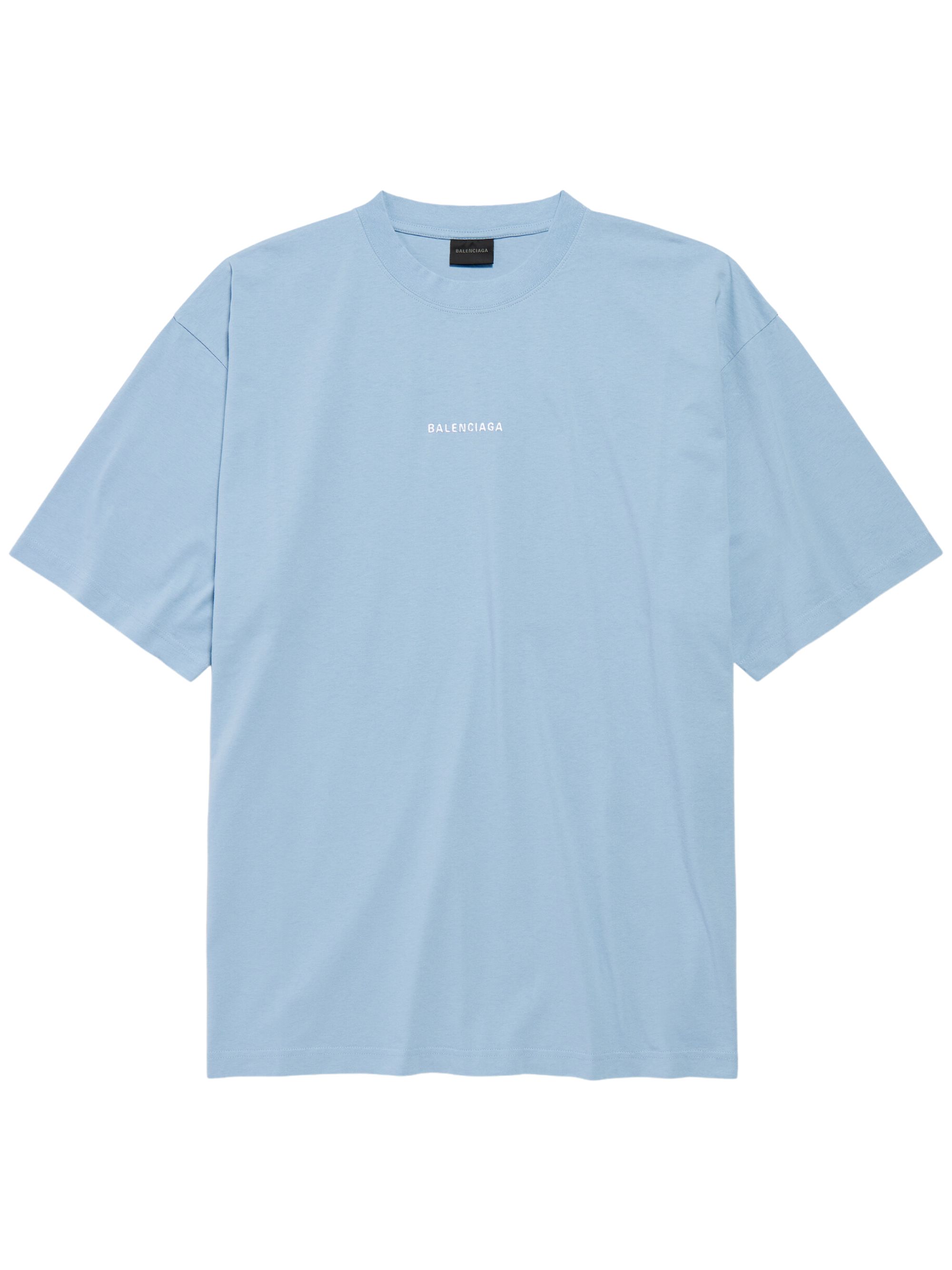 T-shirt Balenciaga Back di BALENCIAGA azzurra in cotone, caratterizzata da maniche corte, girocollo e motivo Balenciaga Back ricamato sul davanti e sul retro.