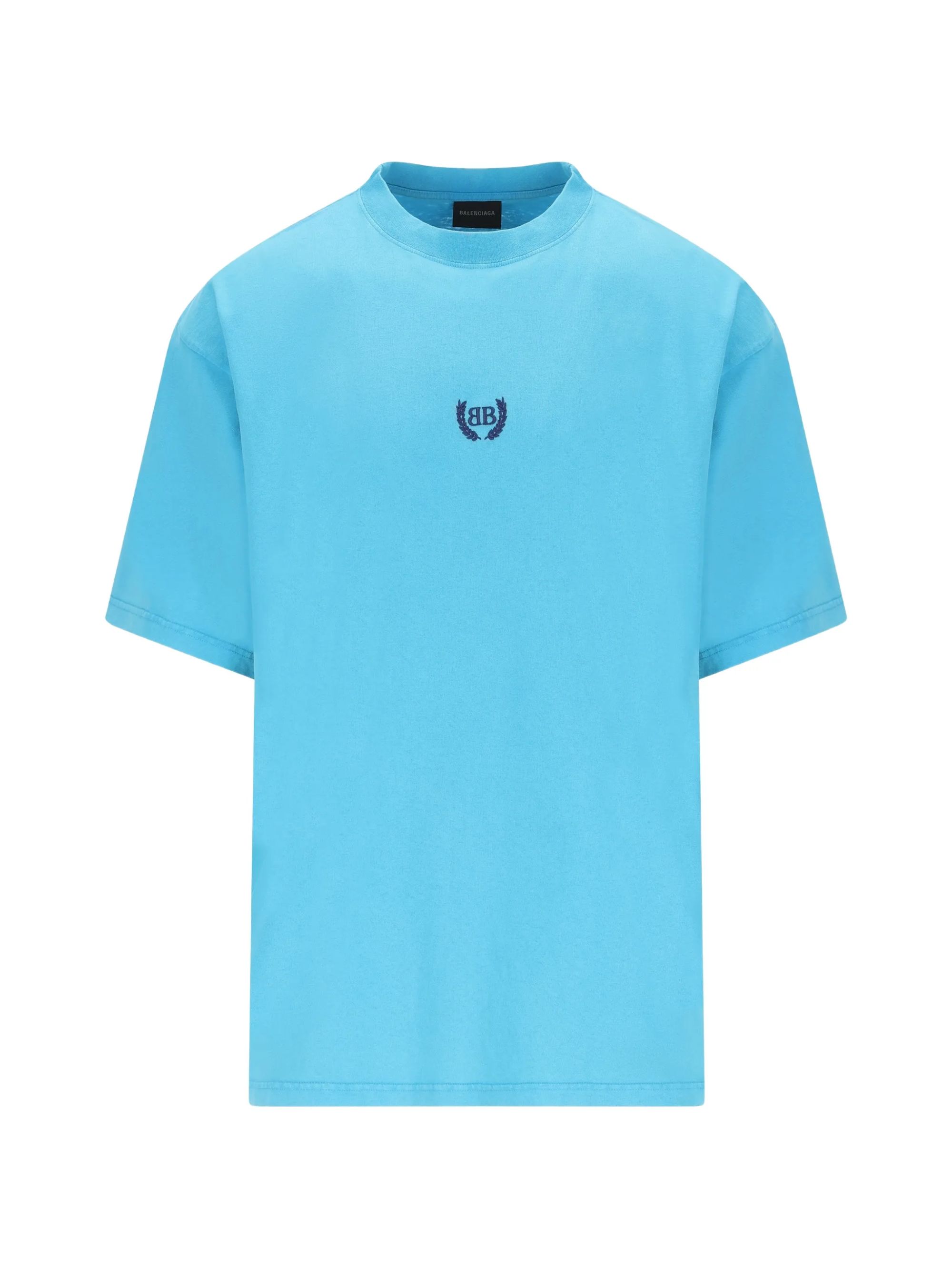 T-shirt con logo di BALENCIAGA azzurra in cotone, caratterizzata da maniche corte, girocollo e motivo laurel classic ricamato sul davanti.