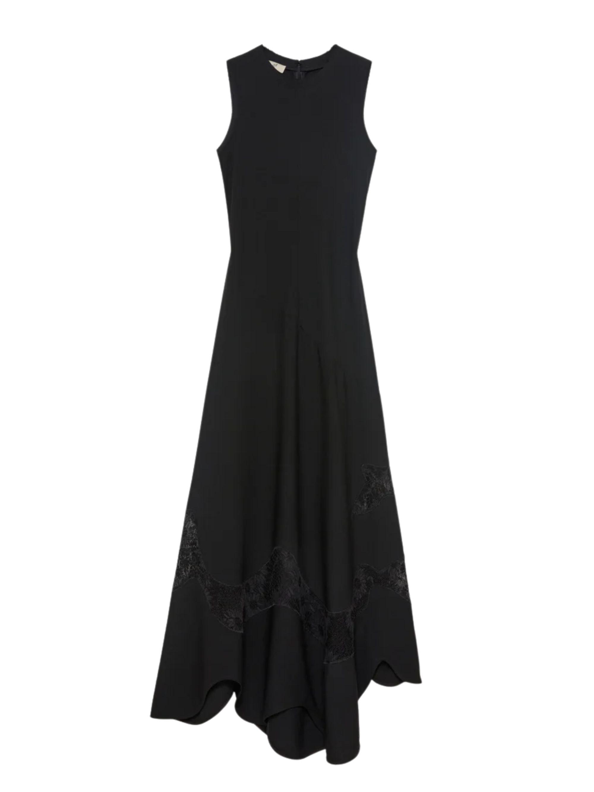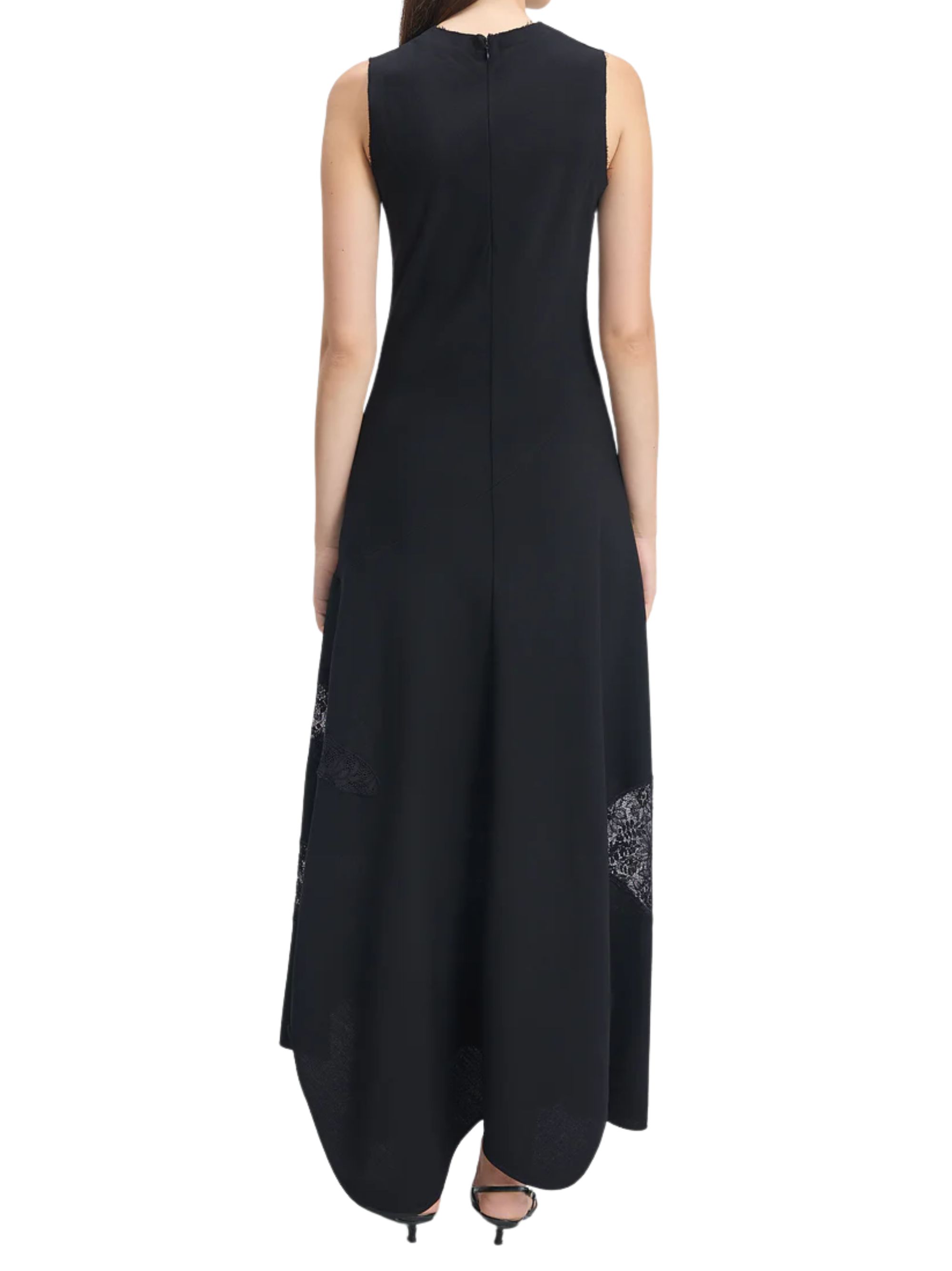 Abito Sound di BITE STUDIOS nero in lana e pizzo, caratterizzato da inserti in pizzo francese, orlo svasato e ondulato, chiusura sul retro con zip e silhouette a canotta.
