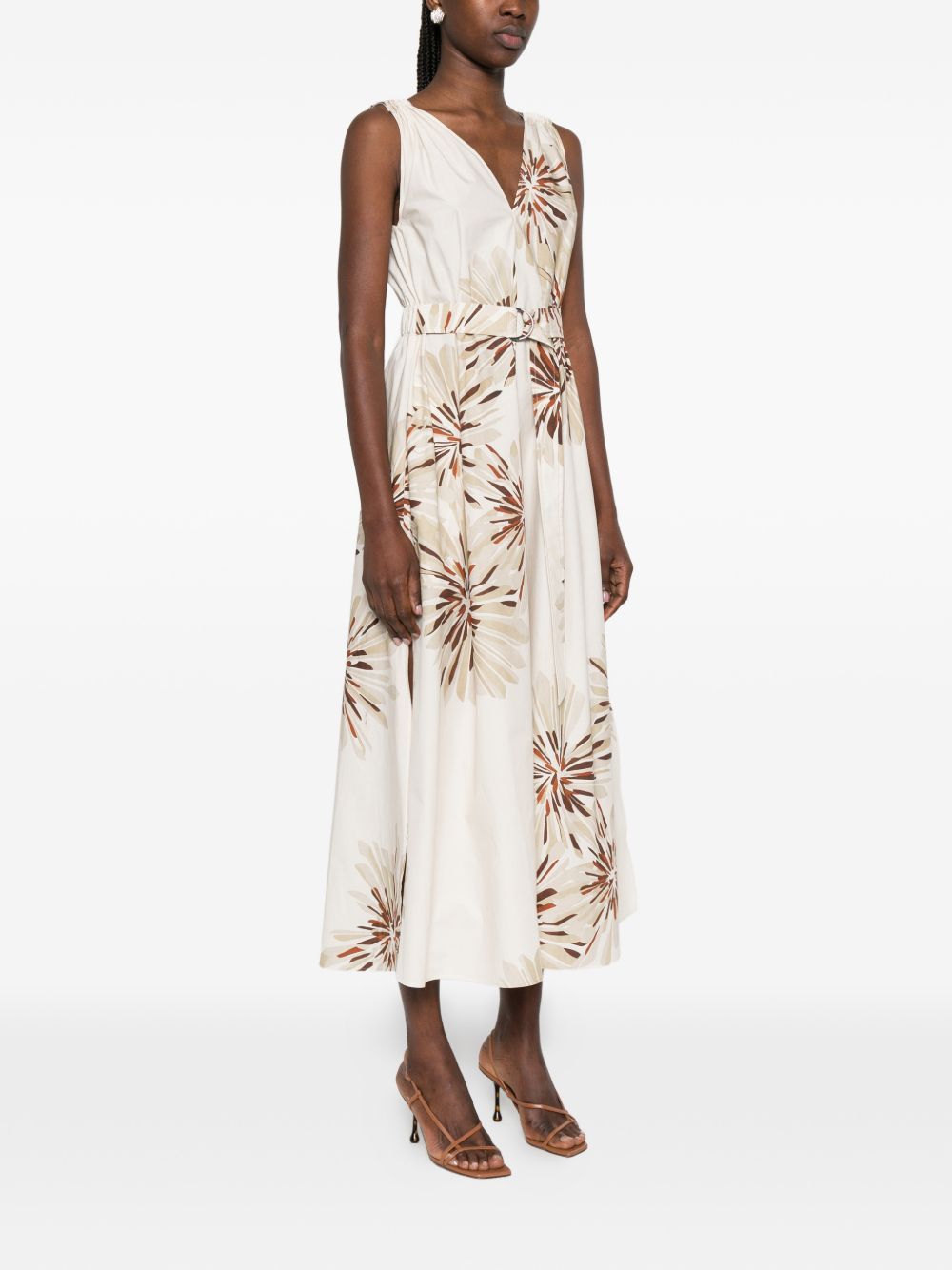 Abito con stampa floreale di BRUNELLO CUCINELLI bianco in cotone con stampa floreale marrone, scollo a V, cintura in tessuto ed elastico in vita.