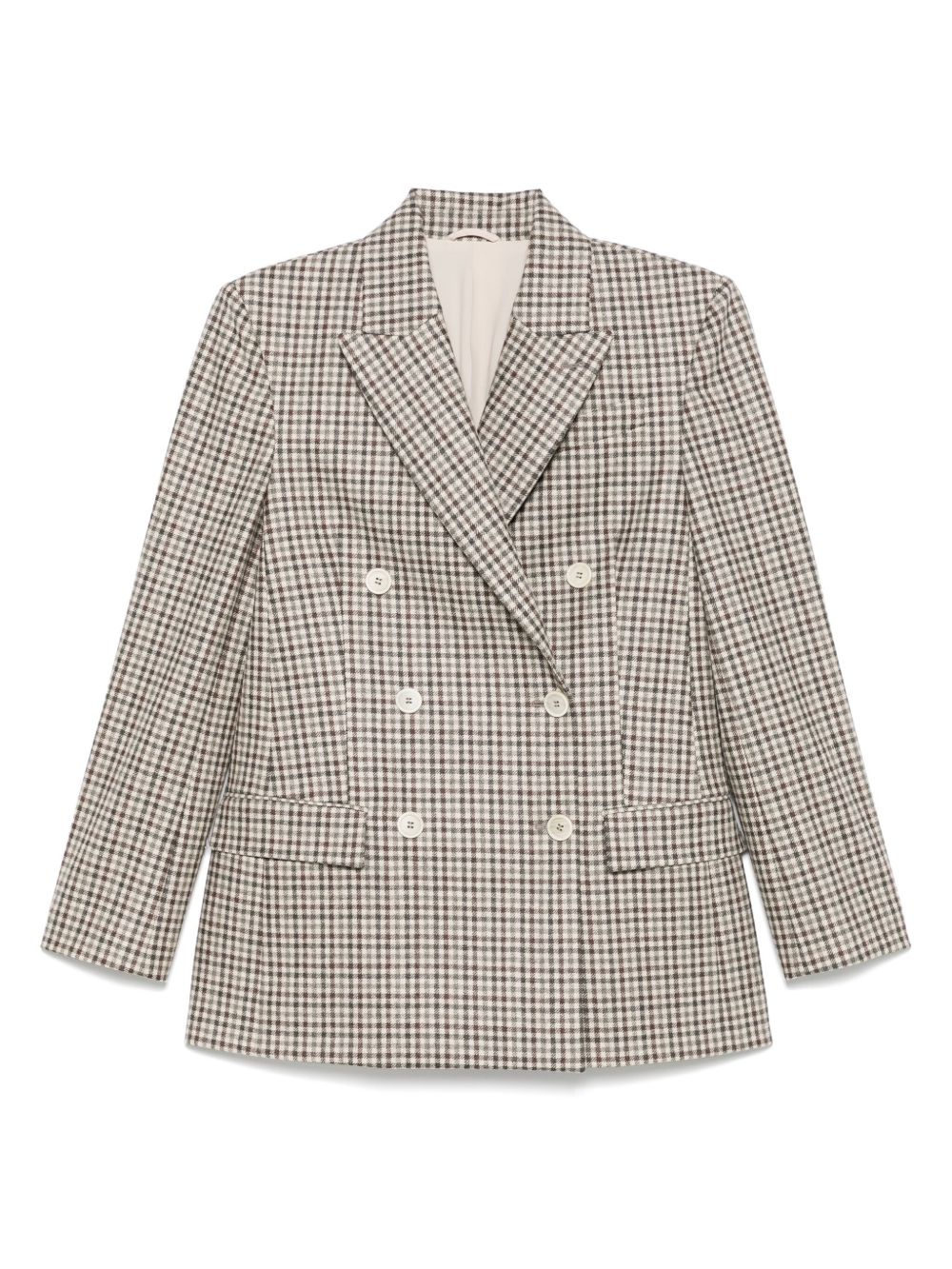 Blazer di BRUNELLO CUCINELLI beige in lana con motivo check all-over, doppiopetto, tasche e chiusura con bottoni sul fronte.