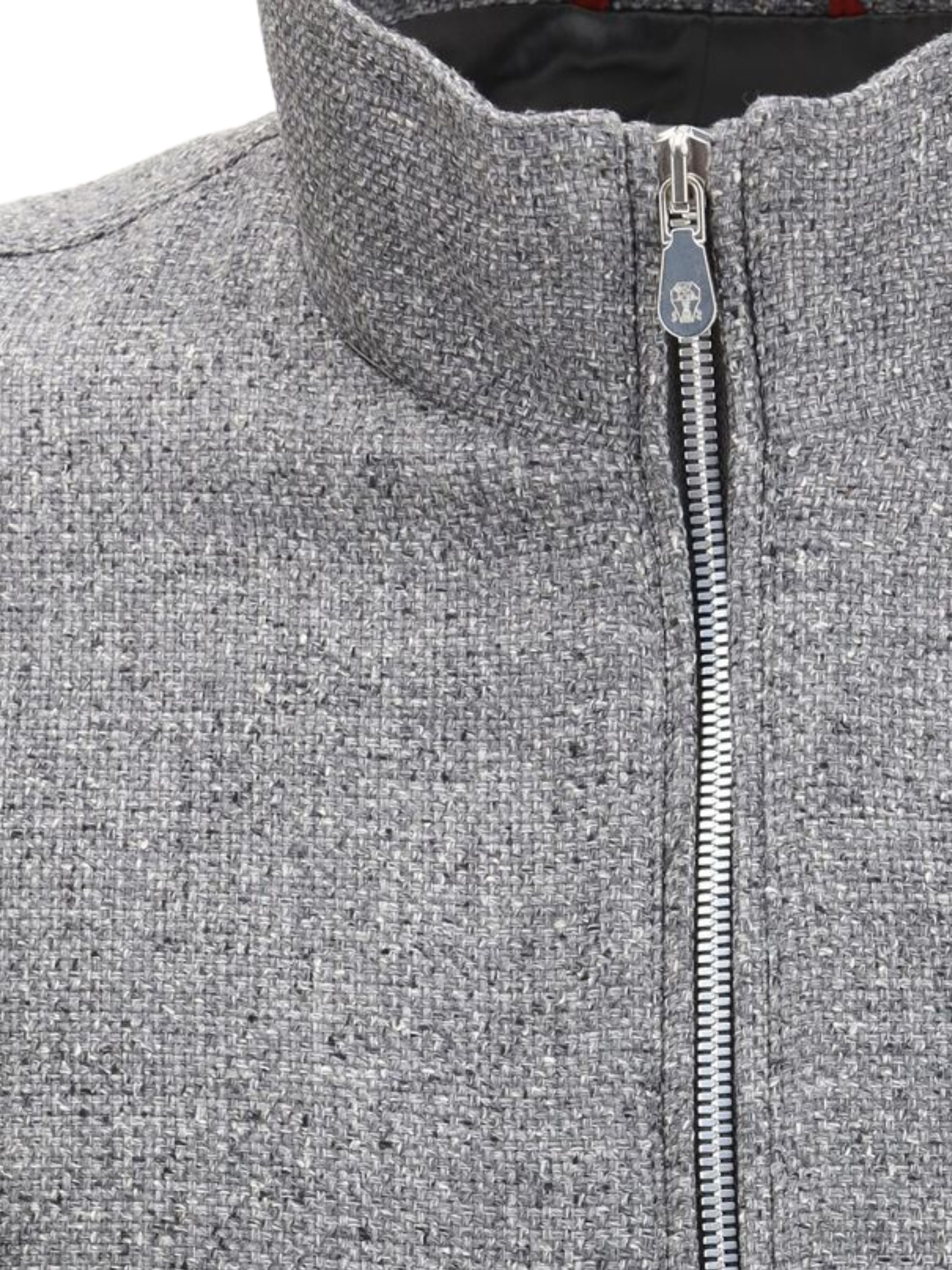 Bomber con zip di BRUNELLO CUCCINELLI grigio in lino, lana e seta, caratterizzato da collo alto, chiusura frontale con zip a doppio cursore, elastico sul fondo, tasche oblique e maniche rifinite con chiusura a bottone singolo.