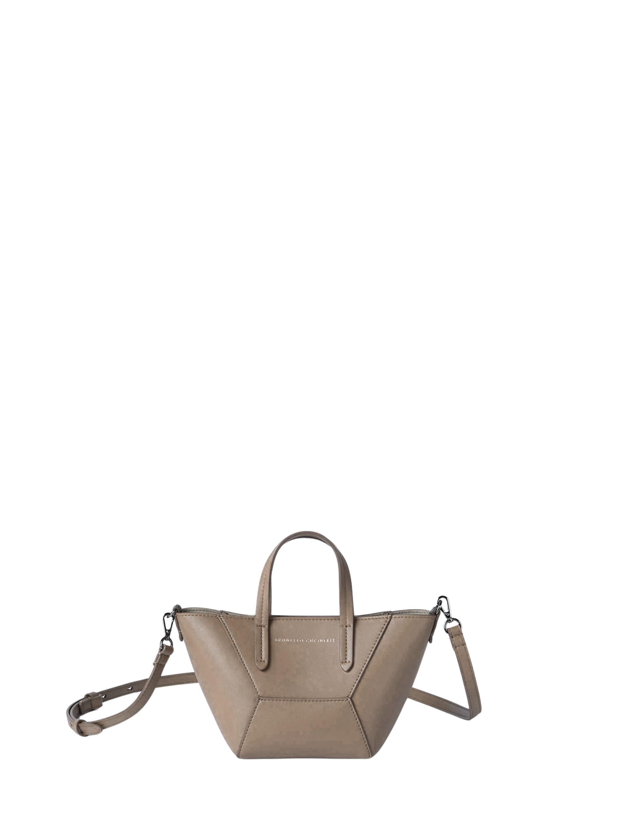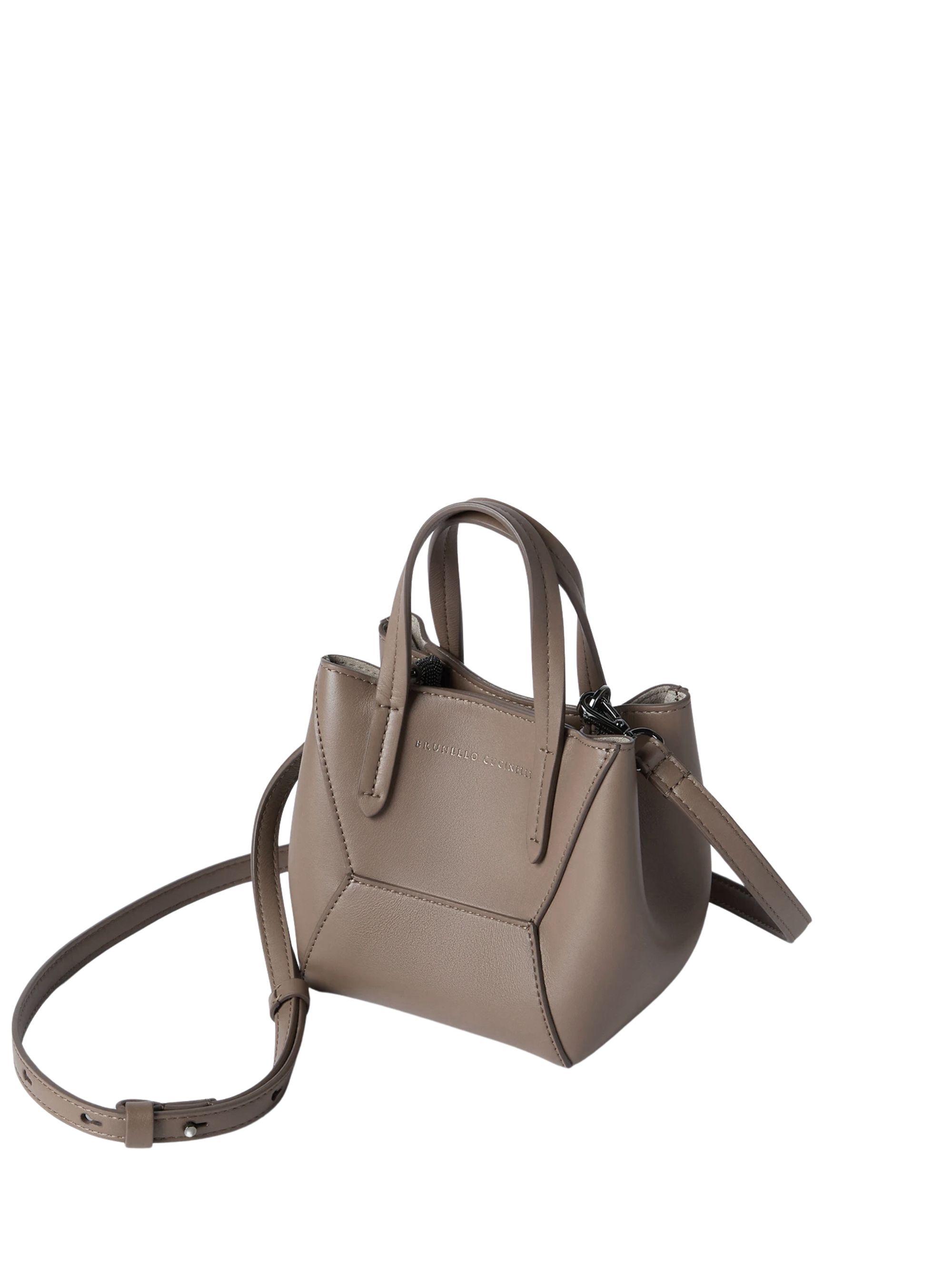 Borsa Duo mini con monile di BRUNELLO CUCINELLI tortora in pelle, caratterizzata da chiusura con calamita, tracolla regolabile e removibile, doppio manico e uno slot per carte. Dimensioni: 25 x 14 x 10 CM.