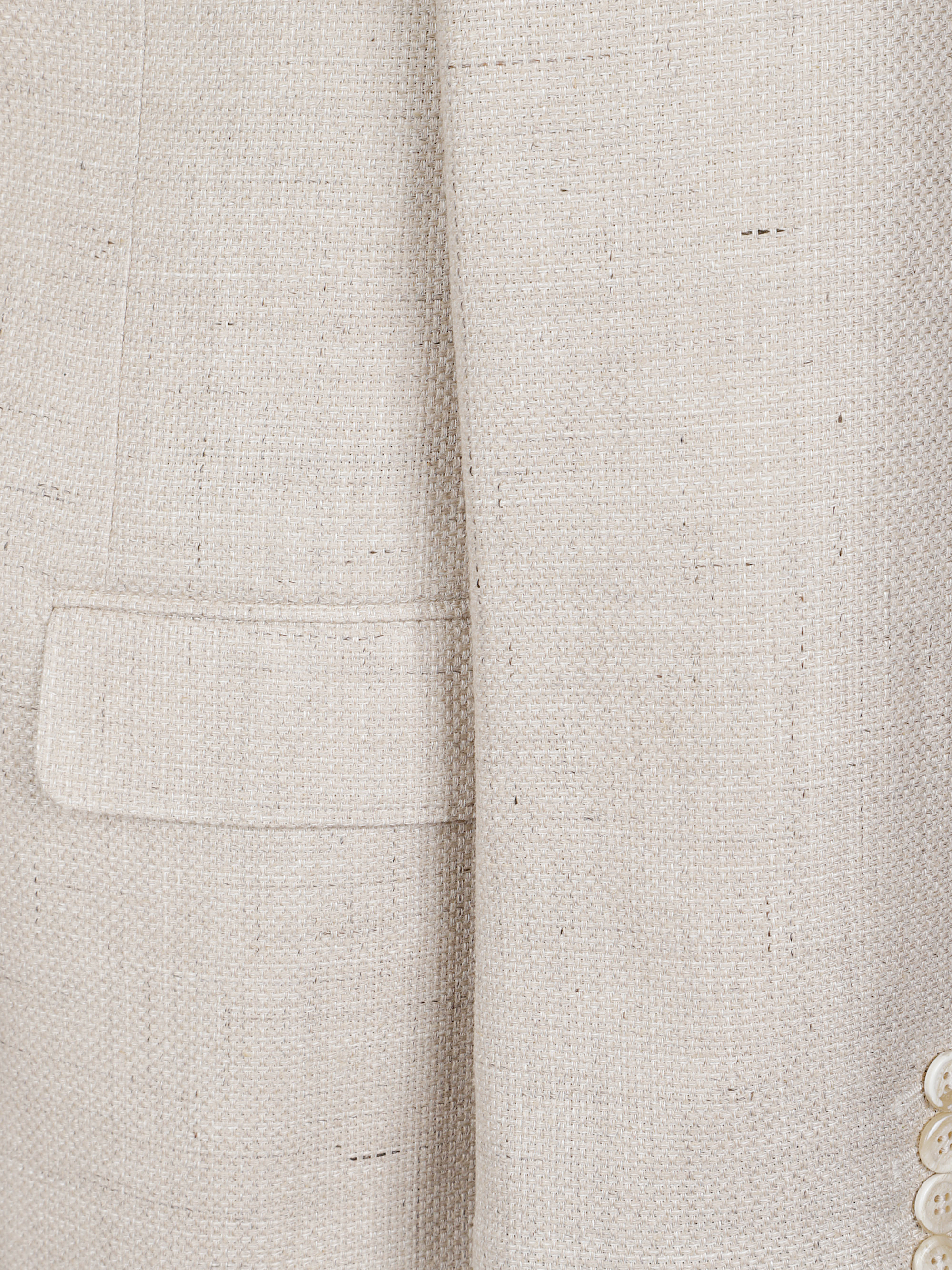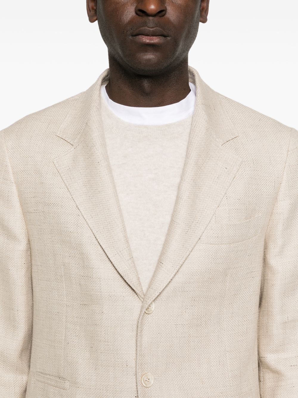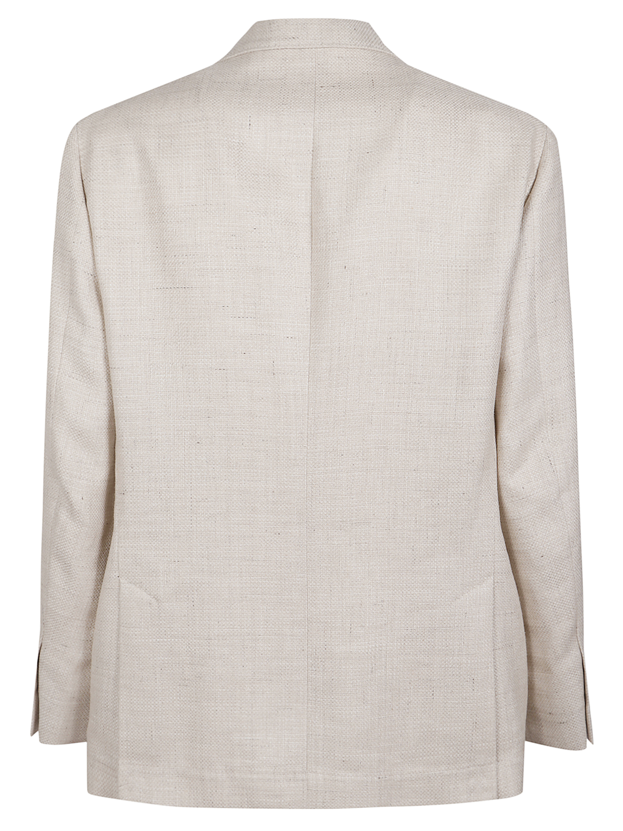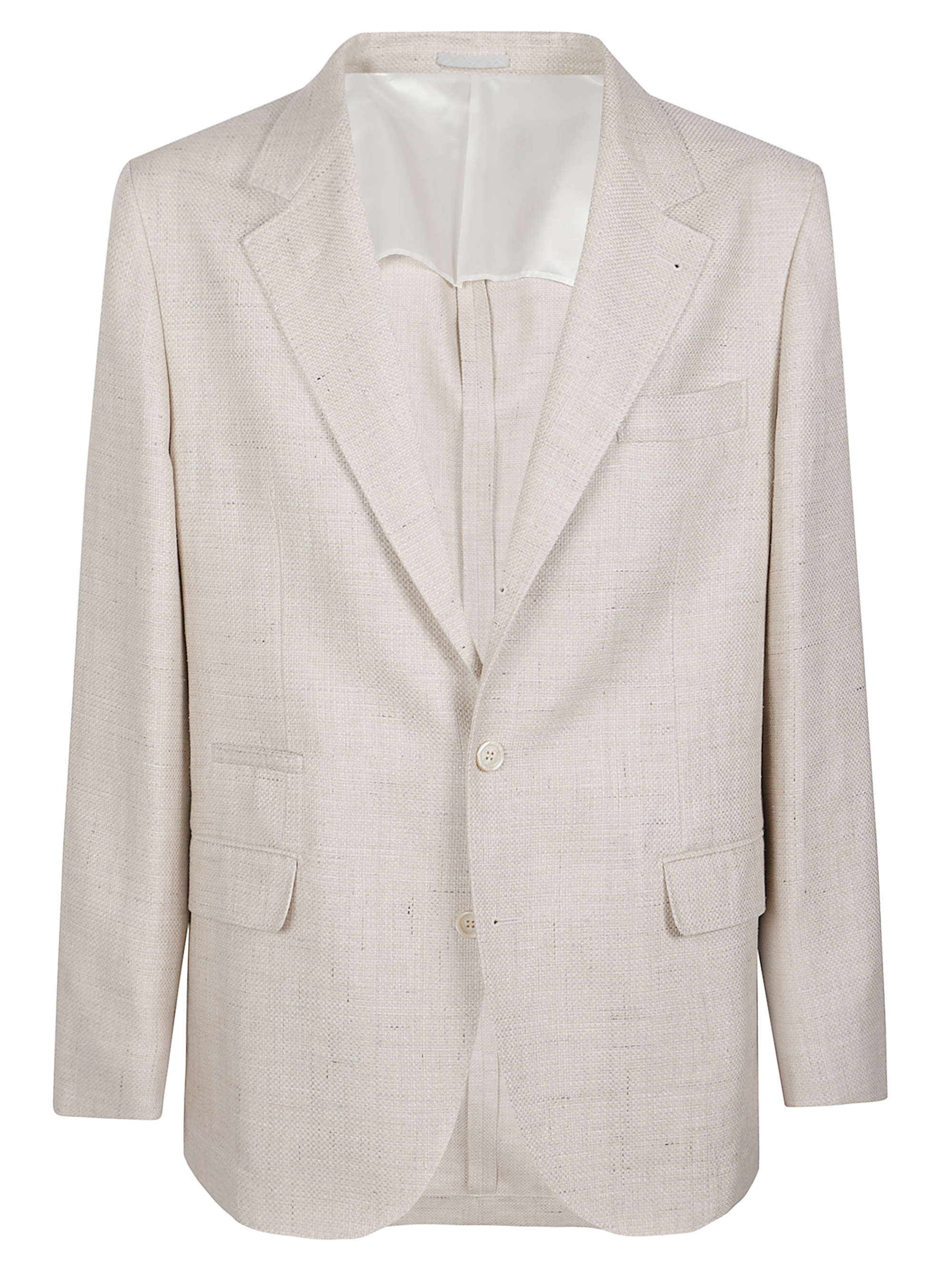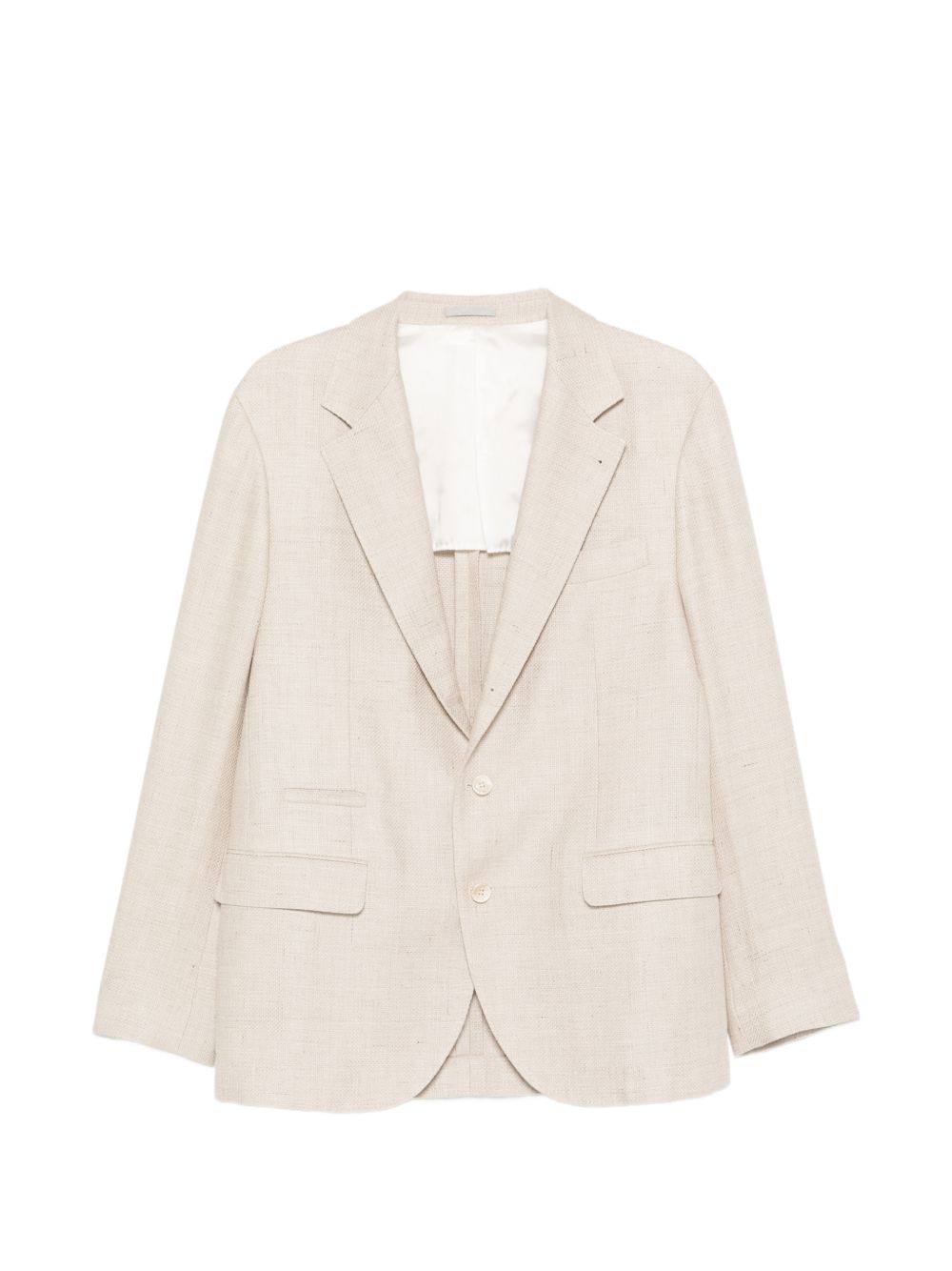 Giacca decostruita di BRUNELLO CUCINELLI beige in lana e lino, caratterizzata da chiusura monopetto con bottoni, rever classico, tasche laterali con patta, polsini con bottoni e tasca a filetto sul petto.