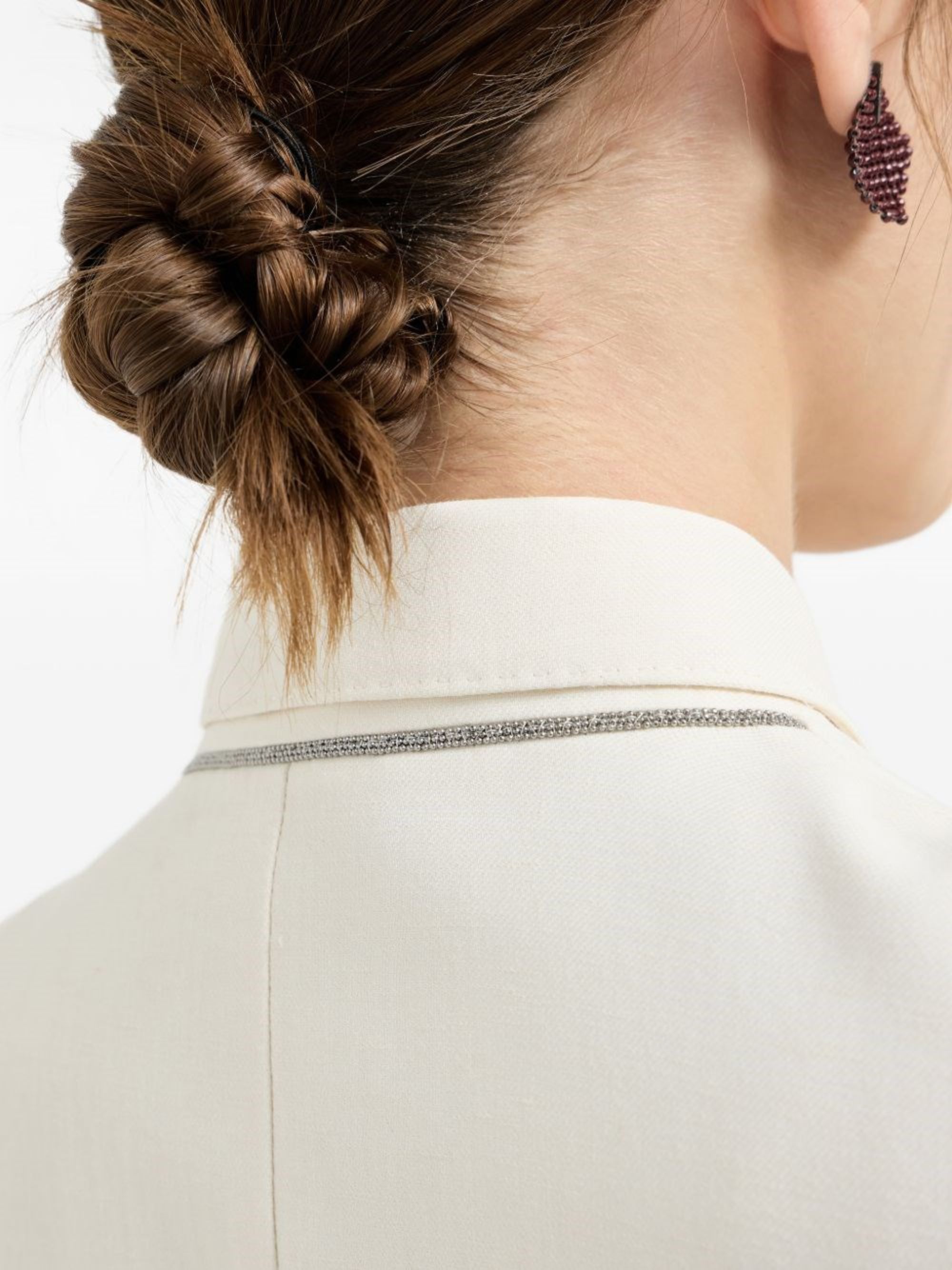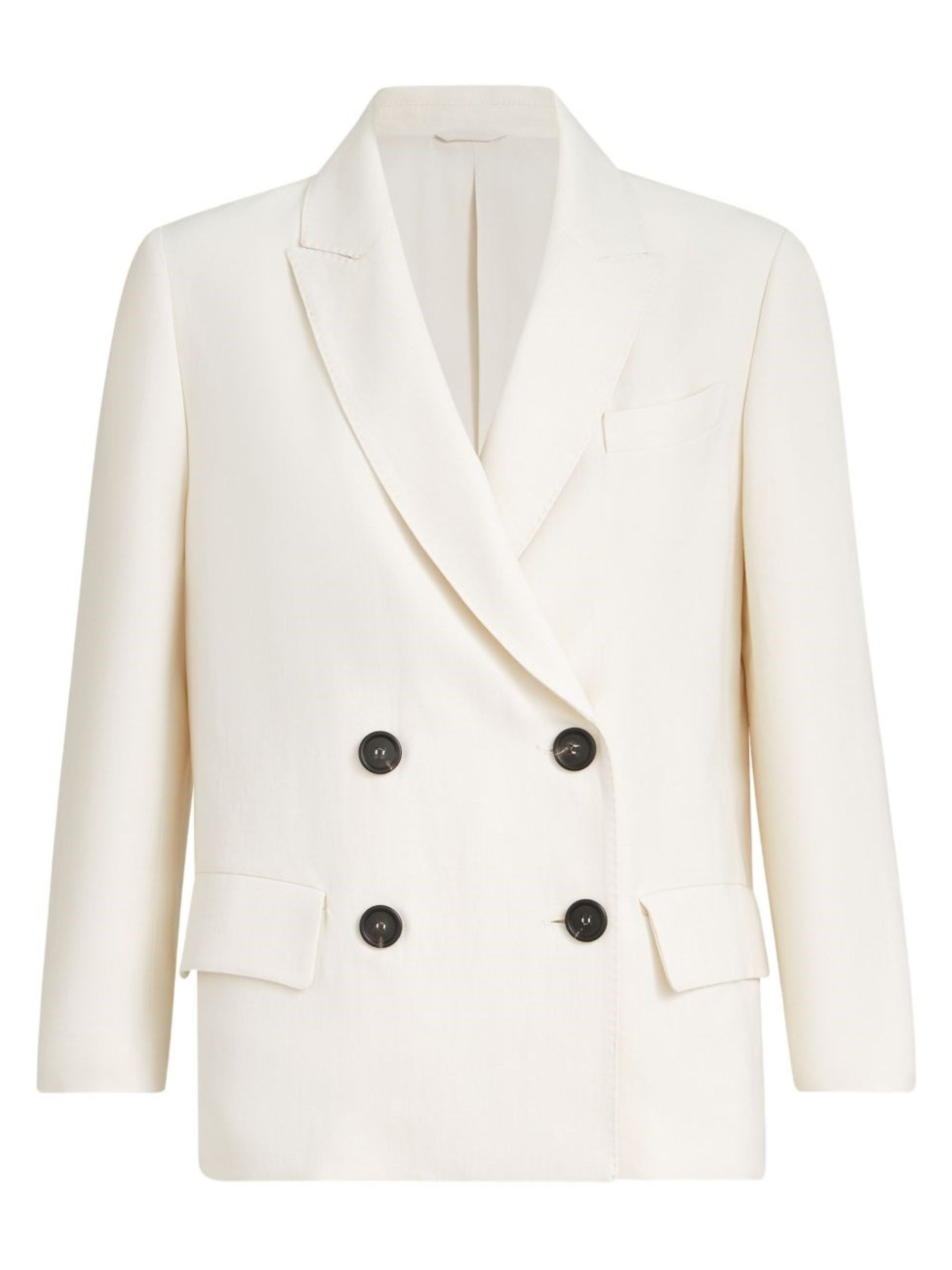 Giacca doppiopetto di BRUNELLO CUCCINELLI avorio in twill di viscosa e lino, caratterizzata da rever a lancia, chiusura a doppiopetto con bottoni, tasche frontali, taschino sul petto, maniche a tre quarti e spacco centrale sul retro.