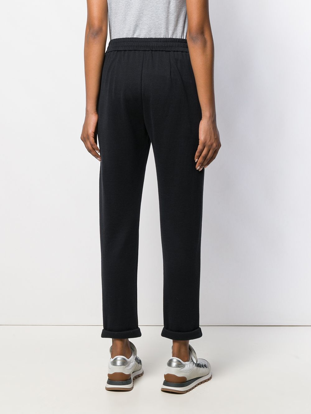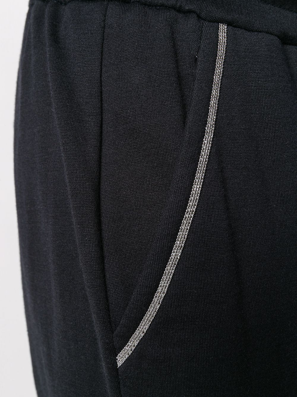 Pantalone di BRUNELLO CUCINELLI blu in cotone con elastico in vita con coulisse, cuciture tono su tono, decorazioni in monile e tasche anteriori.