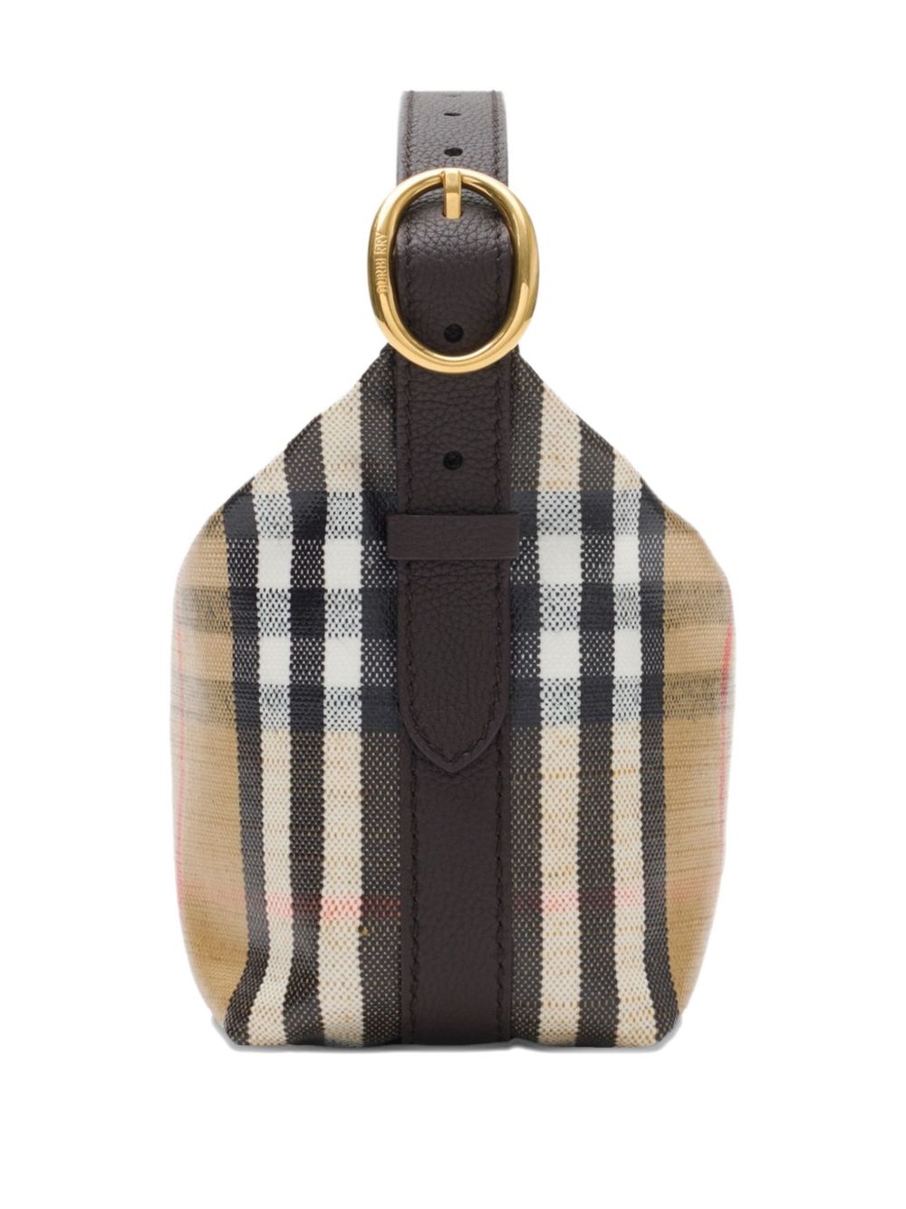 Borsa Highlands mini di BURBERRY beige in lino e cotone, caratterizzata da motivo Check, manico superiore regolabile con fibbia in metallo, logo patch sul davanti e chiusura con zip. Dimensioni: 19 x 12 x 10 cm