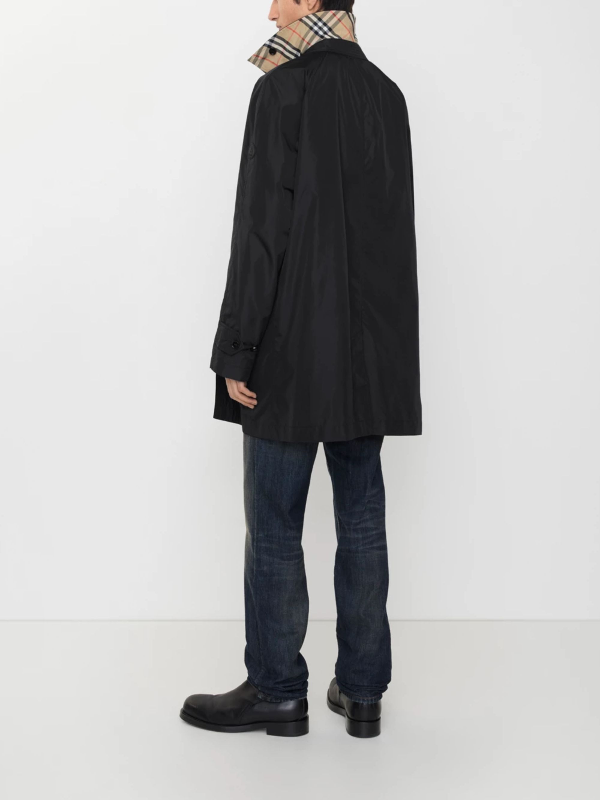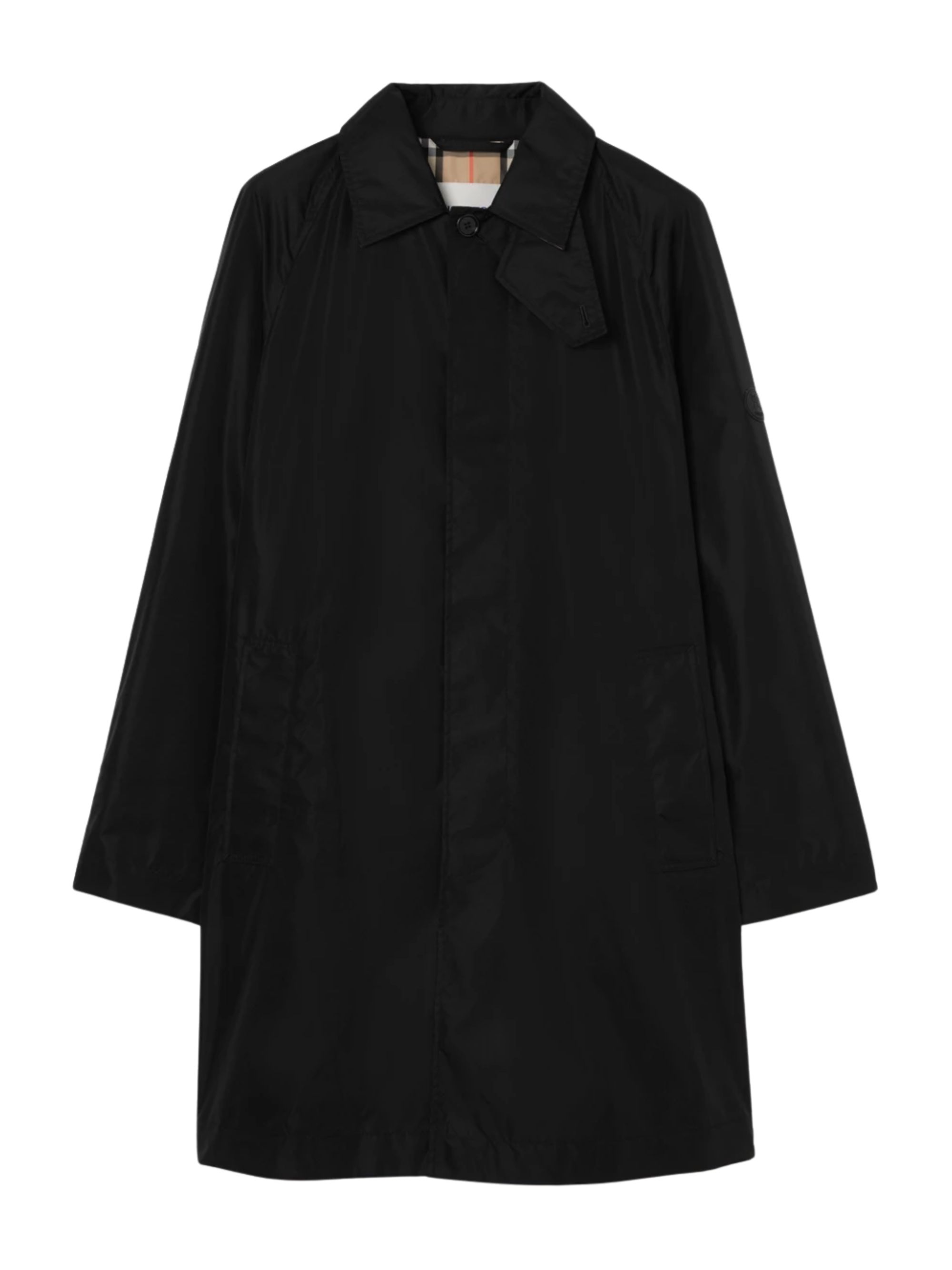 Cappotto Ridgewood Car di BURBERRY nero in nylon, caratterizzato da chiusura monopetto con bottoni, cinturino sottogola, polsini con linguette dotate di bottoni, fodera e sottocollo in Burberry Check e etichetta EKD.