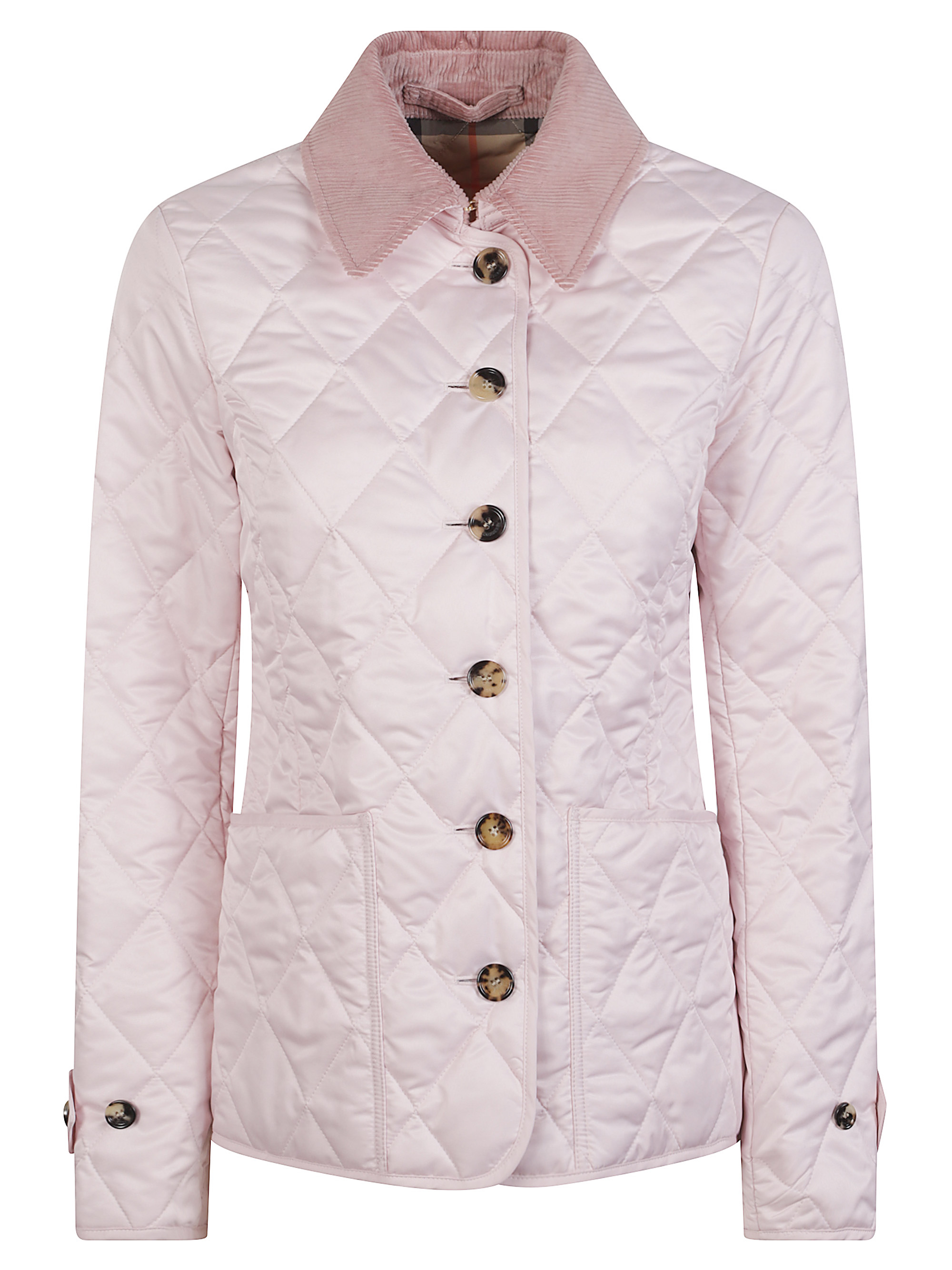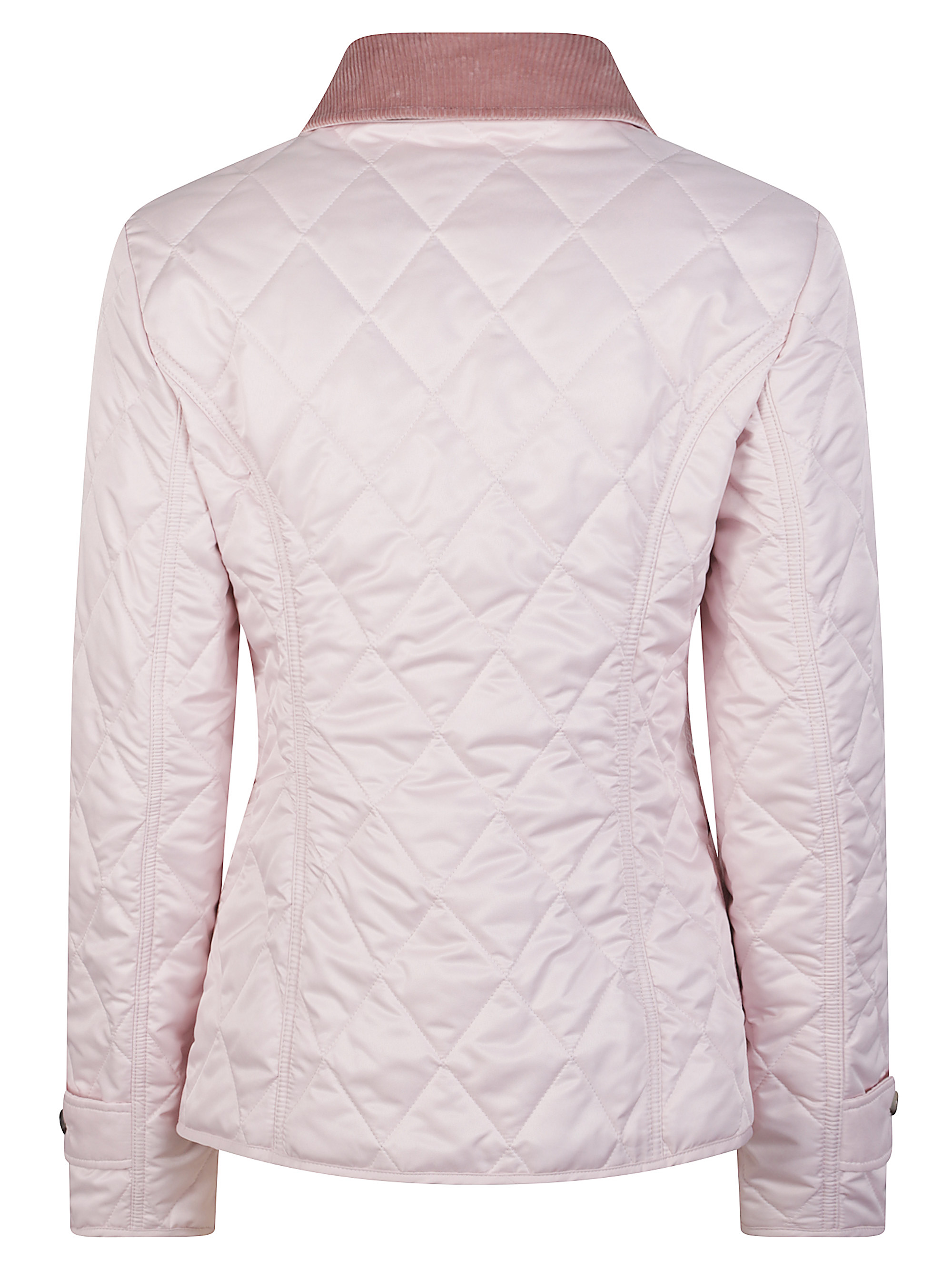 Giubbino di BURBERRY rosa caratterizzato da colletto in velluto, bottoni a contrasto, tasche applicate, interno in check e trapuntatura a rombi.