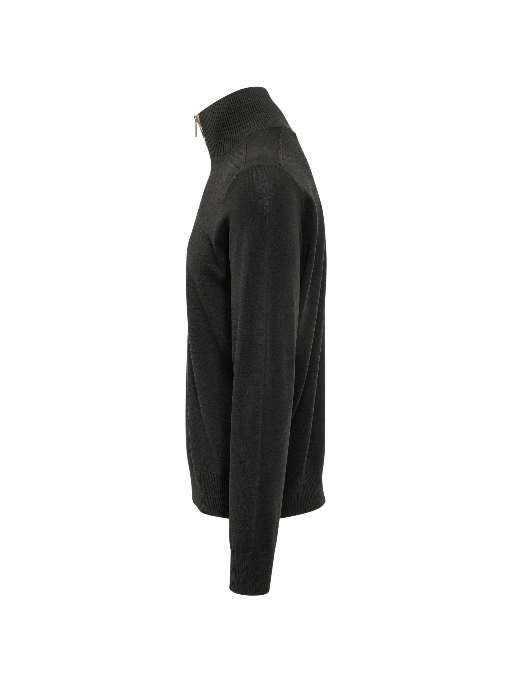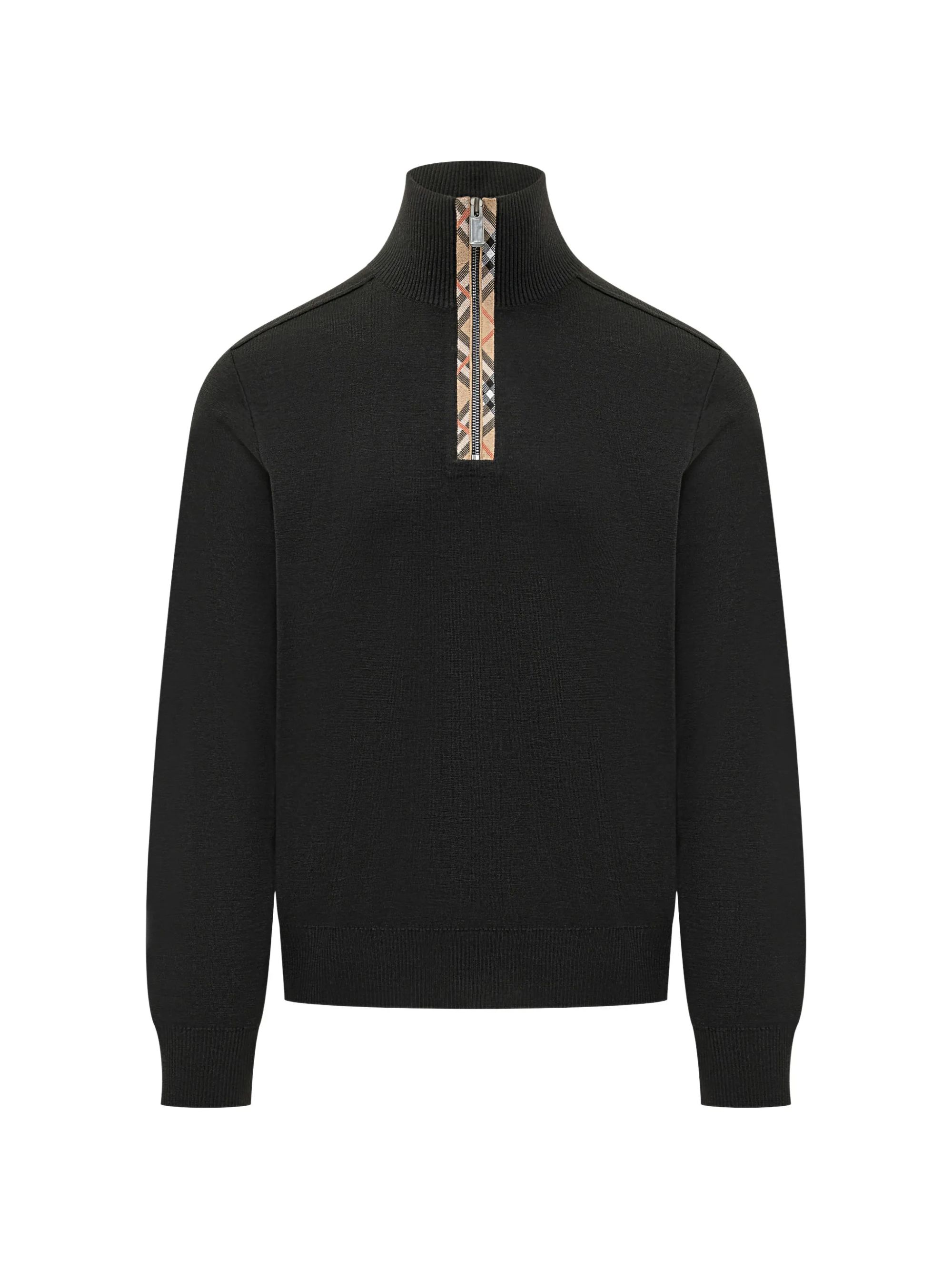 Maglione con dettaglio Check nera in lana e cotone, caratterizzato da collo alto, dettaglio Check sul fronte, maniche lunghe e orlo dritto.