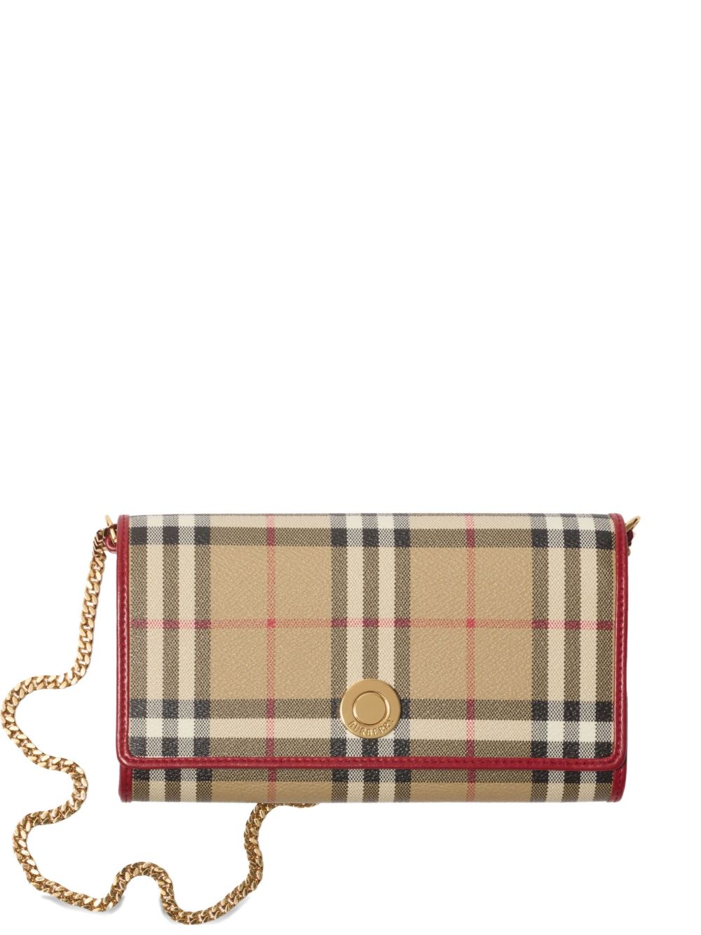 Portafoglio Check di BURBERRY beige in tessuto, caratterizzato da motivo check all-over, chiusura con patta, tracolla a catena, una tasca con zip interna, slot per carte e due scomparti interni.