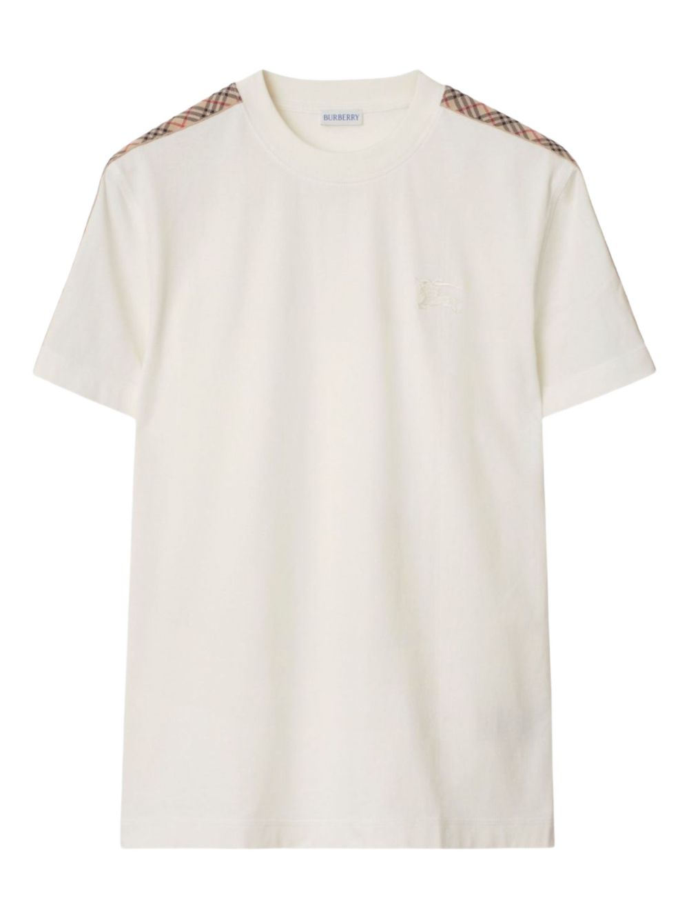 T-shirt Check di BURBERRY bianca in cotone, caratterizzata da maniche corte, dettaglio check sulle spalle e orlo dritto.