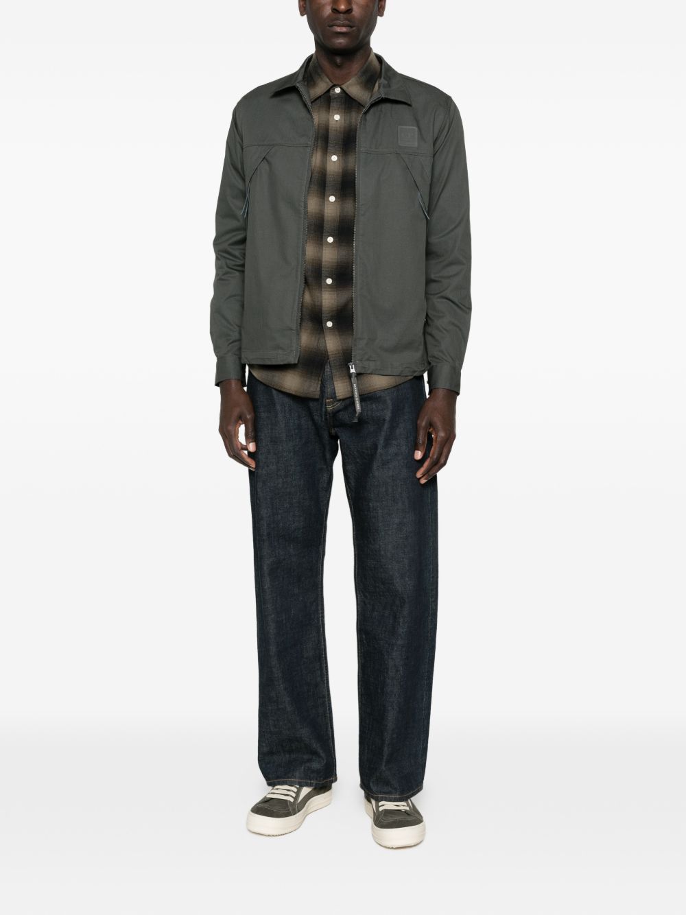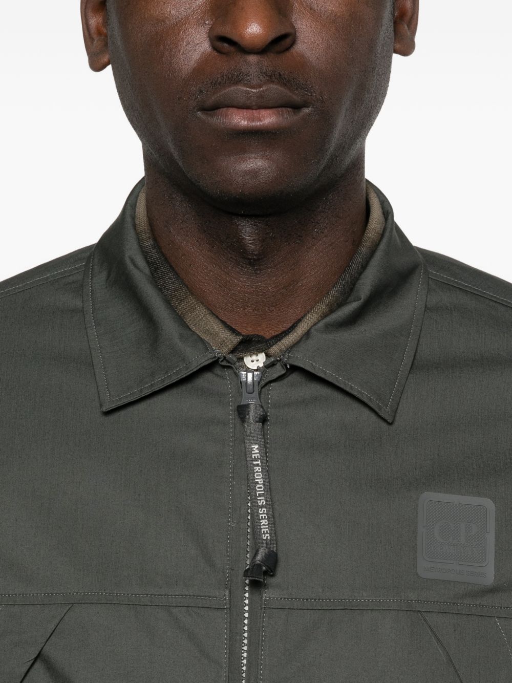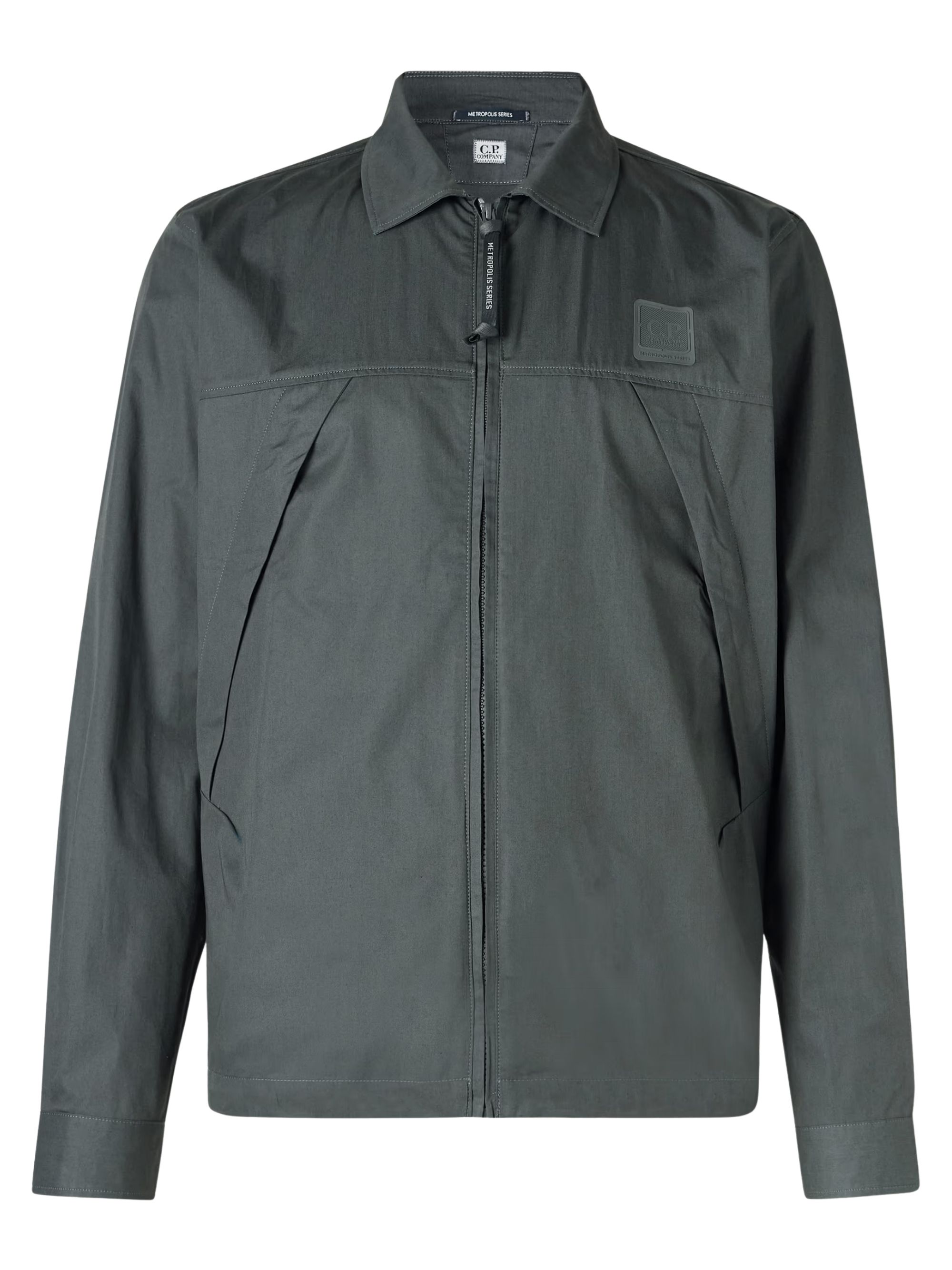 Camicia con logo Metropolis Series di C.P. COMPANY grigia in cotone, caratterizzata da colletto classico, coulisse interna in vita, chiusura con zip, logo sul fronte e due ampie tasche anteriori.