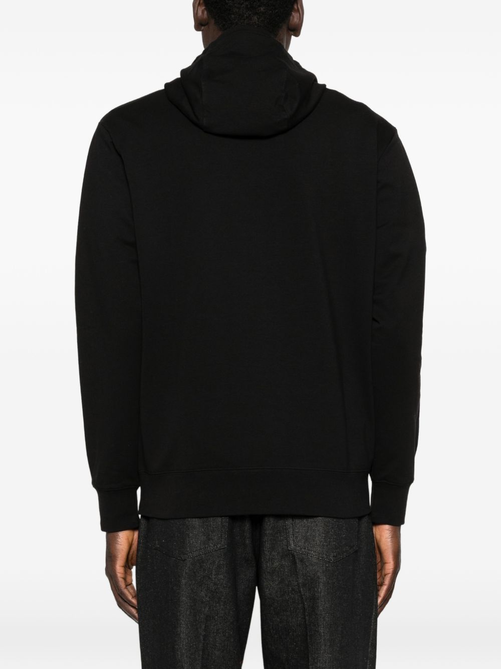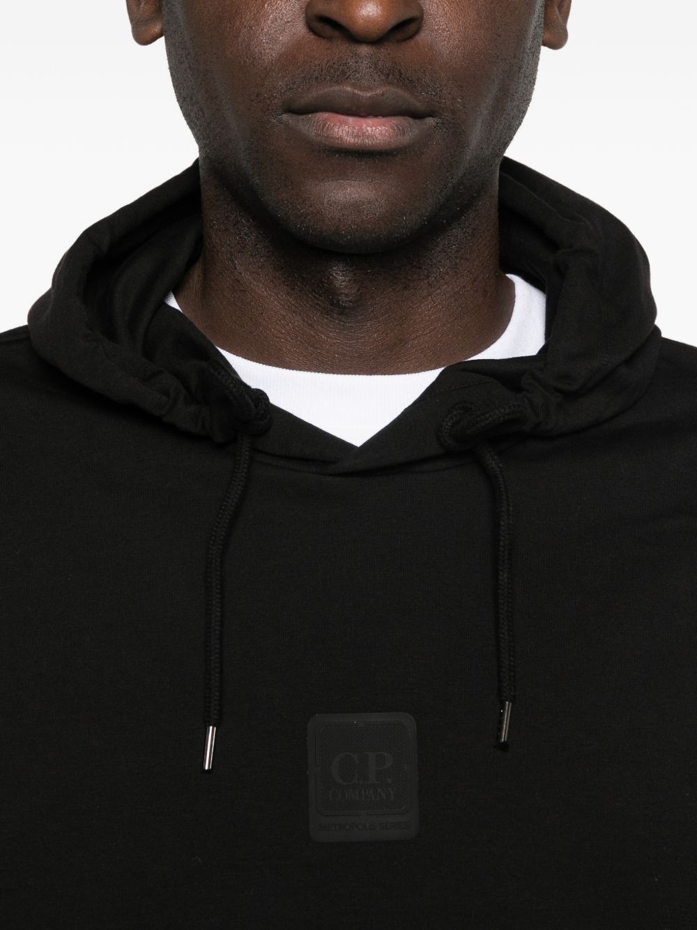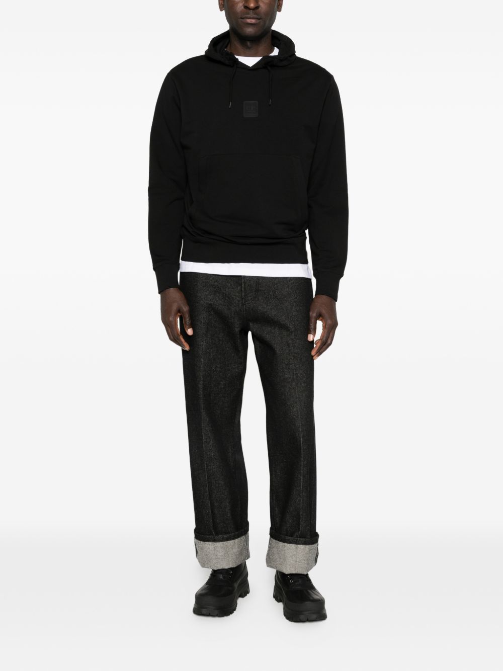 Felpa con logo di C.P. COMPANY nera in cotone, caratterizzata da cappuccio con coulisse, logo sul petto, tasca a marsupio e finiture a coste.