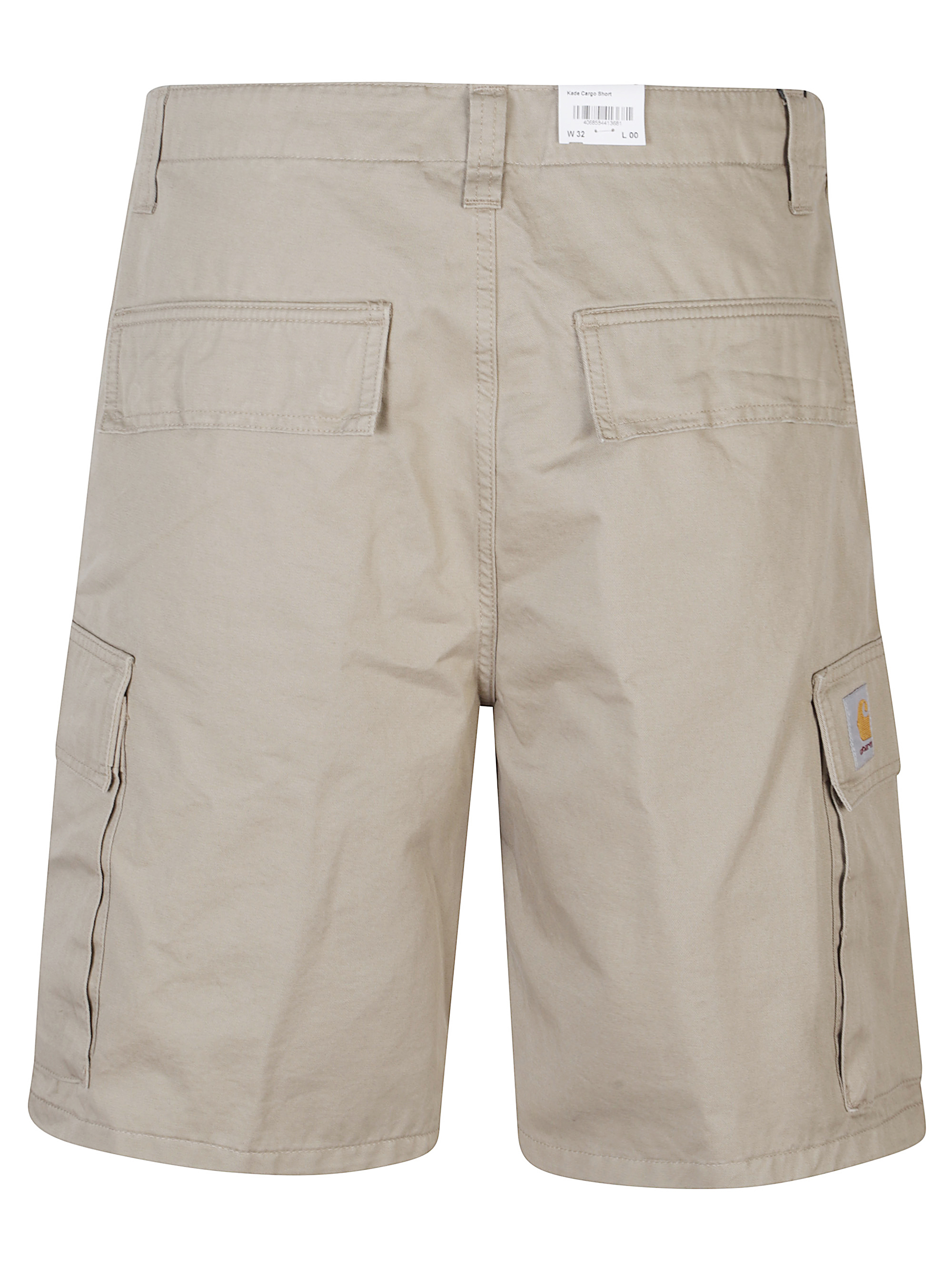 Bermuda in cotone di CARHARTT WIP beige, caratterizzata da chiusura con zip e bottone, passanti per cintura, due tasche con patta laterali e patch logo sul retro.